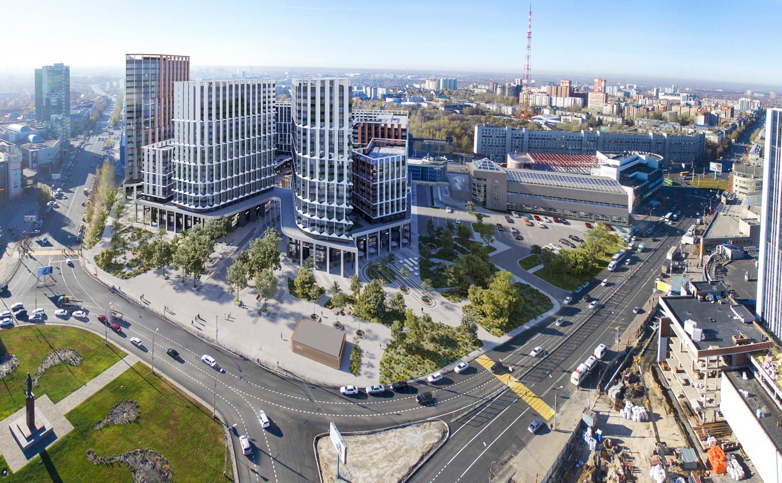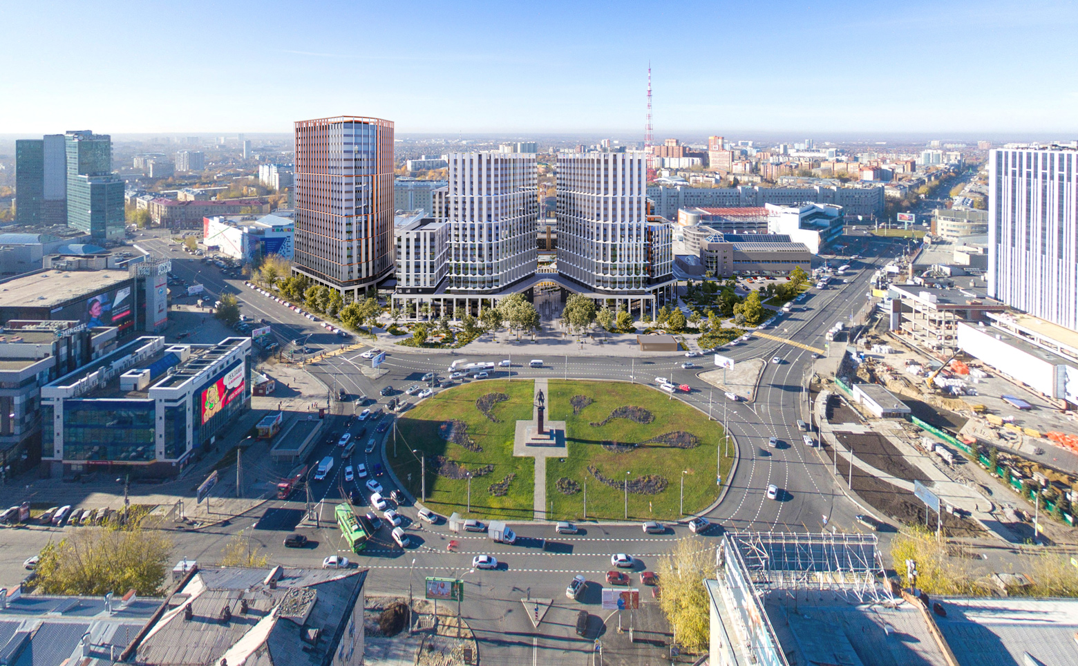 Проект расположен на площади Маркса, которая окружена крупными магистралями и связана с правым берегом проспектом Карла Маркса и Октябрьским мостом. Дорога до станции метро Площадь Маркса и торговых центров занимает 5 минут пешком. До центра города и площади Ленина можно добраться за 15 минут транспортом.
