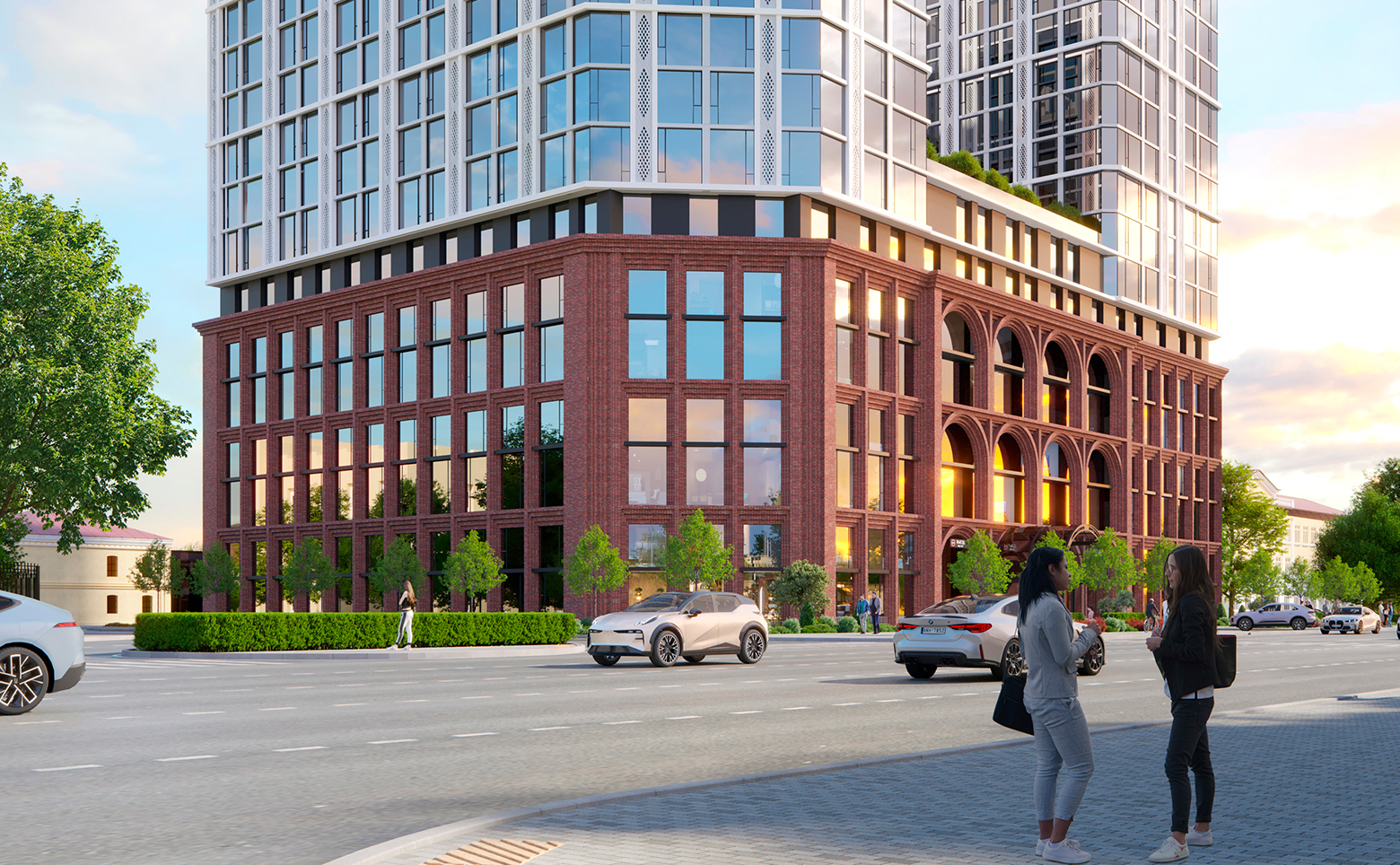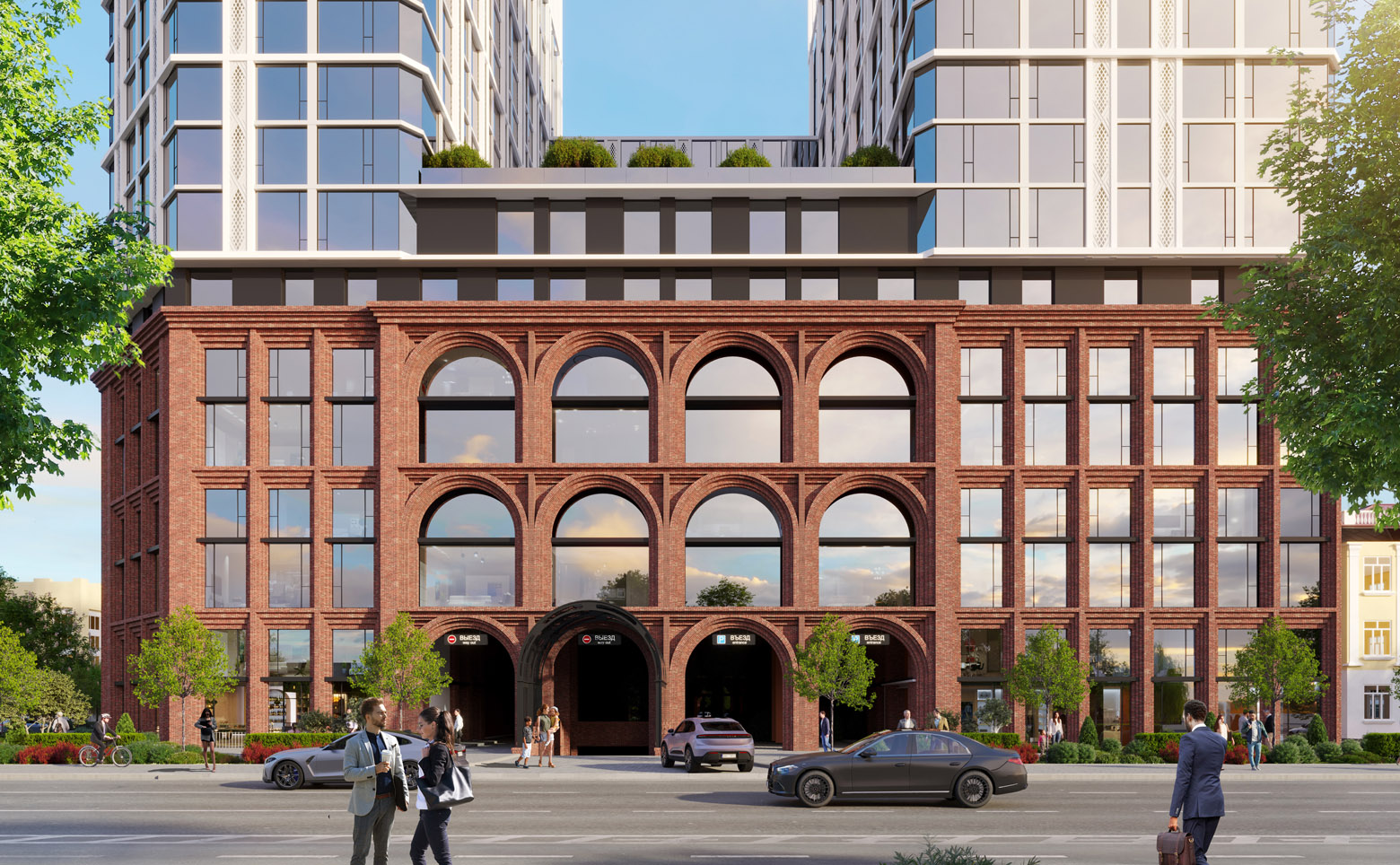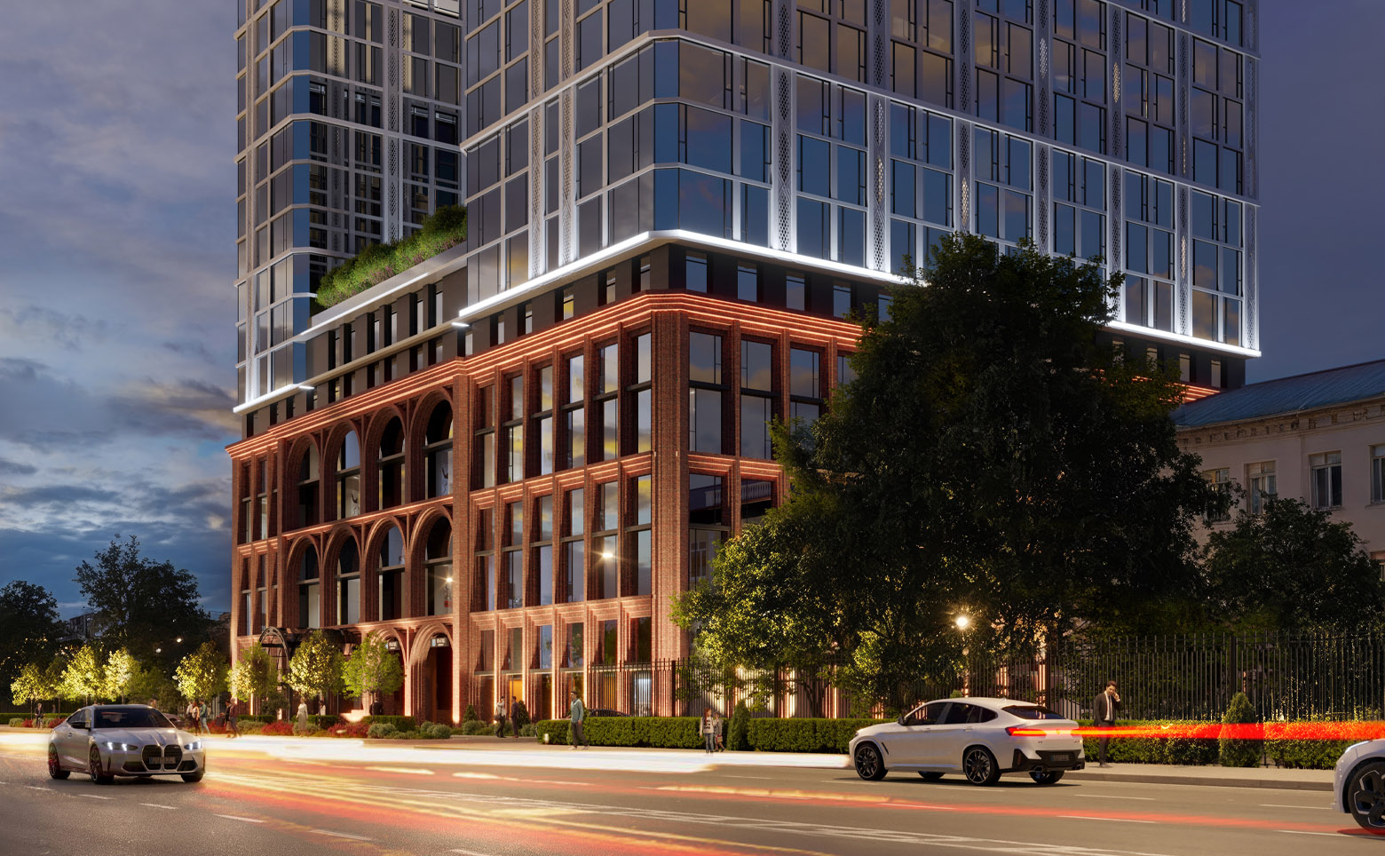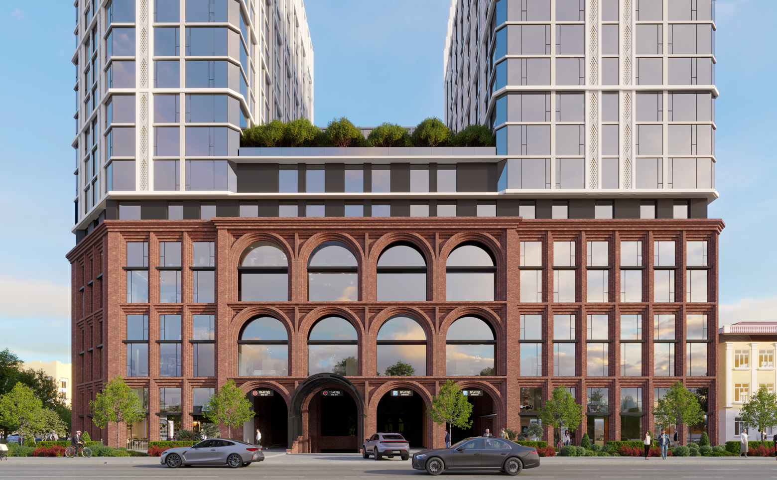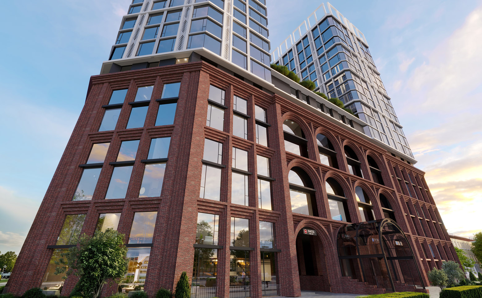 Проект представляет собой премиальный многофункциональный комплекс высотой 19 этажей. Здание состоит из 2 башен, объединенных стилобатной частью; на уровне девятого этажа предусмотрен парк. Комплекс возводится по монолитной технологии с комбинированными фасадами: первые 6 этажей выполнены из кирпича ручной формовки с арочными фасадами, выше расположены башни с панорамным остеклением. Входные группы выполнены с дизайнерской отделкой, установлены современные скоростные лифты.
