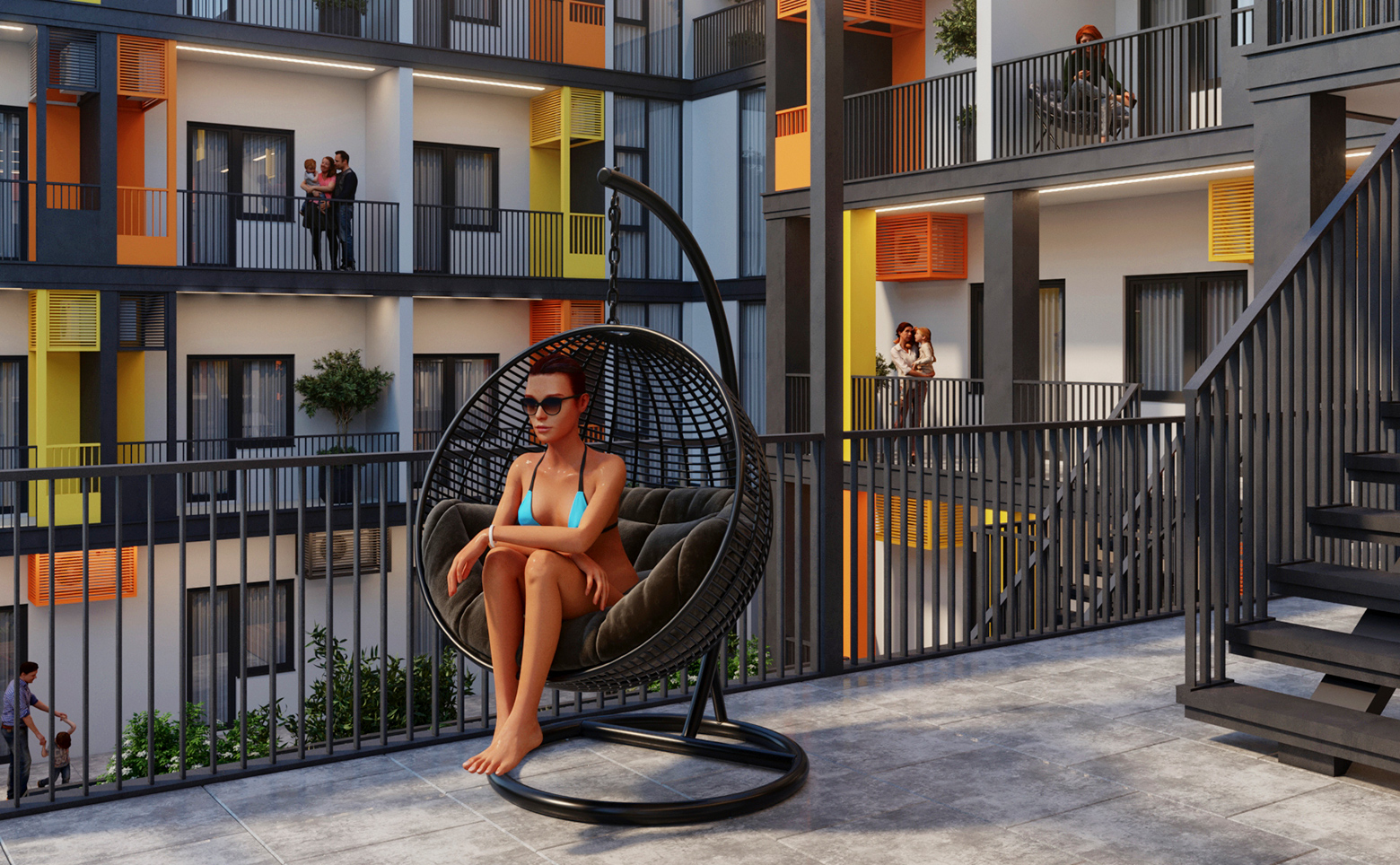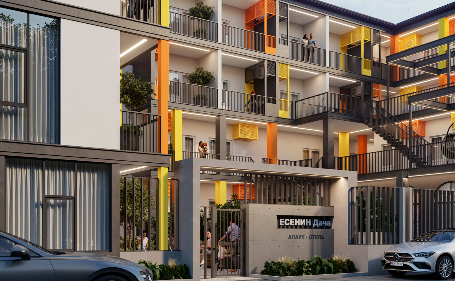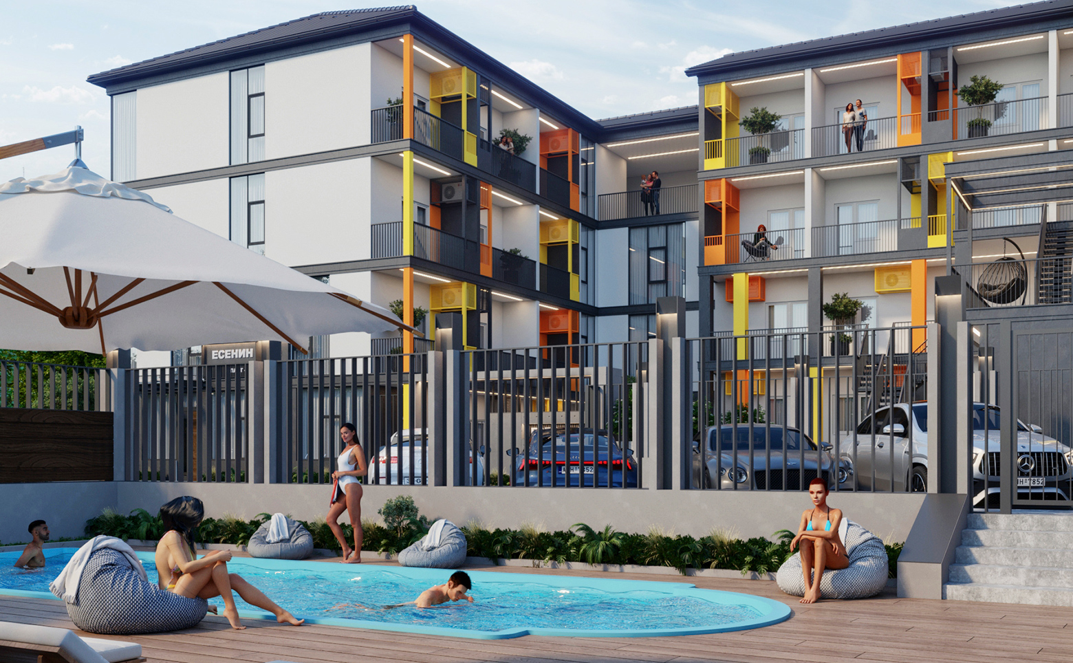 Территория комплекса занимает почти 1 000 кв. м и организована для отдыха и досуга. Проект включает бассейн с шезлонгами и зонами релакса. Дополнительно обустроены модульная баня, массажный кабинет, барбекю-зона, детская площадка, придомовой паркинг, а также открытый кинотеатр, лобби-бар и кафе. Такое оснащение делает объект комфортным для жизни и привлекательным для туристов.