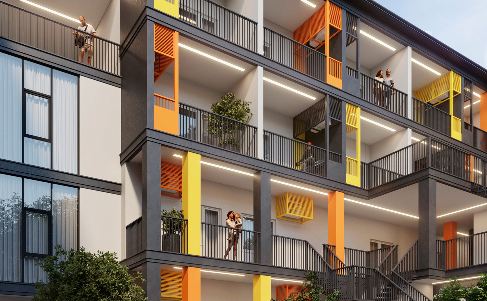 Здания выполнены по монолитной технологии с комбинированными фасадами. Комплекс включает 2 корпуса высотой 3 и 4 этажа. В апартаментах предусмотрены как стандартные, так и панорамные окна, из которых открываются виды на море и горы. Высота потолков составляет 3 метра. Для автомобилистов организована стоянка.