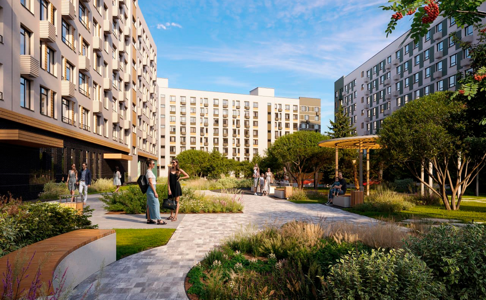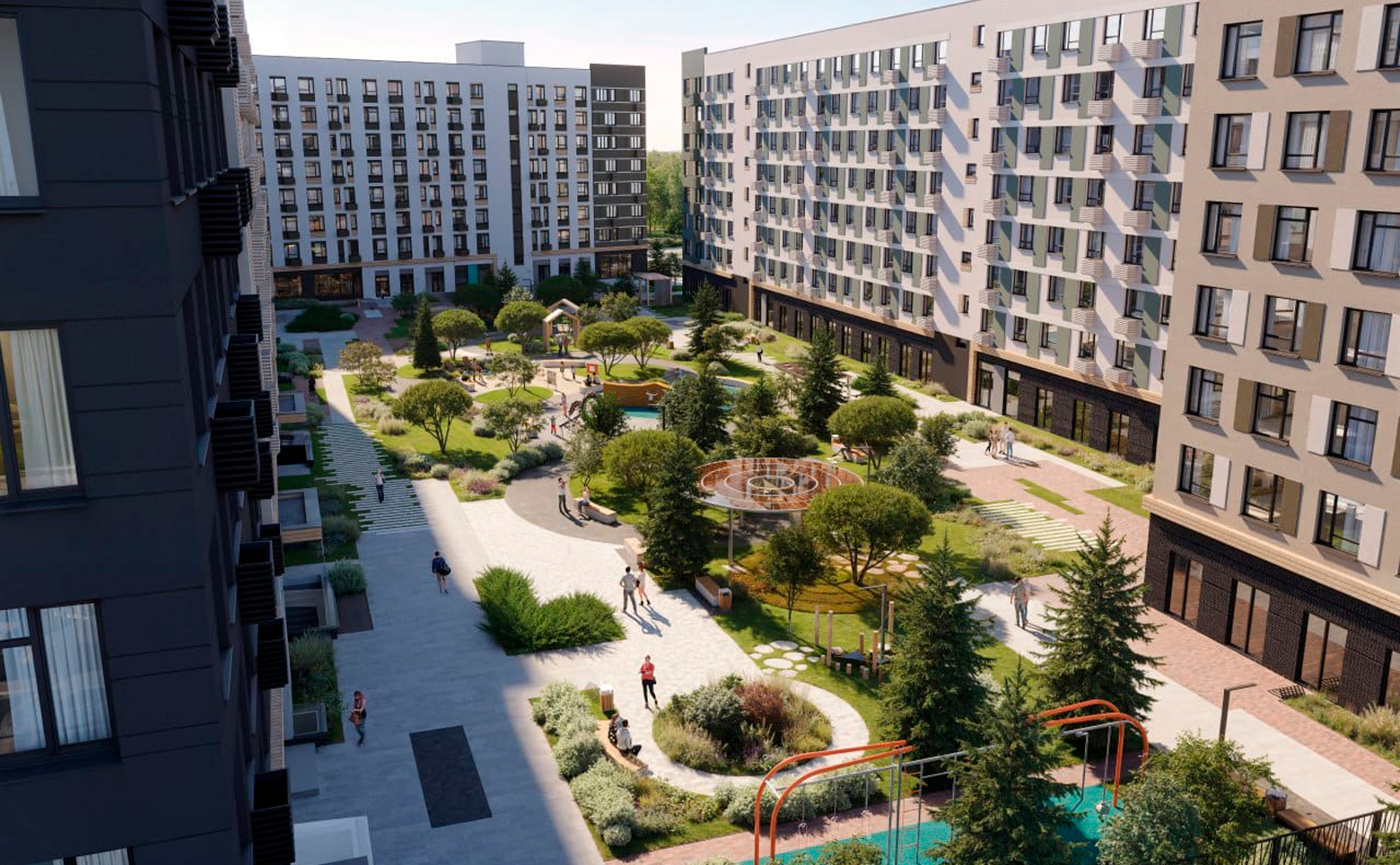 Территория благоустроена и закрыта от автомобилей — имеется безбарьерная среда, соседский центр, двор-сад, зеленые насаждения. Для автовладельцев предусмотрен наземный паркинг.