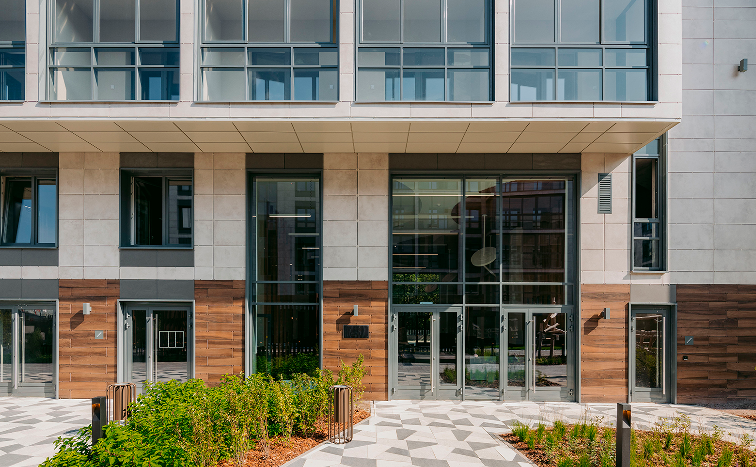 Проект представляет собой малоэтажную застройку высотой в 5 этажей. Все входные группы спроектированы по принципу безбарьерной жилой среды. Двери входных групп прозрачные, пропускающие естественный свет с улицы. В каждой секции есть помещения для хранения колясок или спортивного инвентаря, а также оборудования для водных видов спорта. На территории есть насосная станция для сапов. А почтовые ящики открываются при помощи смартфона или электронного ключа.