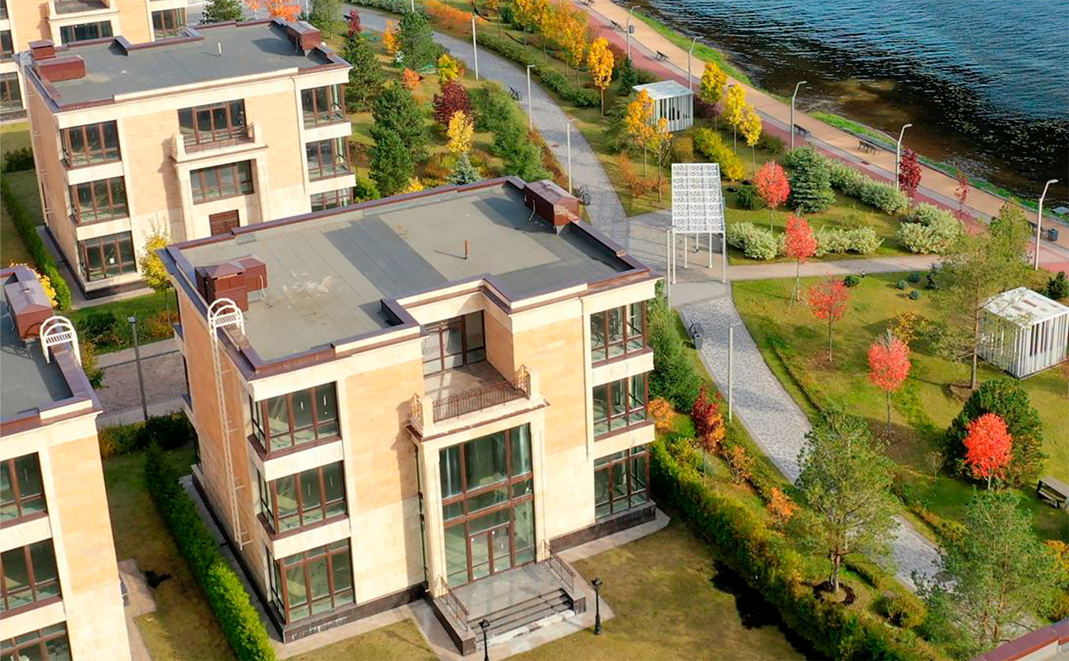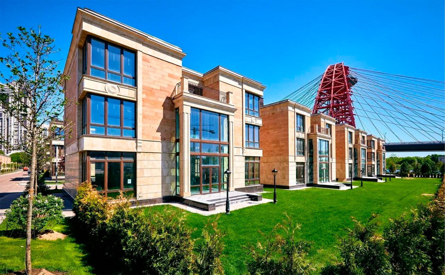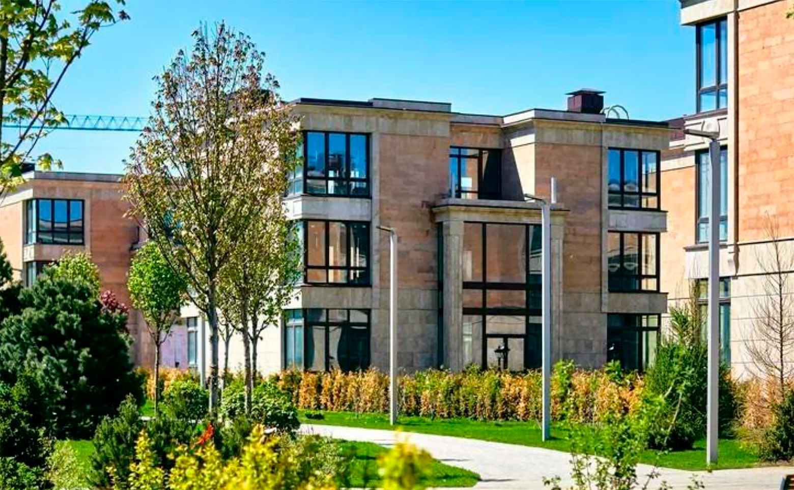 Жилой комплекс представлен коллекцией 3-этажных таунхаусов и вилл с просторными озелененными участками. Здания выполнены по надежной кирпично-монолитной технологии, фасады отделаны натуральным камнем — травертином и гранитом, что подчеркивает премиальный характер проекта.