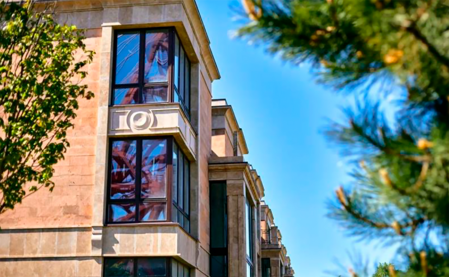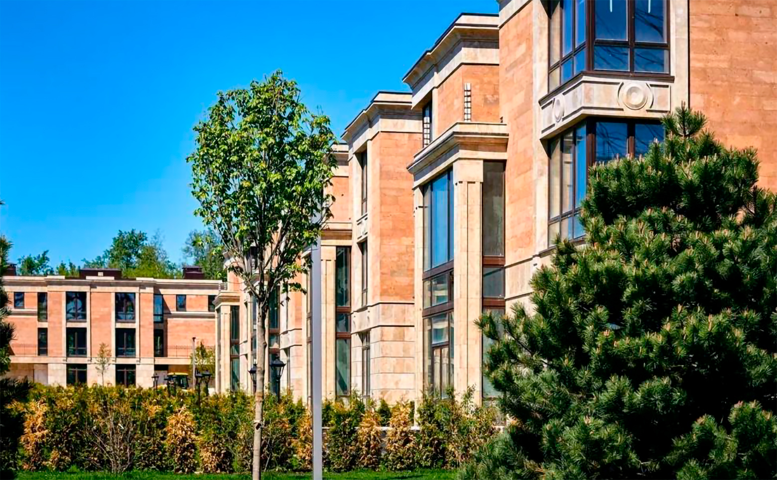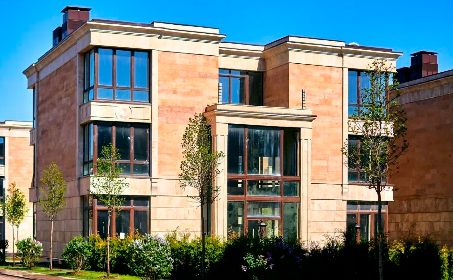 Жилой комплекс представлен коллекцией 3-этажных таунхаусов и вилл с просторными озелененными участками. Здания выполнены по надежной кирпично-монолитной технологии, фасады отделаны натуральным камнем — травертином и гранитом, что подчеркивает премиальный характер проекта.