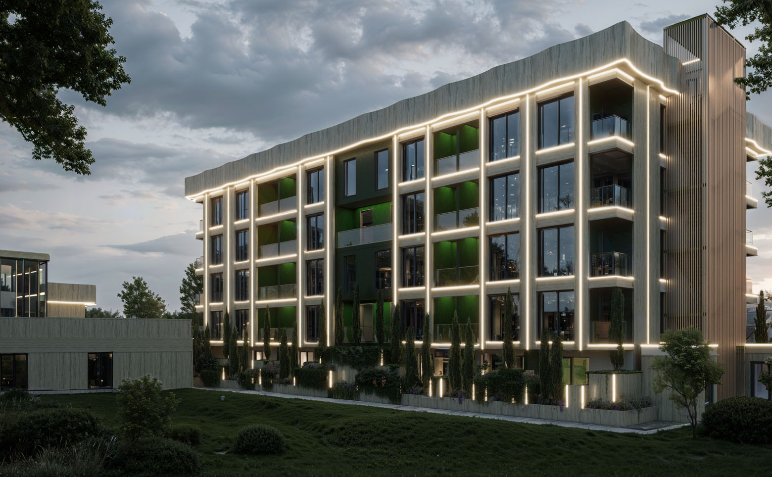 Клубная резиденция премиум класса выполнена по монолитной технологии с вентилируемыми фасадами из керамогранита. В отделке использован натуральный травертин и панели из коричневого дуба каселла в холлах. Экстерьер дополнен архитектурной подсветкой, а в лобби и на этажах применен мраморный керамогранит и живая зелень. В здании установлены бесшумные лифты и система охлаждения холлов для комфорта в любое время года.