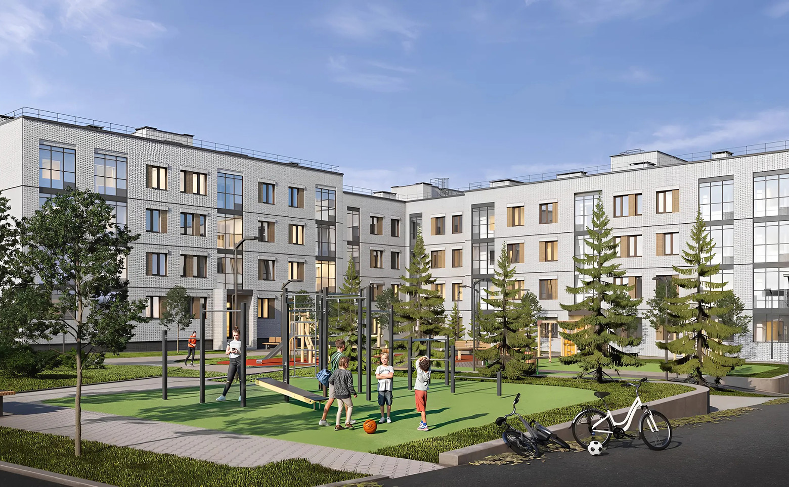 Во дворе жилого комплекса расположены зоны отдыха, детские и спортивные площадки. Территория комплекса благоустроена и озеленена, для владельцев автомобилей предусмотрен надземный паркинг. Въезд на территорию осуществляется через шлагбаум.