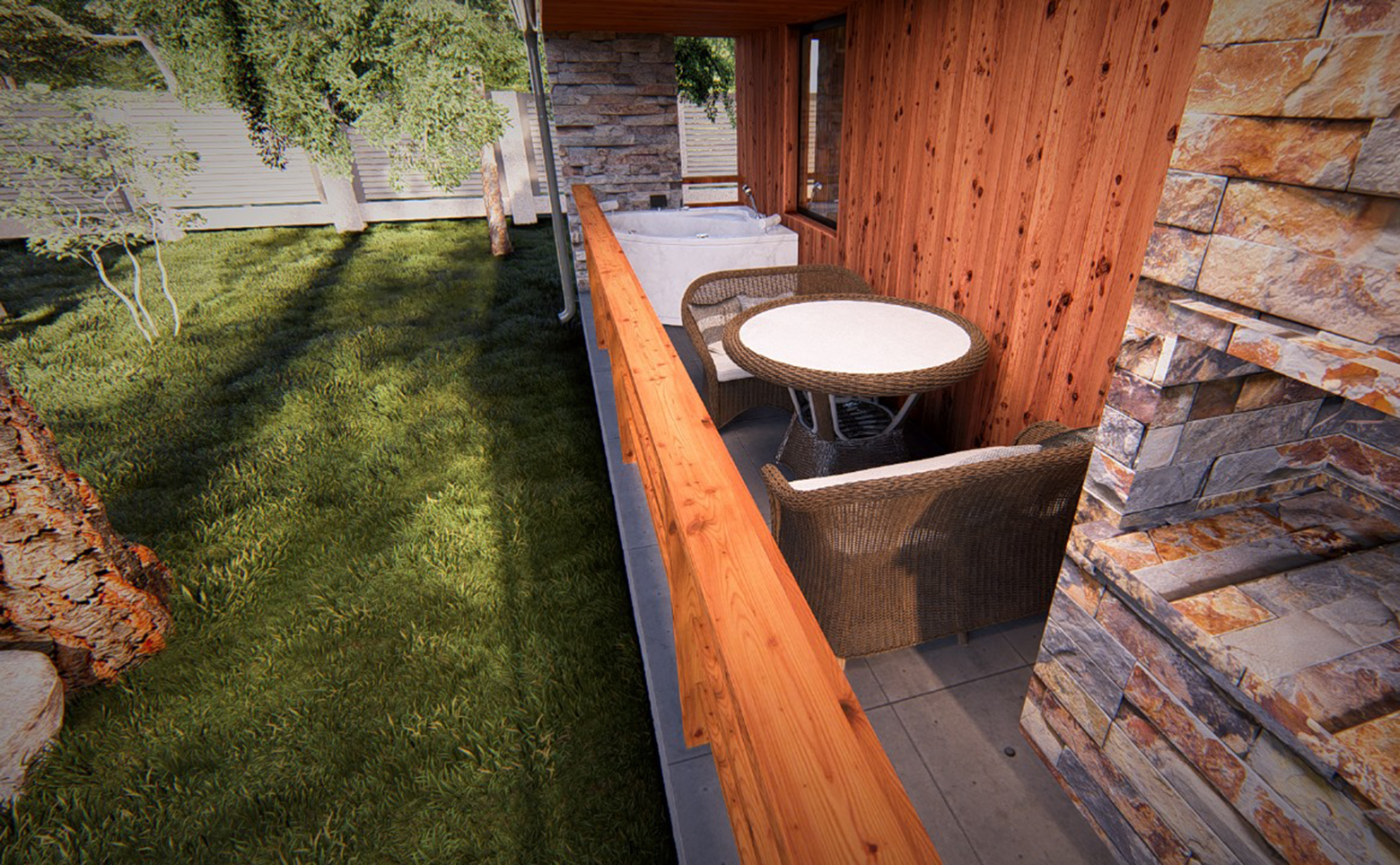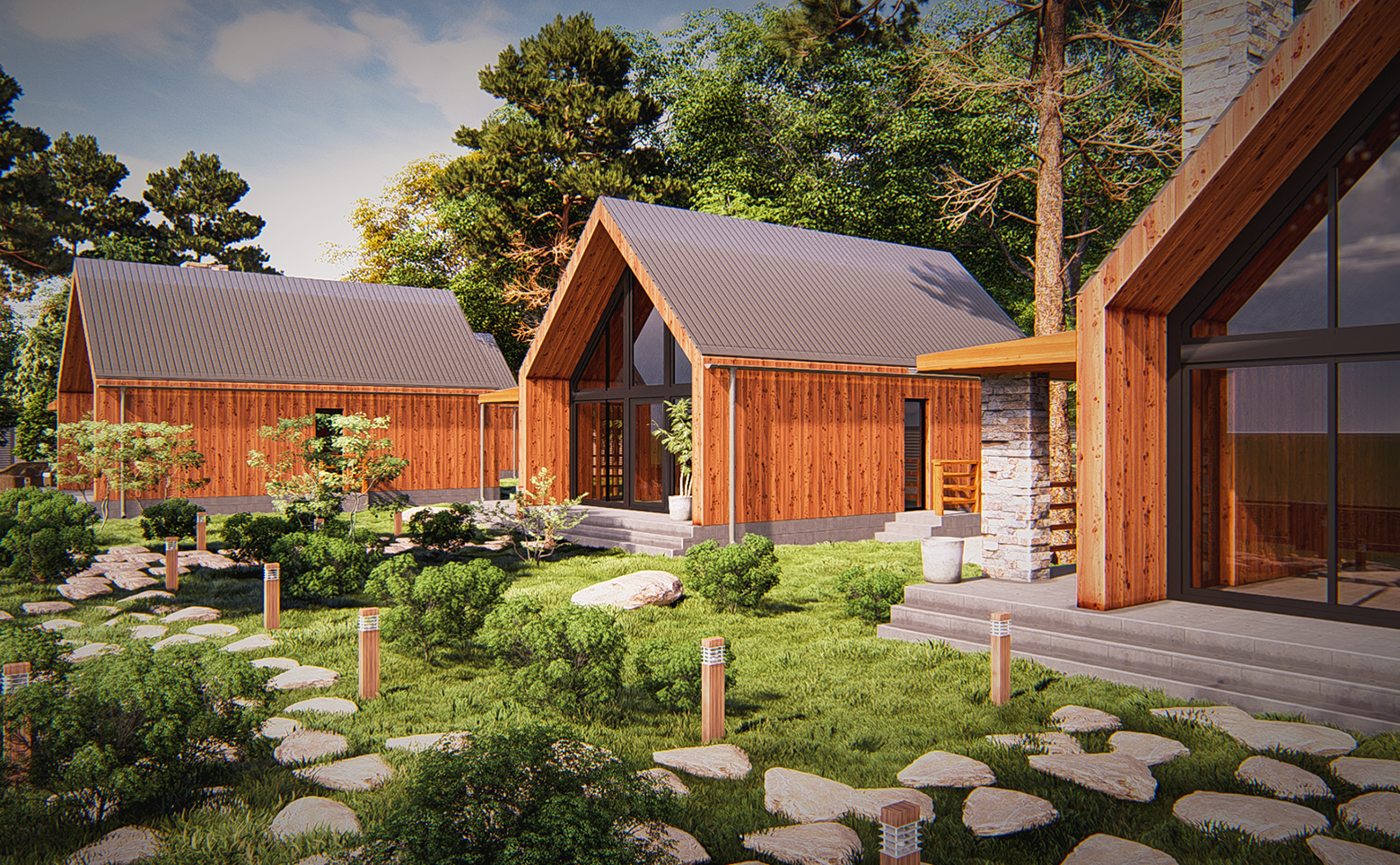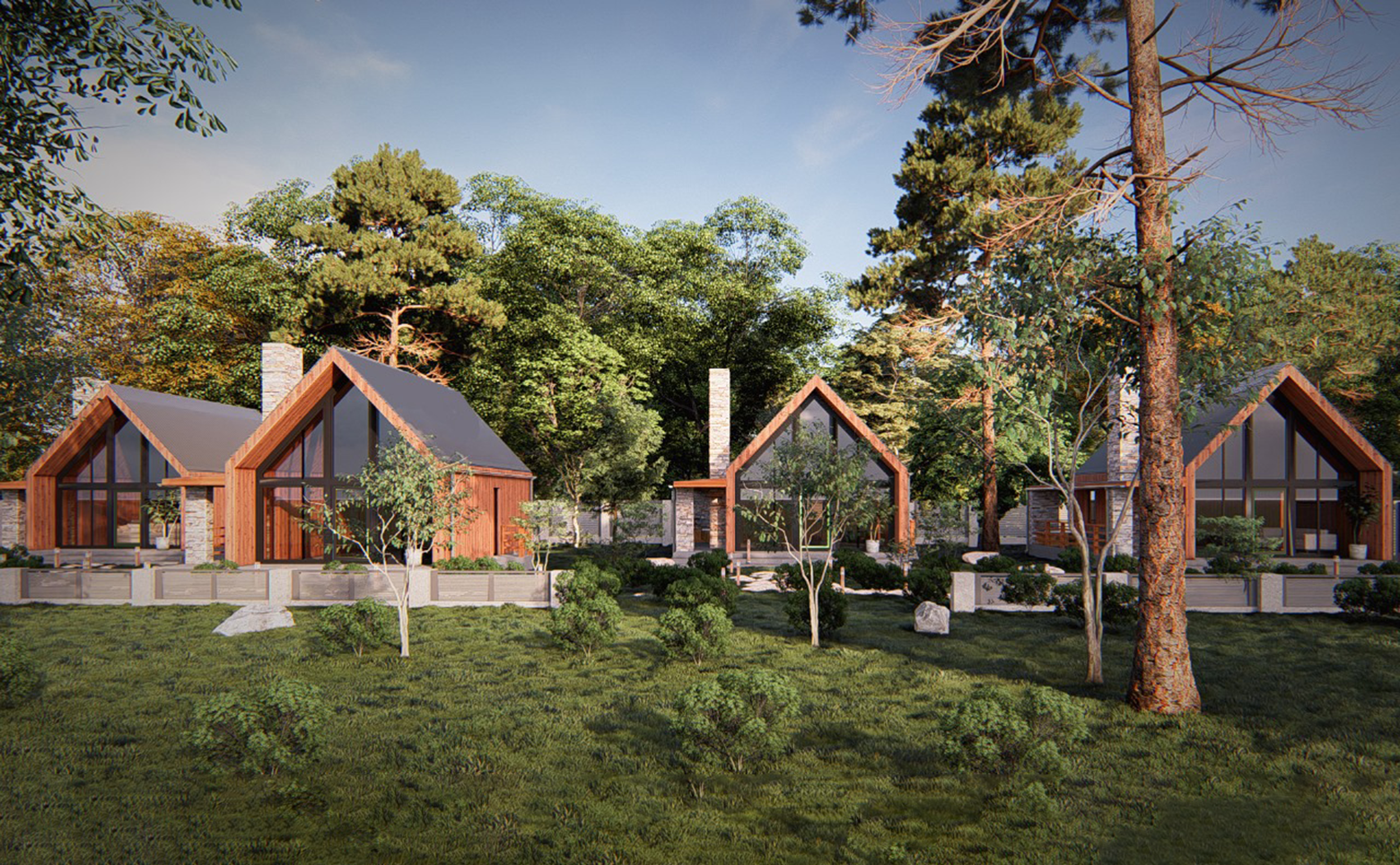 Проект представляет собой 3 очереди индивидуальных глэмпинг-коттеджей. 1 очередь состоит из 8 домов, возведенных по каркасной технологии строительства. Фасады облицованы деревом. Дома в проекте предназначены только для сдачи в аренду, как один из вариантов бизнеса для покупателей.