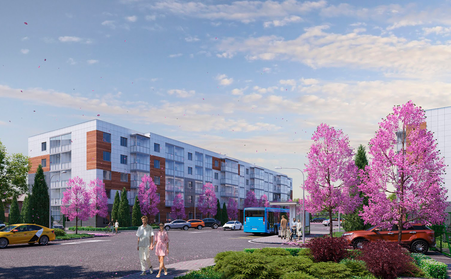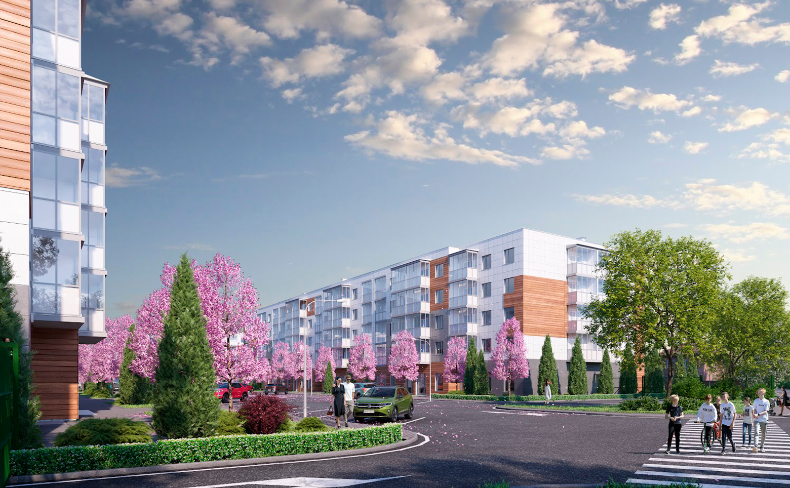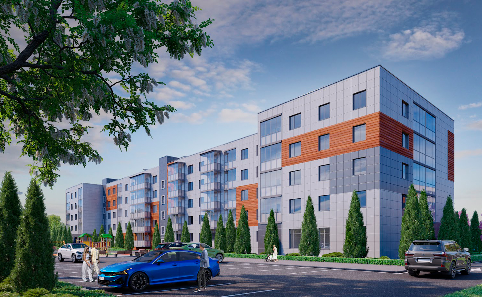 Территория комплекса благоустроена и озеленена. Во дворе спроектированы детские площадки с безопасным покрытием. Для владельцев автомобилей предусмотрена стоянка.