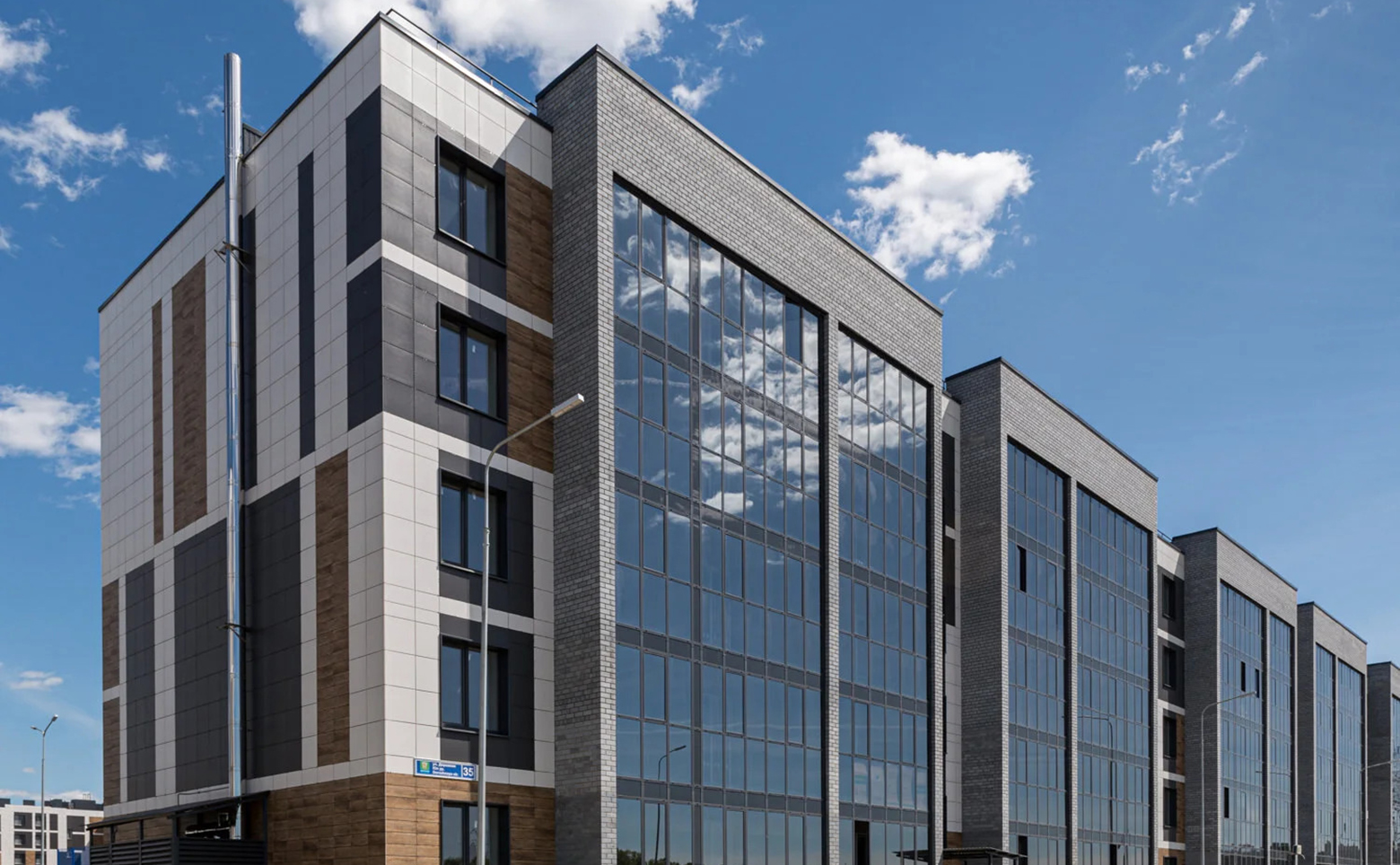 Данный жилой комплекс представляет собой комфортный малоэтажный проект, включающий в себя несколько зданий переменной этажности. Комплекс возведен по кирпичной технологии строительства, вентилируемые фасады отделаны керамогранитом в молочных и серо-коричневых оттенках. Входные группы обеспечены безбарьерным доступом, колясочными и пассажирскими лифтами.