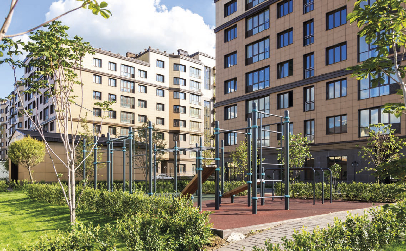 На территории комплекса расположены детский сад, начальная школа, мини-зоопарк, фитнес-центр с бассейном, рестораны, кафе и супермаркеты. Есть зоны отдыха с беседками для барбекю, площадки для занятий спортом, детские игровые зоны, бильярдный клуб и салон красоты. Подземный паркинг оборудован спуском на лифте, также есть стоянка. Комплекс охраняется, действует пропускной режим и круглосуточное видеонаблюдение.
