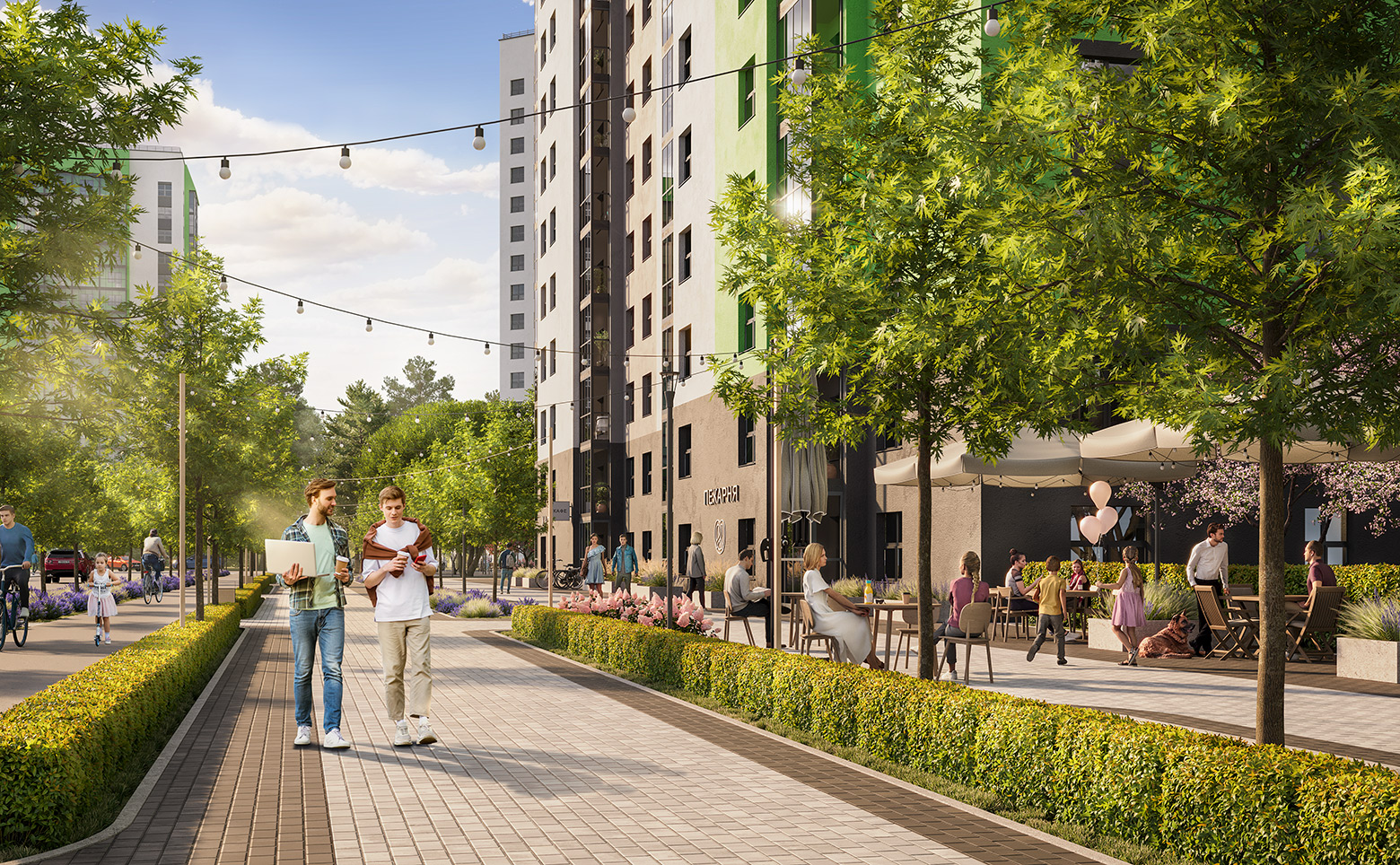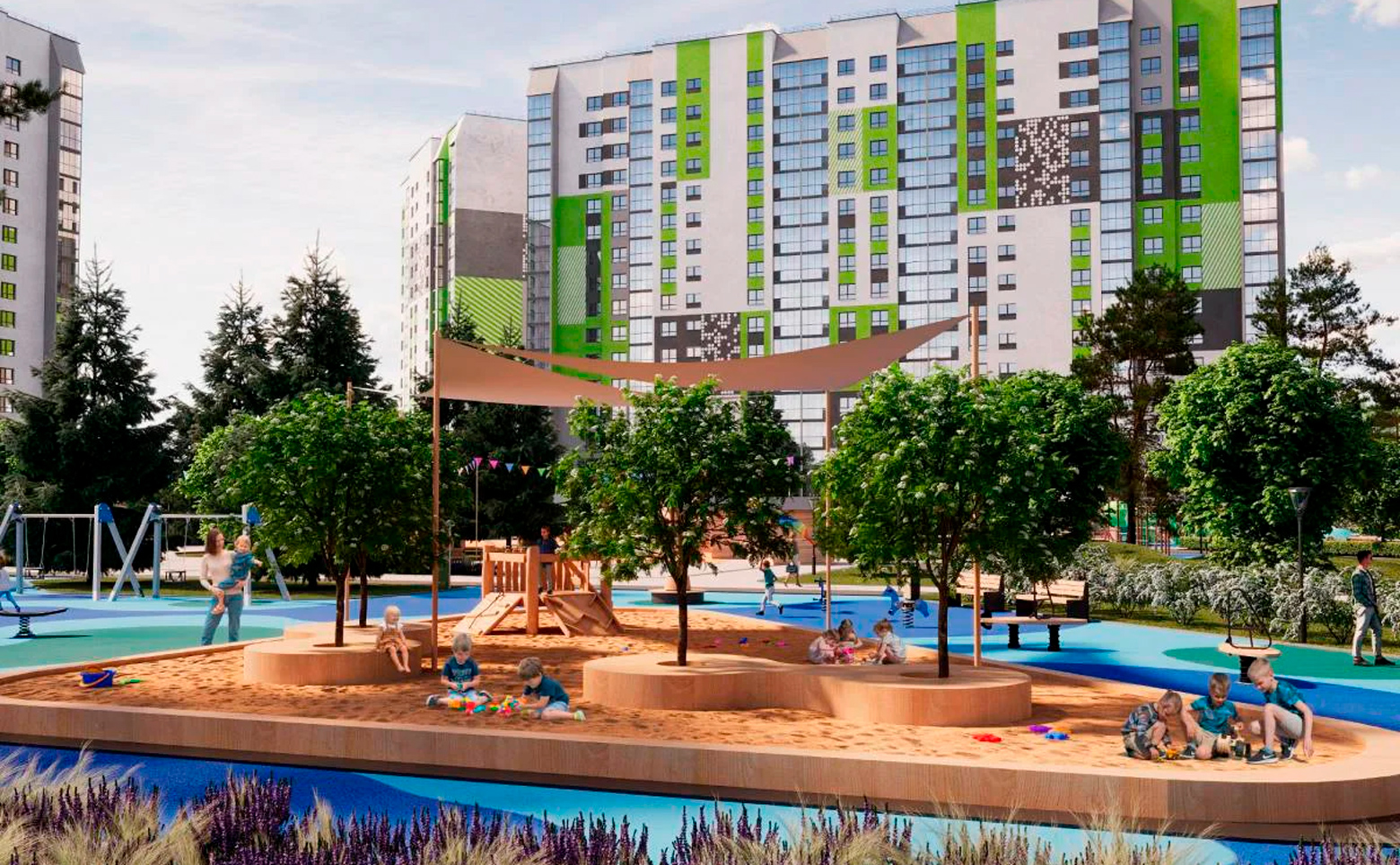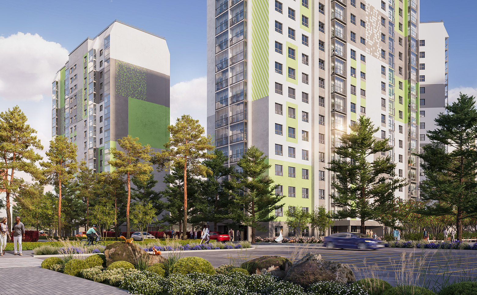 На территории проекта предусмотрены места для отдыха, детские и спортивные площадки. Изюминкой эко-квартала является прогулочный бульвар, который проходит между жилых домов вдоль всего комплекса.