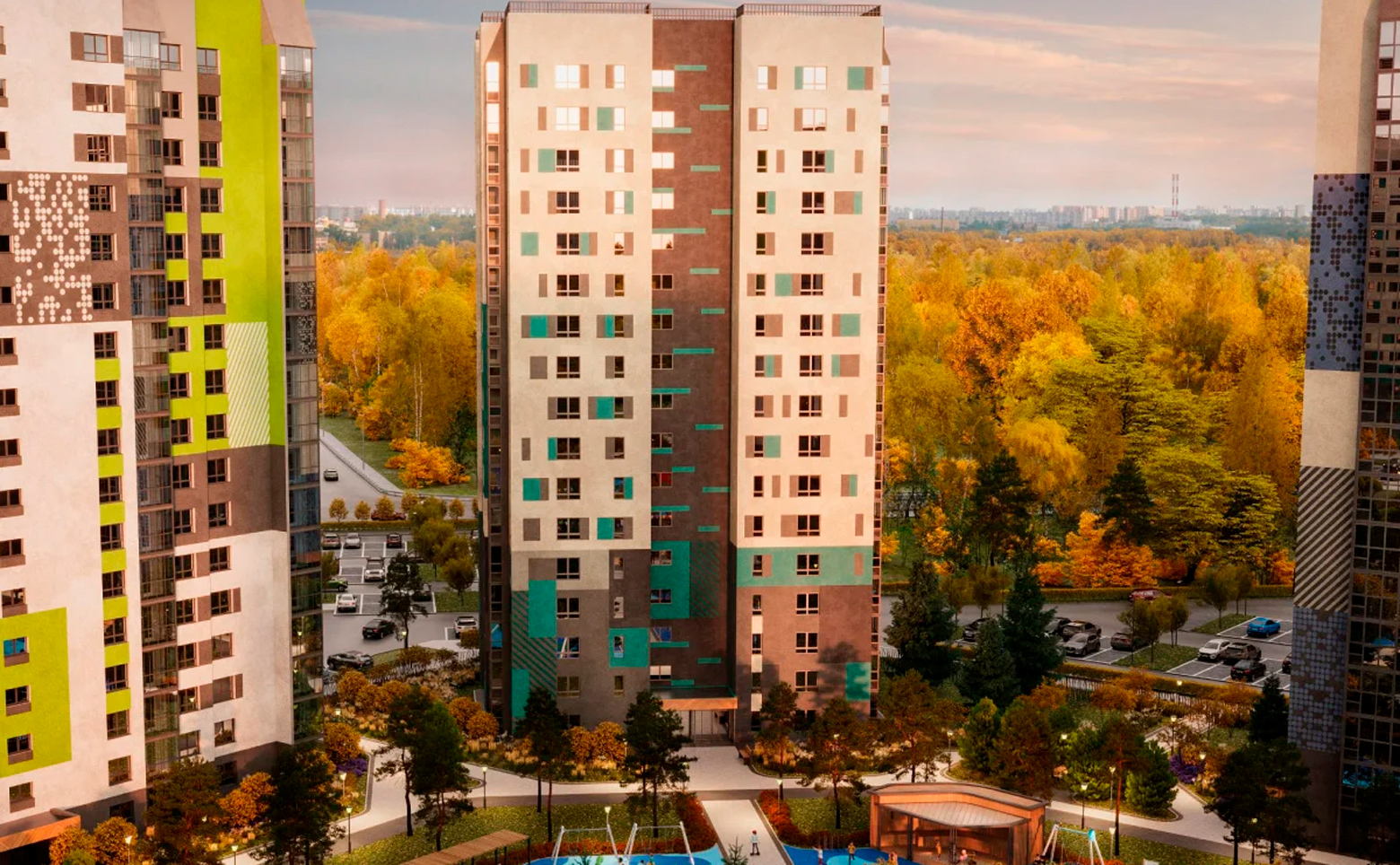 Проект представляет собой комплексную застройку из 30 домов высотой 17 этажей. В оформлении стен зданий используется декоративно-защитная штукатурка по технологии мокрый фасад. Входные группы предусмотрены в витражном исполнении. Стеклянные двери преображают пространство, наполняя его естественным светом. На первых этажах расположены колясочные и почтовые ящики.