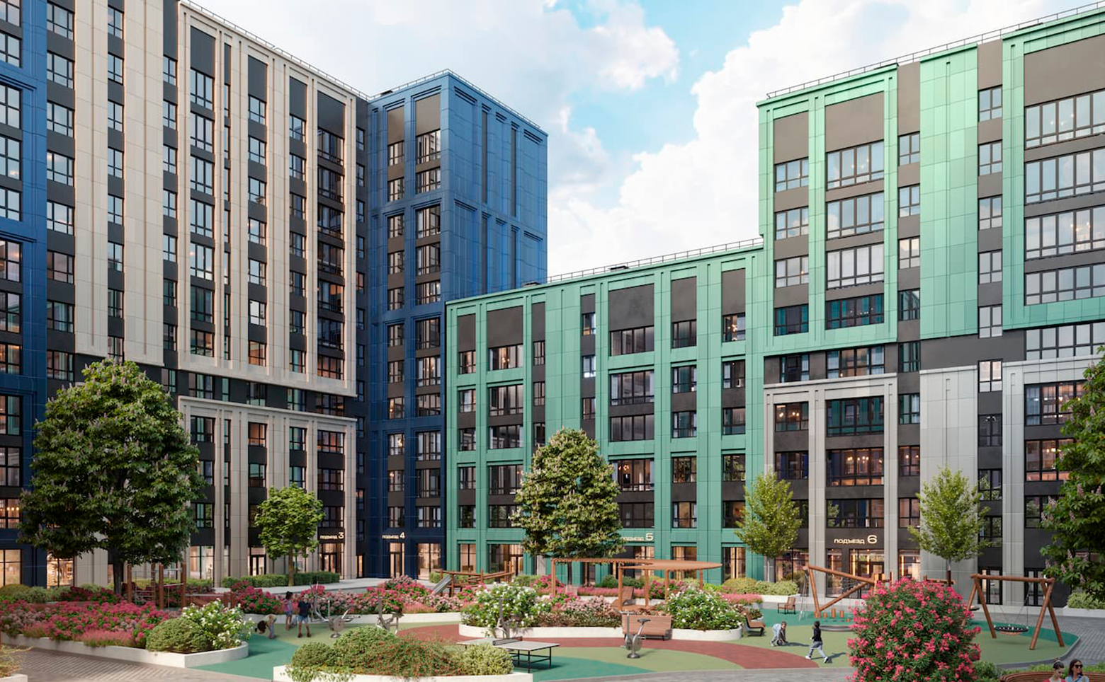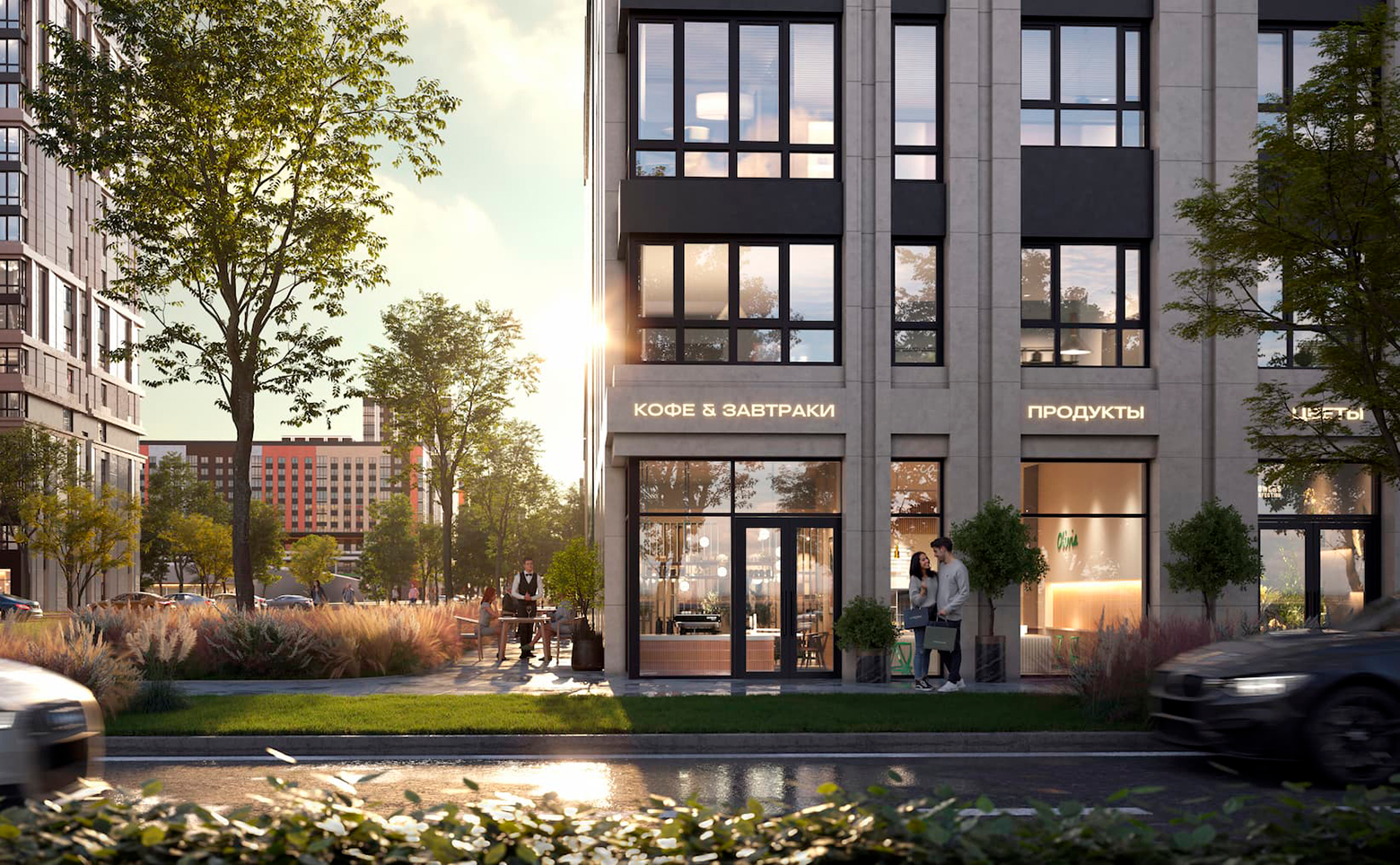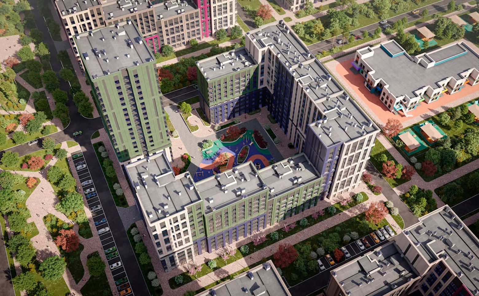 На территории комплекса реализована концепция «двор без машин» с круглосуточным видеонаблюдением, системой охраны и приватным благоустройством. Запроектированы тематические дворы, каждый из которых оформлен в собственной эстетике и включает детские и спортивные площадки, зоны отдыха, арт-объекты и ландшафтный дизайн. В составе проекта также парк Импрессионистов, аллея танца Мимолетность, амфитеатр, уличная библиотека и скверы. Придомовые территории оформлены с учетом принципов инклюзии и всесезонной доступности.