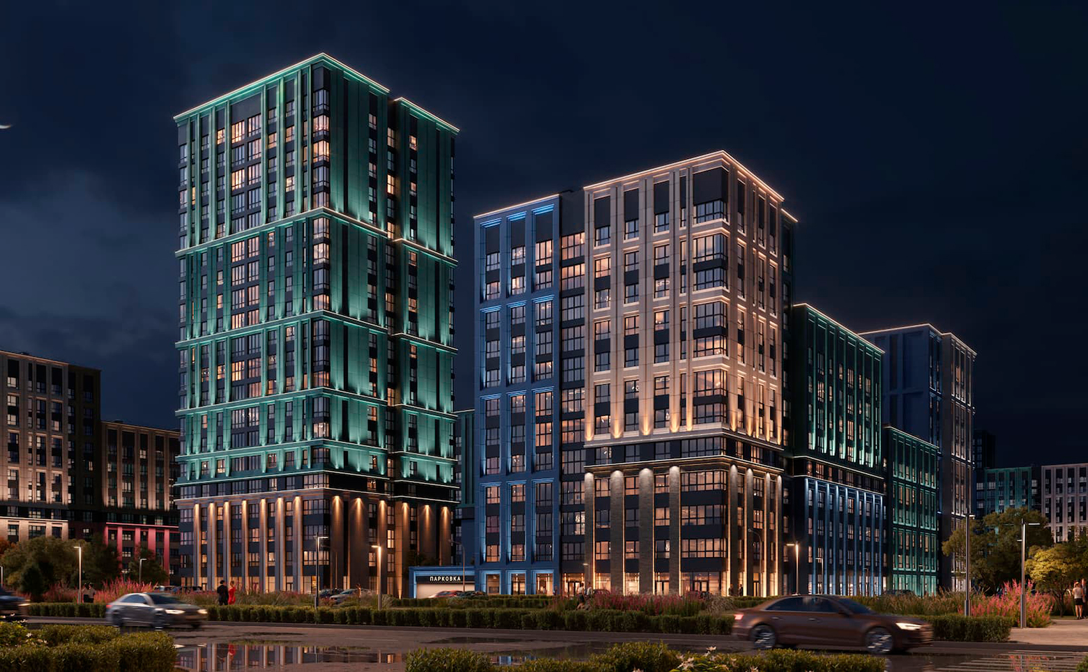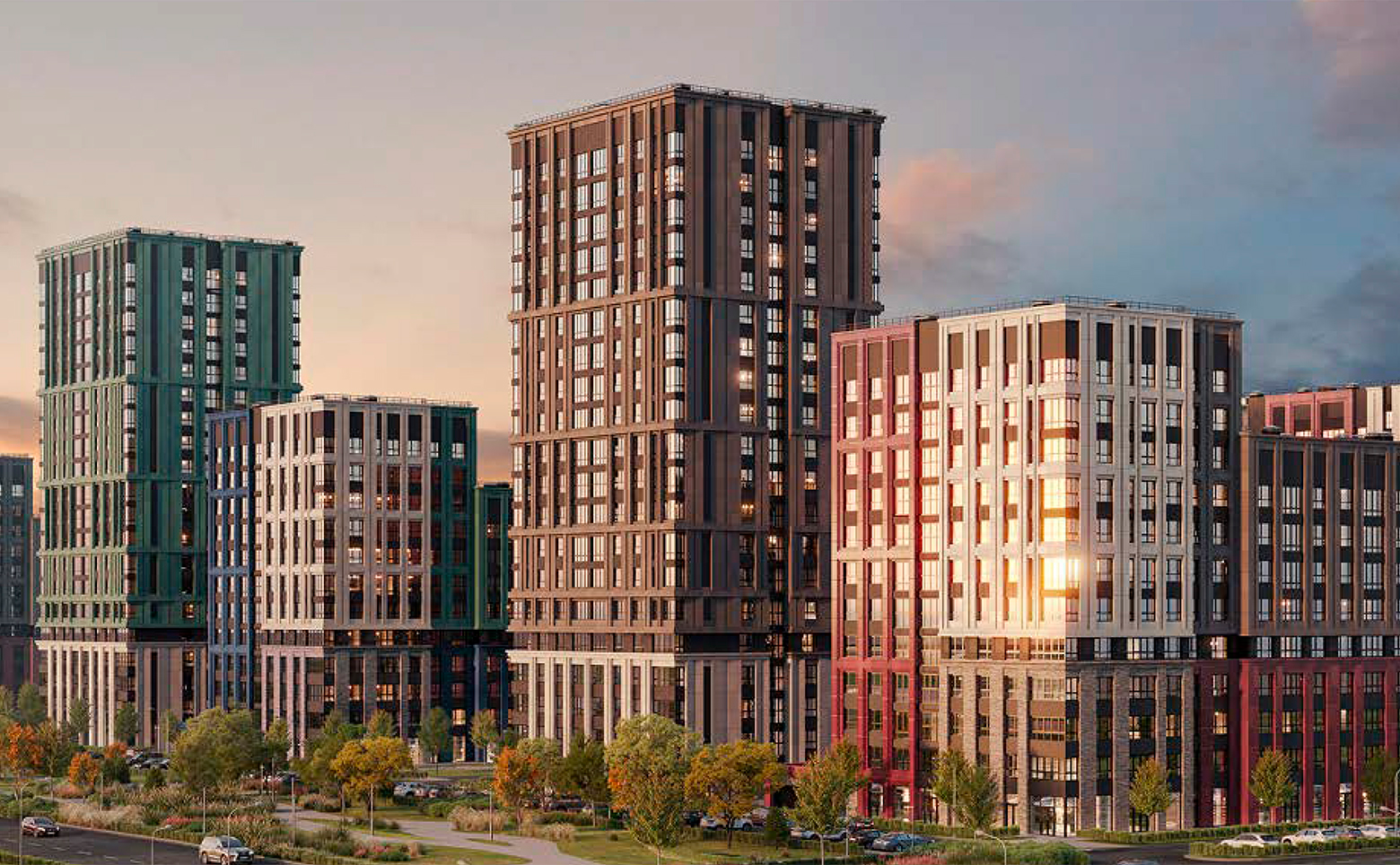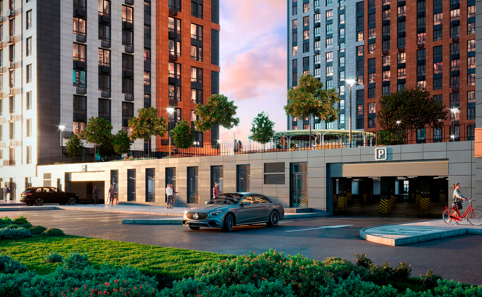 На территории комплекса реализована концепция «двор без машин» с круглосуточным видеонаблюдением, системой охраны и приватным благоустройством. Запроектированы тематические дворы, каждый из которых оформлен в собственной эстетике и включает детские и спортивные площадки, зоны отдыха, арт-объекты и ландшафтный дизайн. В составе проекта также парк Импрессионистов, аллея танца Мимолетность, амфитеатр, уличная библиотека и скверы. Придомовые территории оформлены с учетом принципов инклюзии и всесезонной доступности.