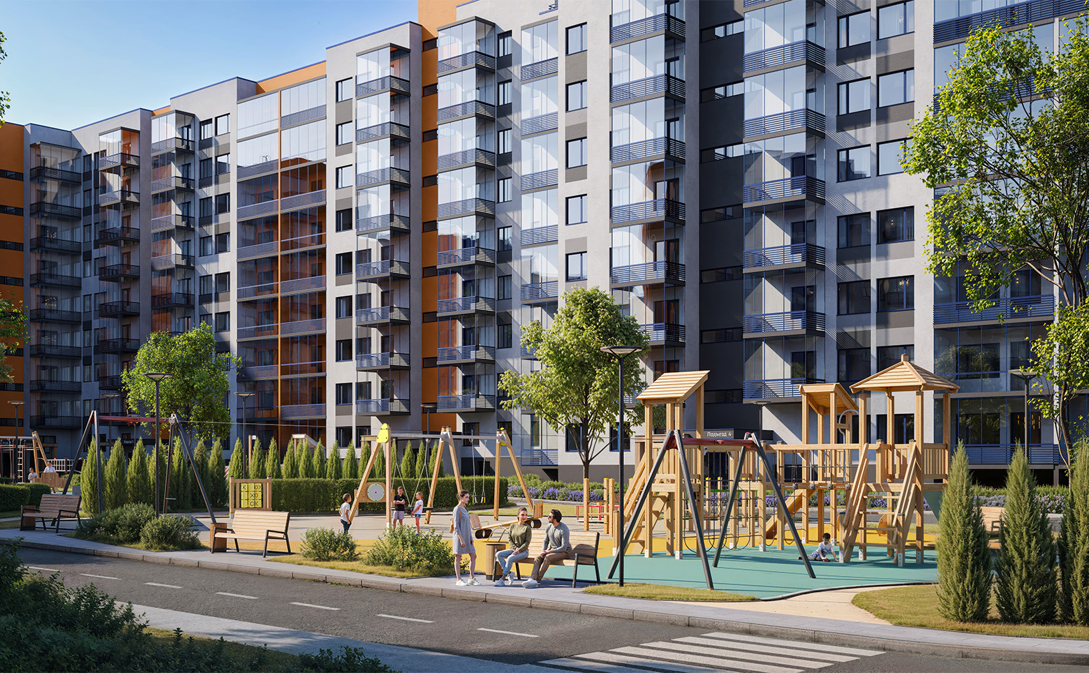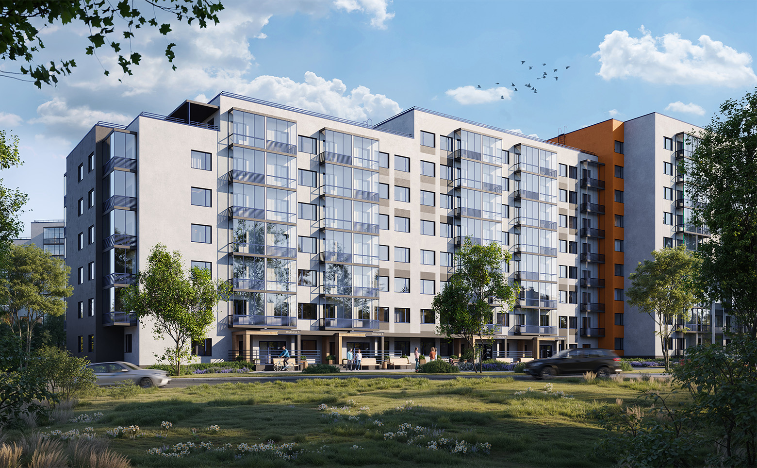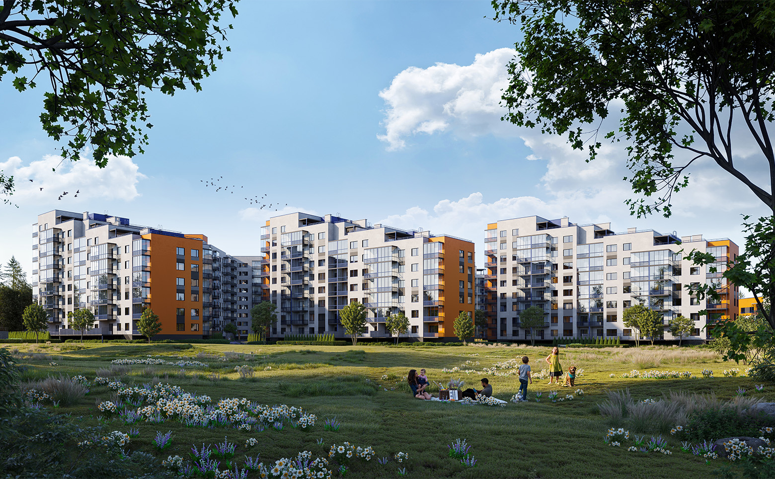 С помощью ландшафтного дизайна дворы разделены на тематические зоны: лужайки с ровным газоном, на которых удобно загорать и устраивать пикники, кустарники отделяют друг от друга детские и спортивные площадки создавая зеленую изгородь. Для выгула домашних животных на территории квартала предусмотрены специальные места. Для владельцев автомобилей предусмотрена стоянка за пределами двора.
