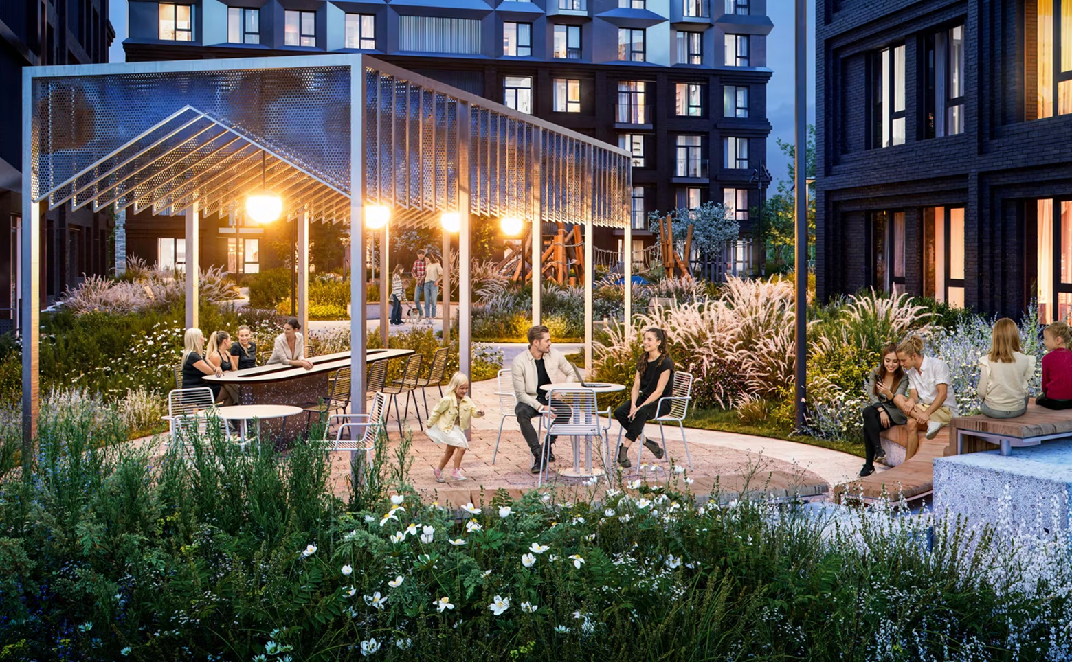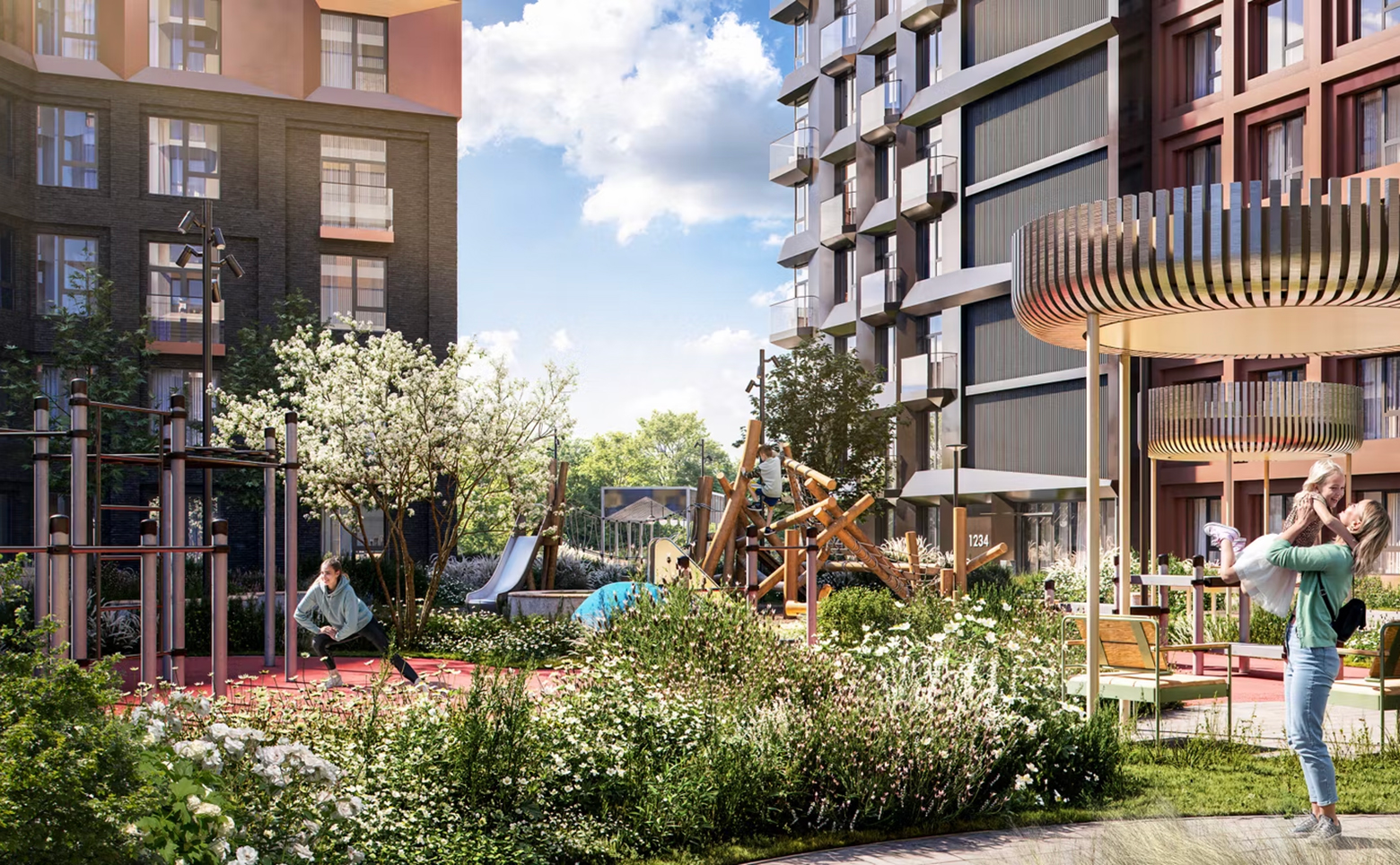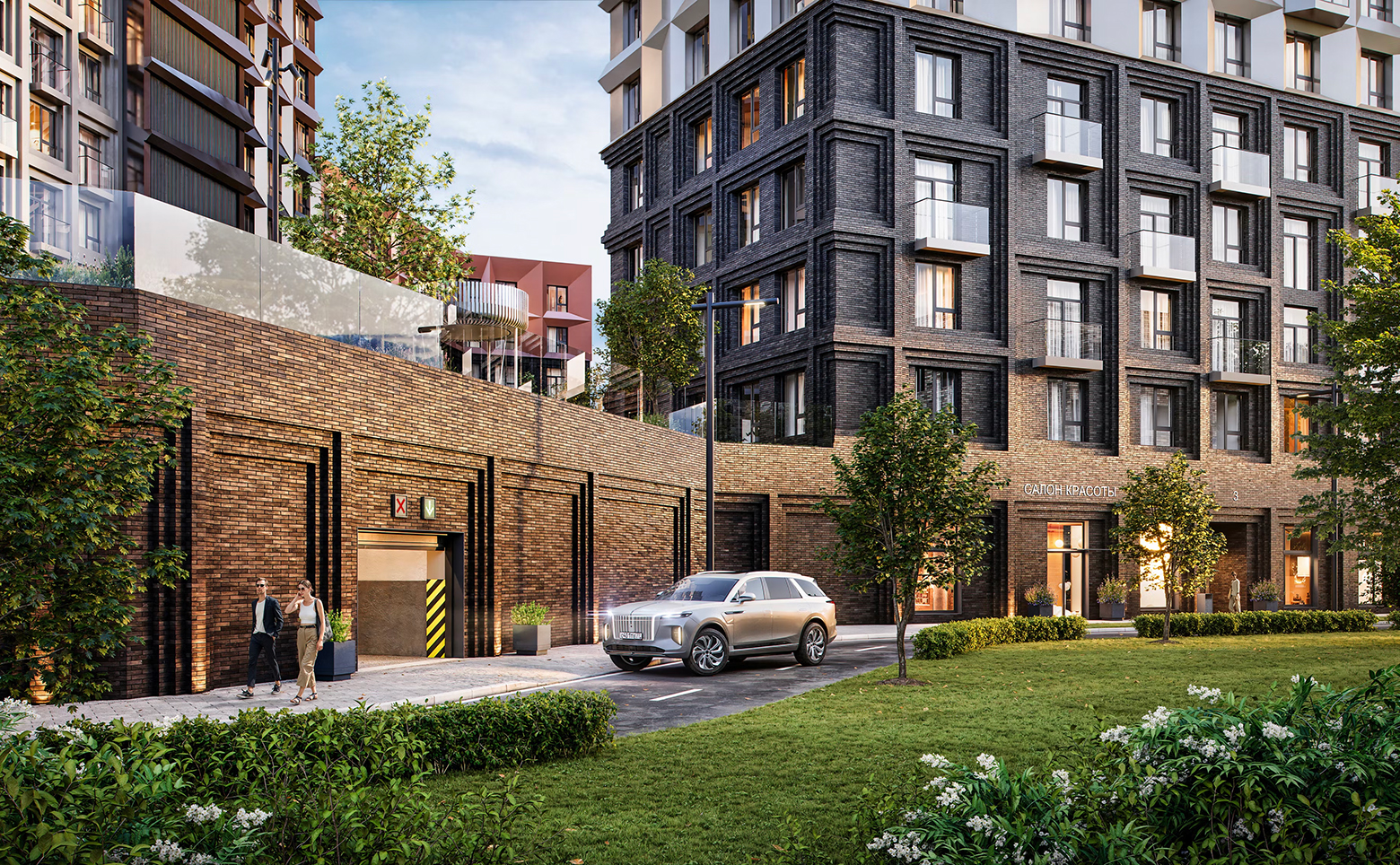 Территория комплекса благоустроена и озеленена. На придомовой территории раскинулись широкие зелёные аллеи прогулочных зон, клумбы и кустарники. Во дворе спроектированы безопасные детские площадки с песочницами, горками и качелями. На коммерческом этаже расположен детский сад. Доступ на территорию осуществляется с помощью RFID ключа. Для владельцев автомобилей предусмотрен подземный паркинг.