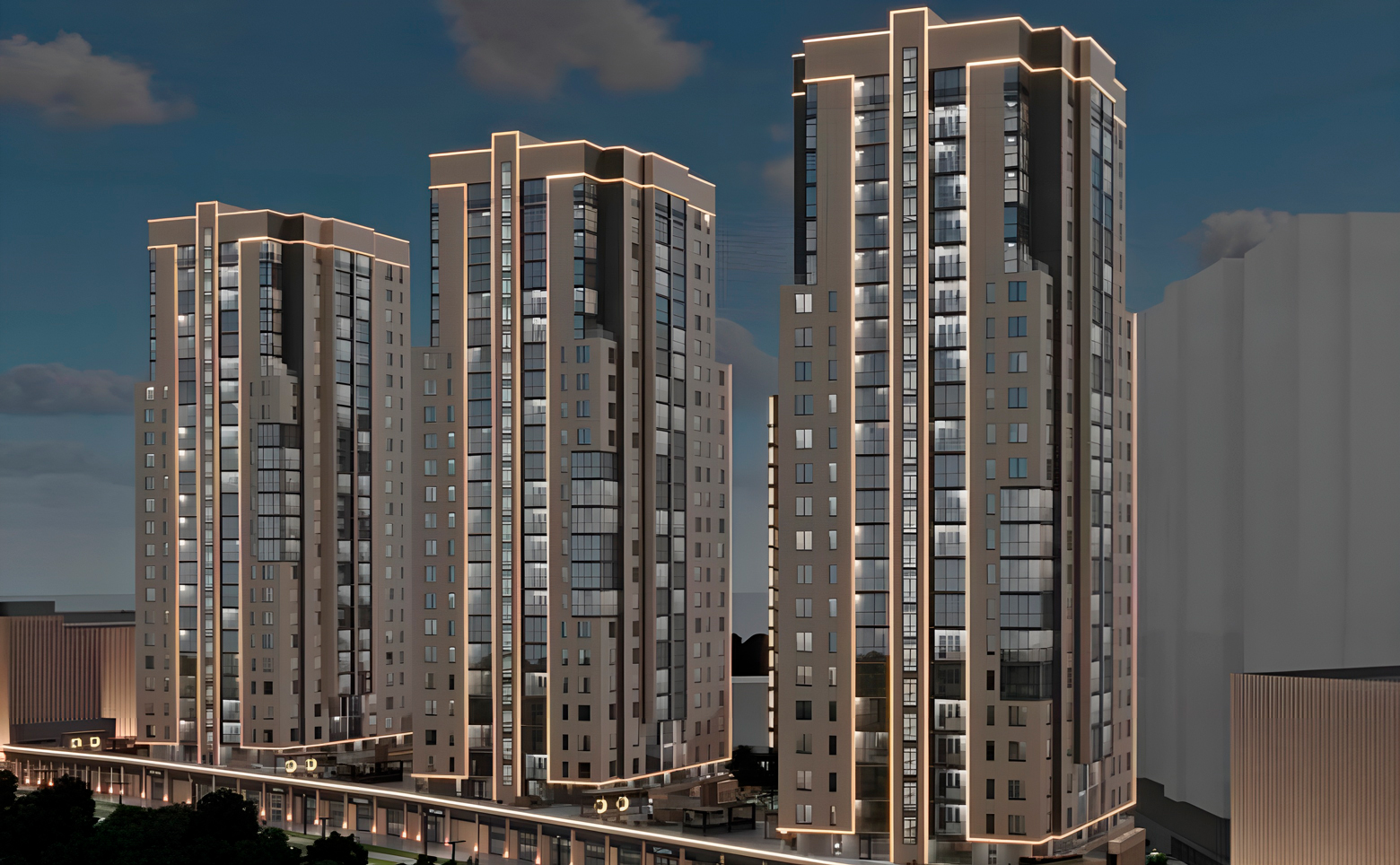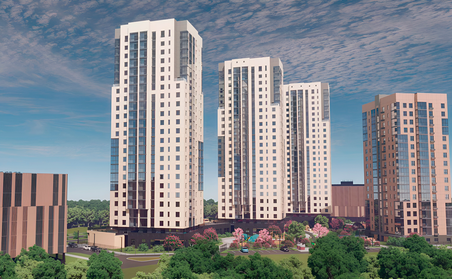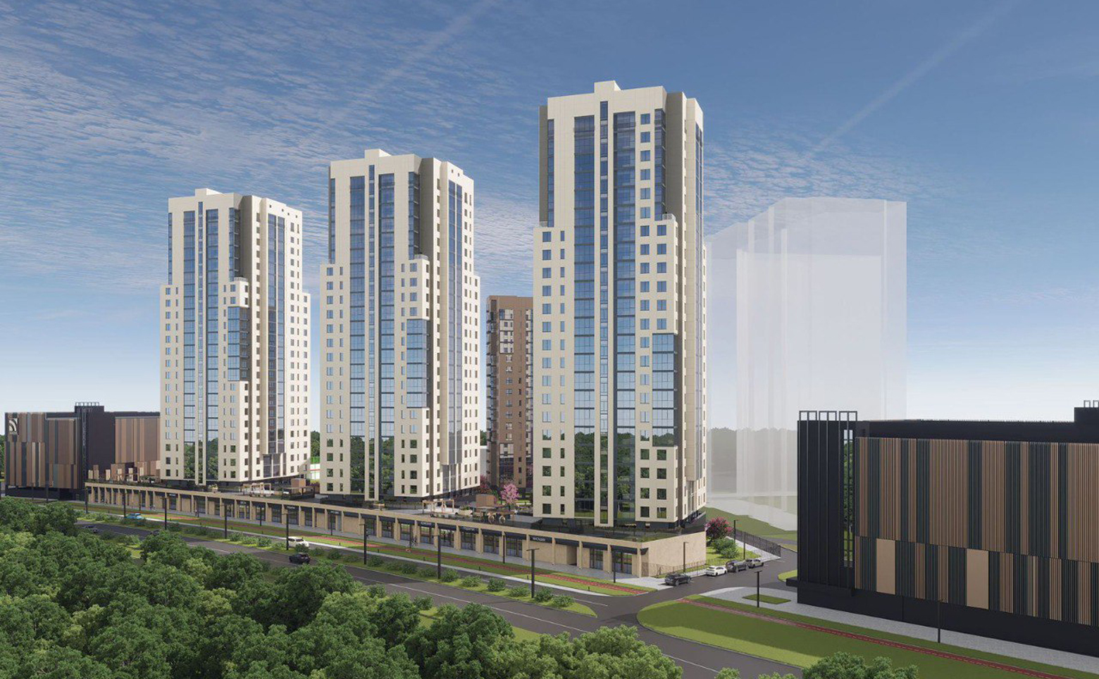 Жилой комплекс состоит из 4 домов переменной этажности. Возводятся дома по долговечной кирпично-монолитной технологии строительства с фасадами, облицованными штукатуркой. В каждом доме парадный вход с зоной ожидания, санузлом, комфортной велосипедной и колясочной, помещением мойки лап животных. Установлены пассажирский и грузовой лифты.