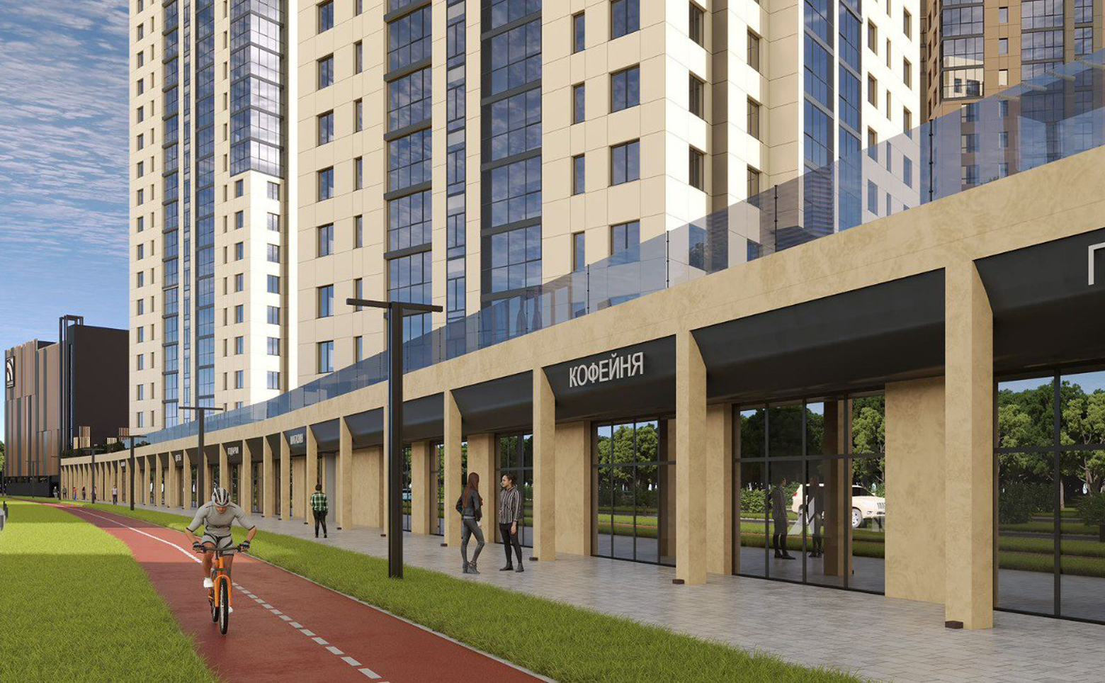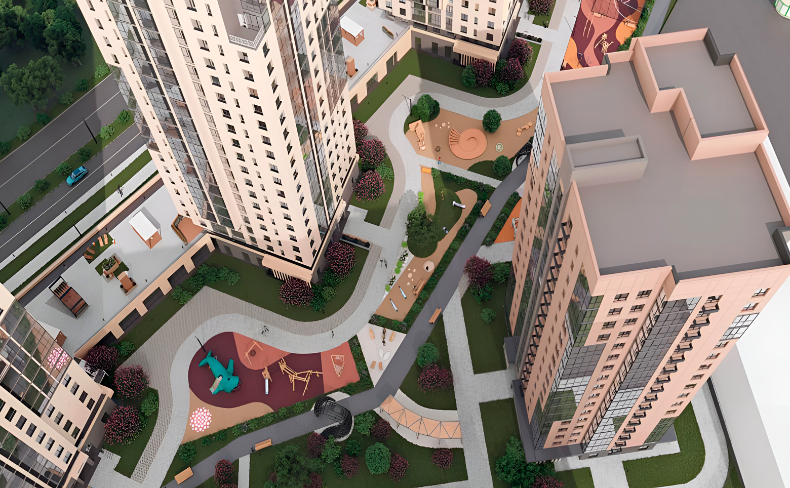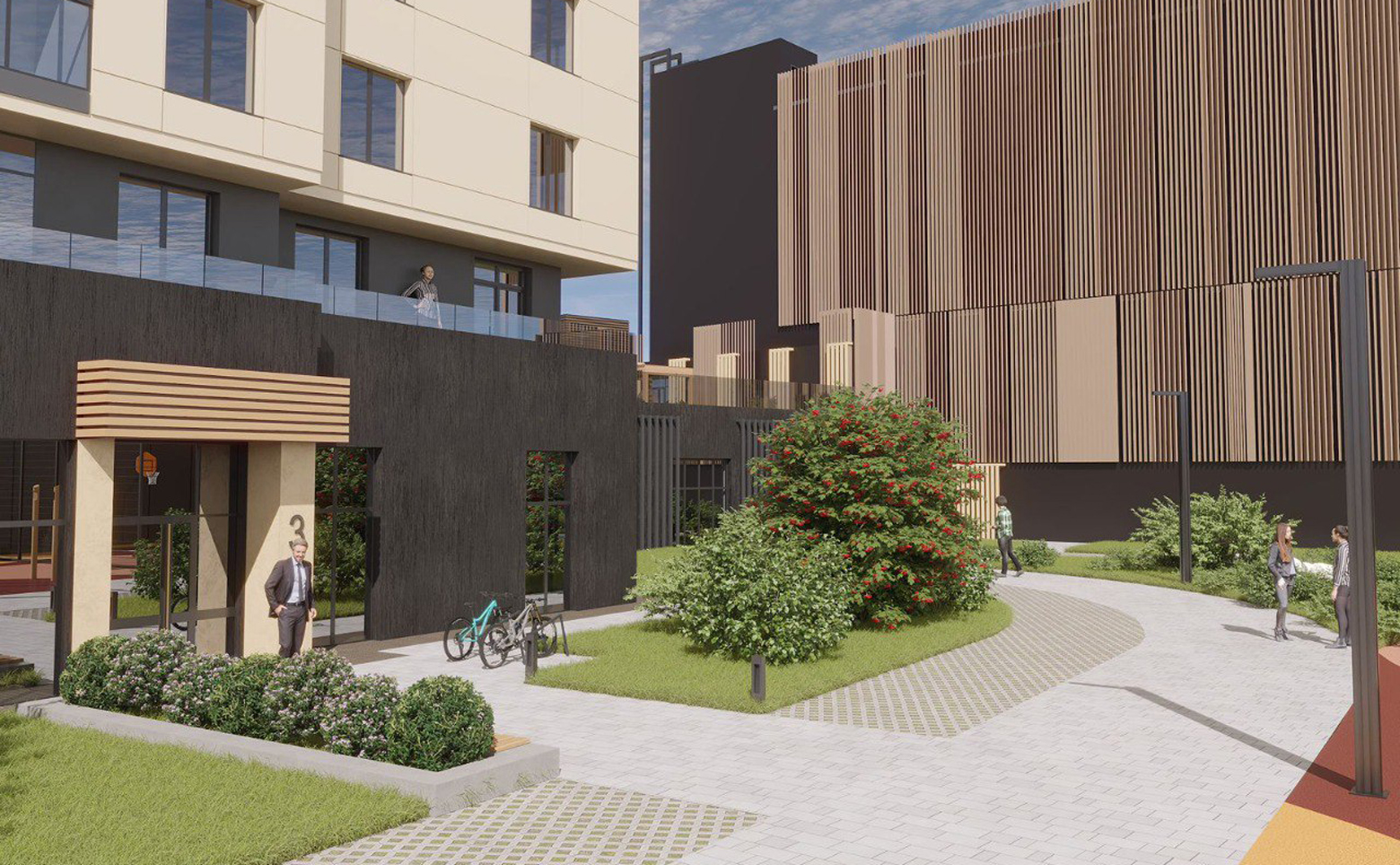 На территории комплекса обустроены детские площадки, площадки для занятия спортом. На первых этажах расположены коммерческие помещения. На кровле коммерции размещены шезлонги, живая изгородь, небольшие деревья в вазонах. Особенные уголки дворового пространства — дождевые сады, представляющие собой сад камней с разноуровневыми многолетними травами, кустарниками и деревом-солитером. Для автомобилей предусмотрен многоэтажный паркинг.