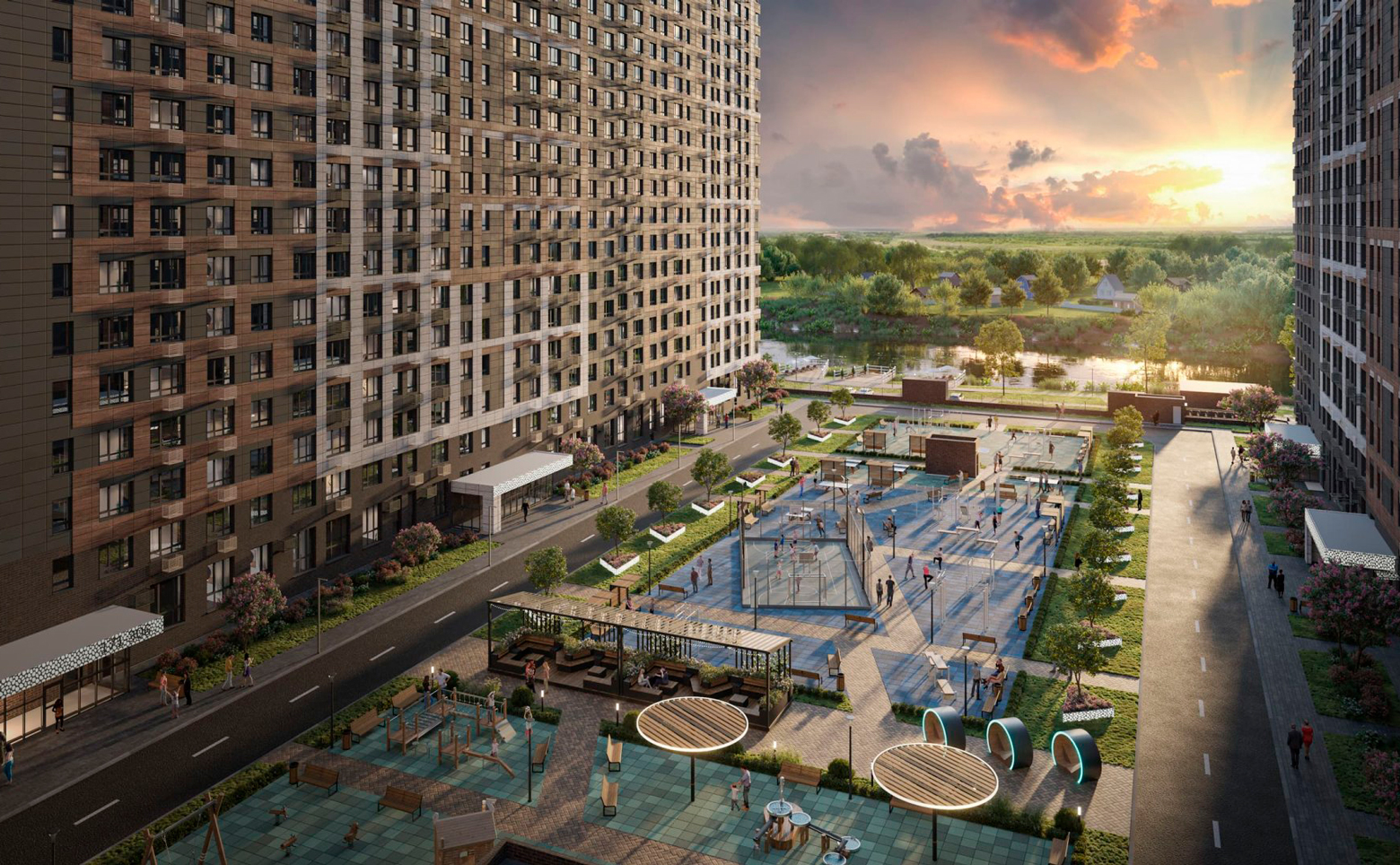 Дворовая территория комплекса организована по концепции без машин. На 2 подземных уровнях расположен вместительный паркинг. Во дворе размещены детский сад, игровые и спортивные площадки, футбольное и баскетбольное поля, а также воркаут-зона с тренажерами. Пешеходные дорожки и скамейки оснащены системой подогрева, что делает общественные зоны удобными даже в мороз. Безопасность обеспечивается интеллектуальной системой видеонаблюдения и контролем доступа.