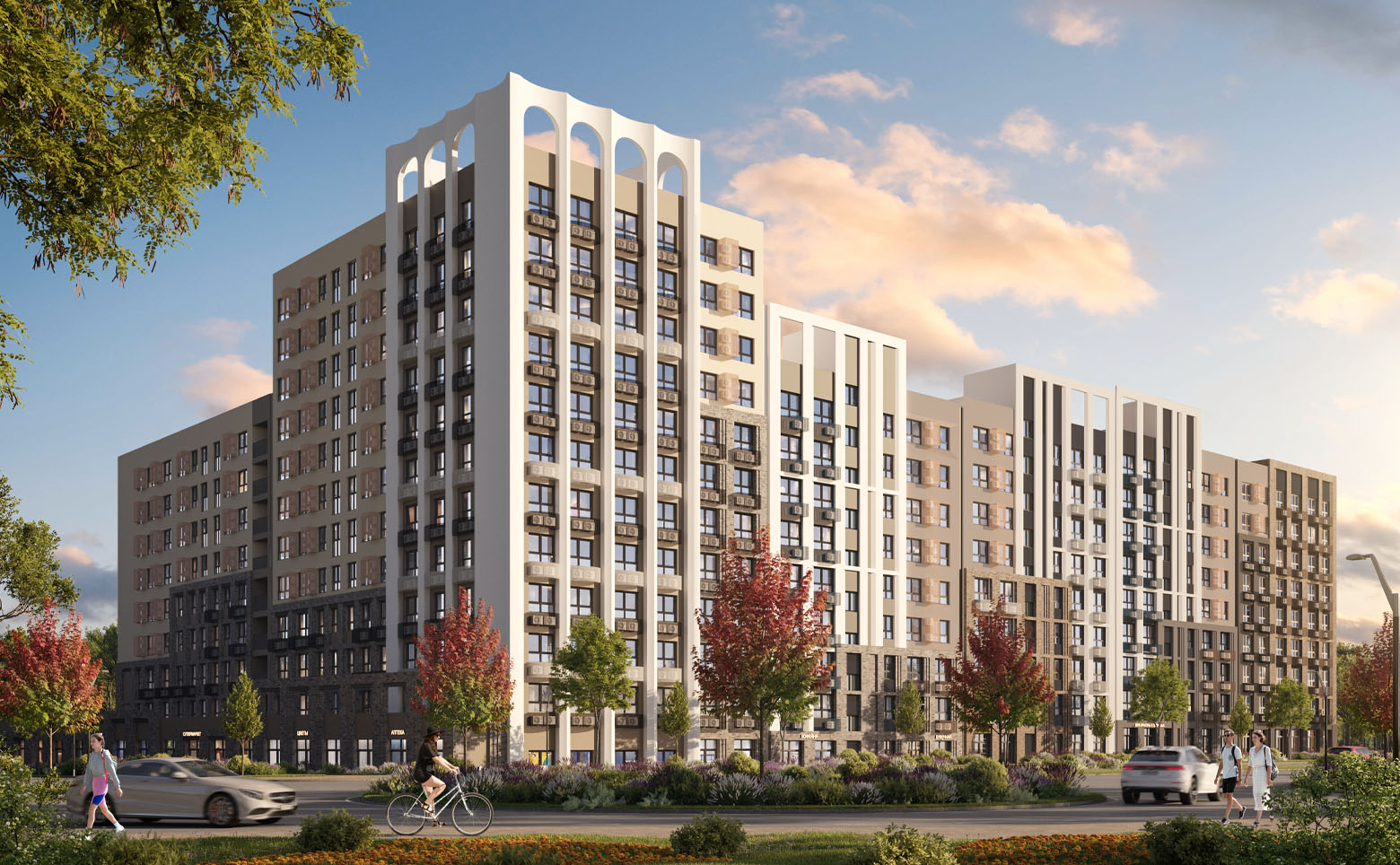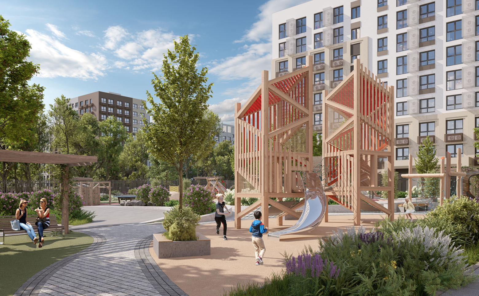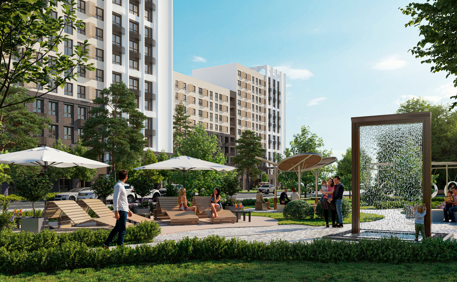 Территория комплекса благоустроена и озеленена. Во дворе спроектированы безопасные детские и спортивные площадки с тренажерами и многофункциональными воркаут-комплексами, предусмотрены зоны отдыха и барбекю, а также зона для выгула собак. На территории комплекса возведена школа и 2 детских сада. Для владельцев автомобилей предусмотрен подземный паркинг.