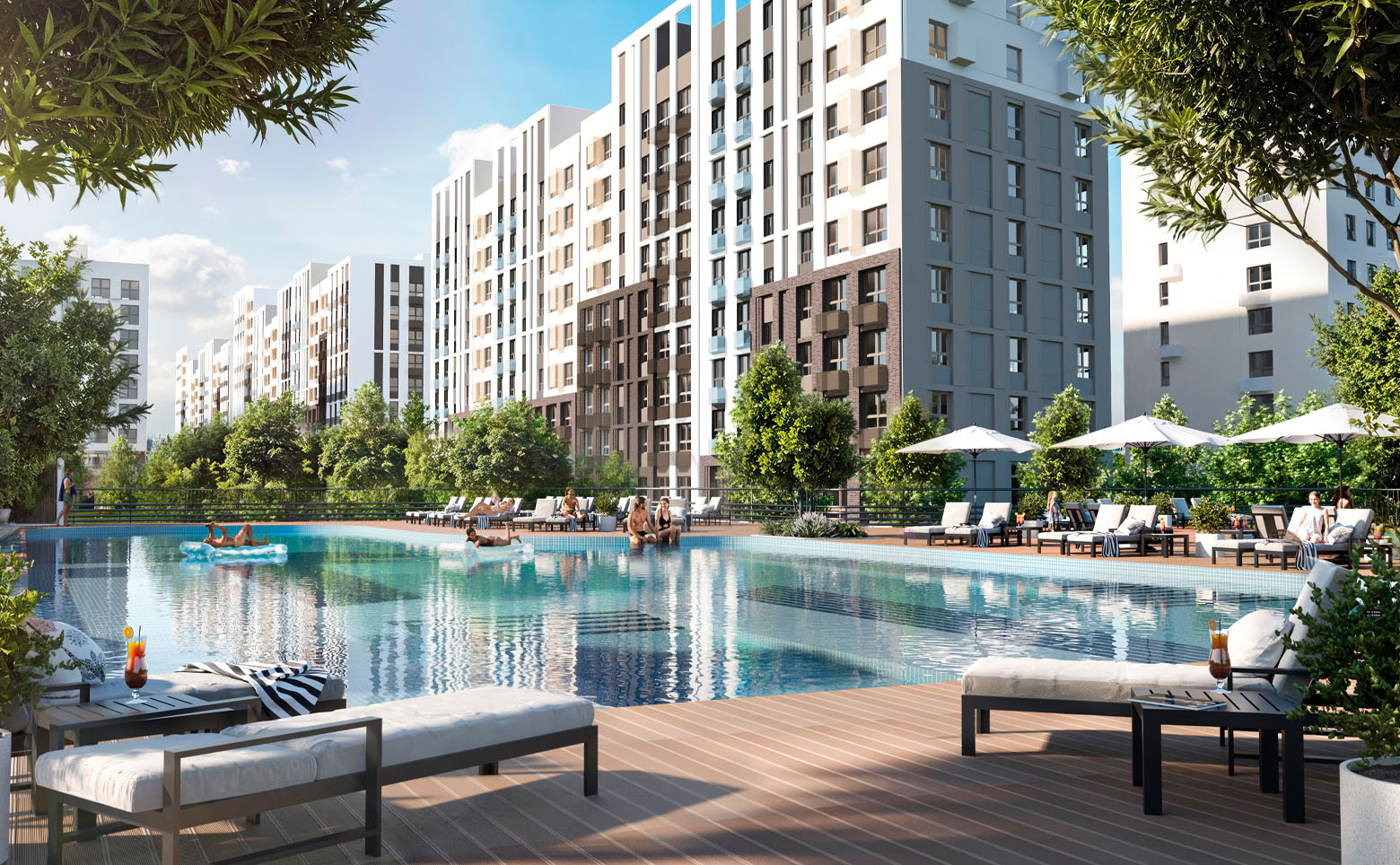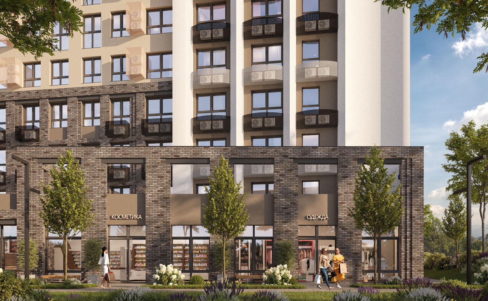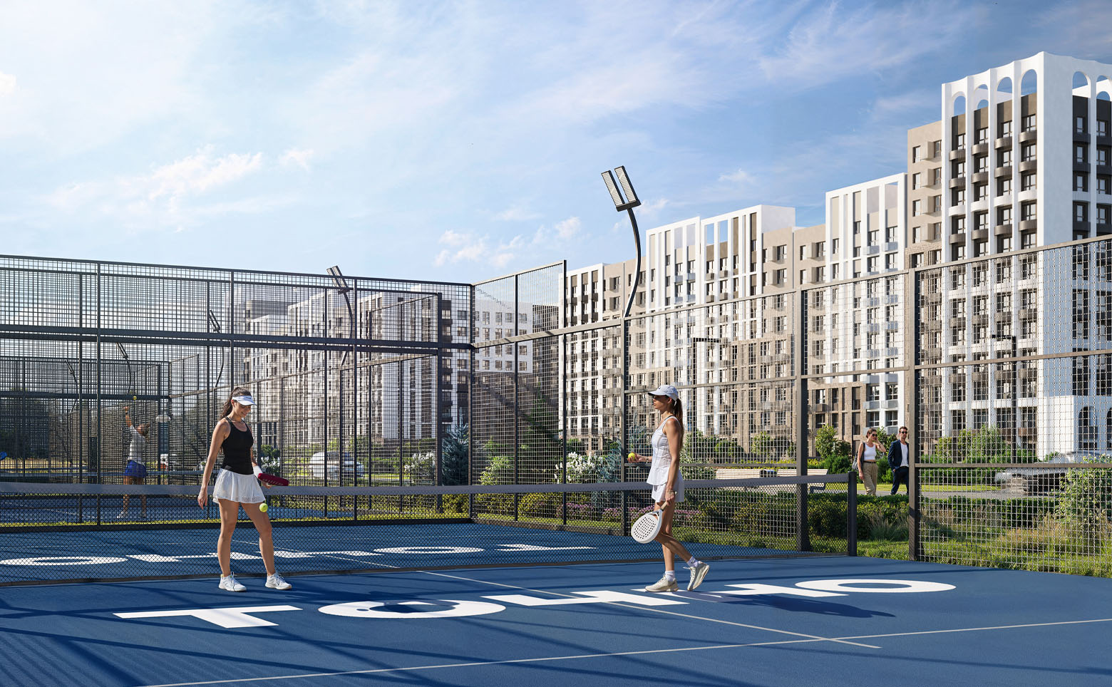 Территория комплекса благоустроена и озеленена. Во дворе спроектированы безопасные детские и спортивные площадки с тренажерами и многофункциональными воркаут-комплексами, предусмотрены зоны отдыха и барбекю, а также зона для выгула собак. На территории комплекса возведена школа и 2 детских сада. Для владельцев автомобилей предусмотрен подземный паркинг.