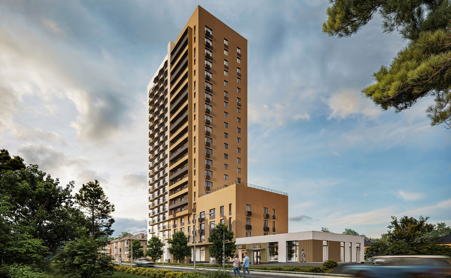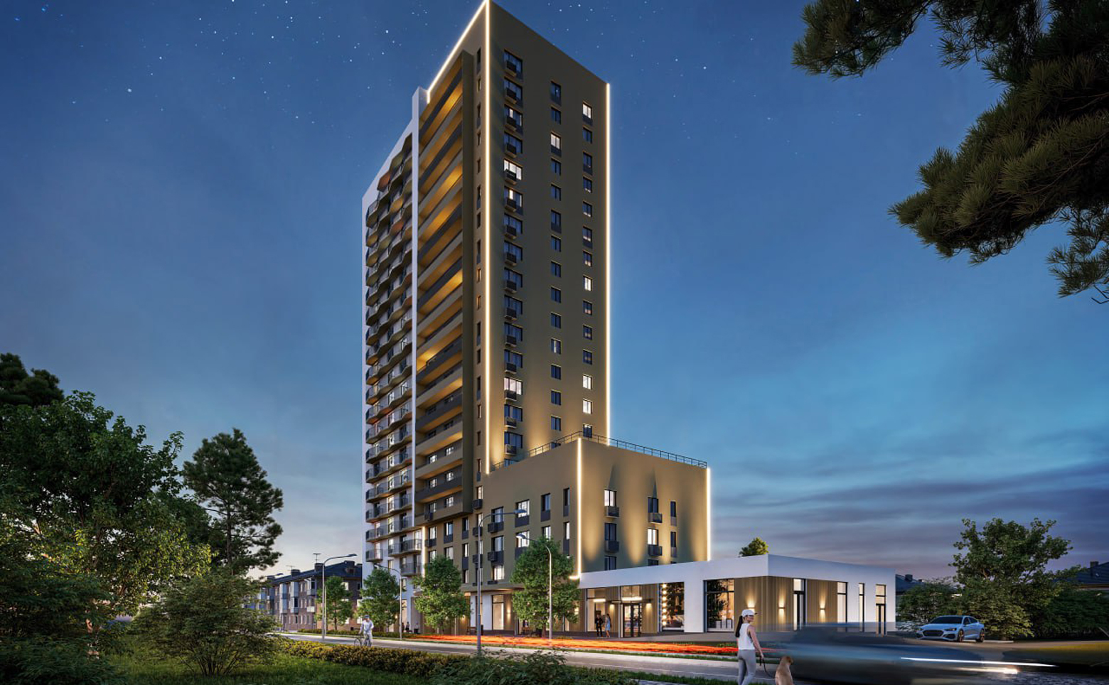 Во внутреннем дворе разноуровневое освещение территории: ландшафтное освещение и архитектурная подсветка фасадов. Закрытый двор размещен на крыше паркинга на уровне 2 этажа. На нем расположены зоны для отдыха и коворкинга, предусмотрены спортивные площадки. На территории ведется круглосуточное видеонаблюдение. На первом этаже расположены коммерческие помещения. Для владельцев автомобилей предусмотрен подземный паркинг.
