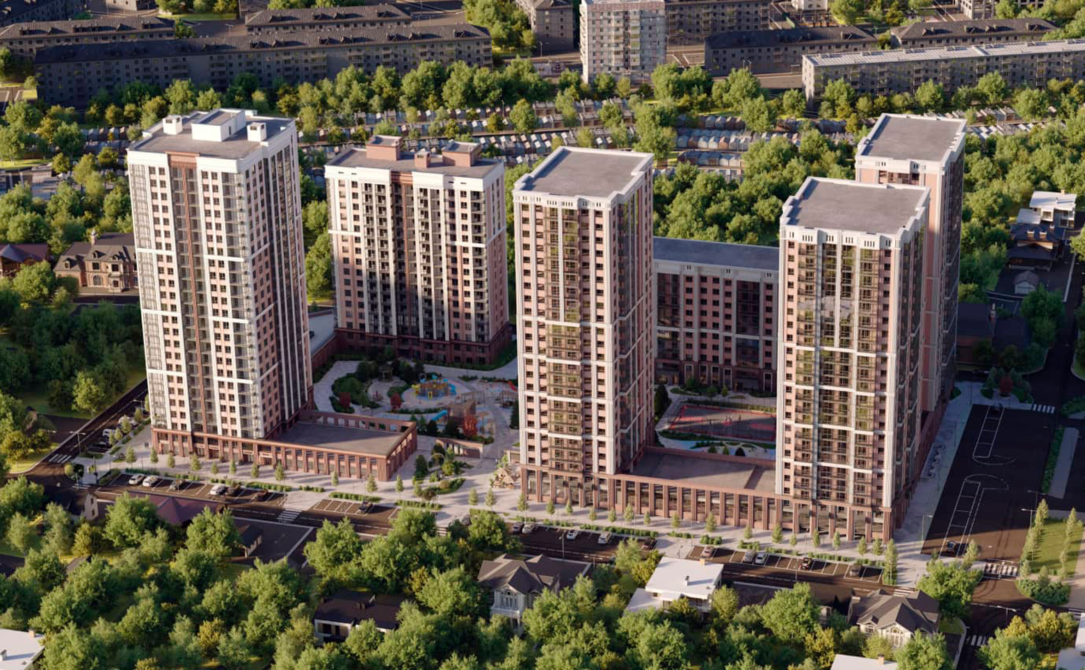 Жилой комплекс состоит из 4 домов высотой от 10 до 23 этажей, возведенных по кирпично-монолитной технологии. Здания оснащены большими окнами, их фасады облицованы кирпичом в бежево-коричневых тонах. В комплексе — уютное дизайнерское лобби с зонами для ожидания, колясочной, кладовыми и скоростными лифтами.
