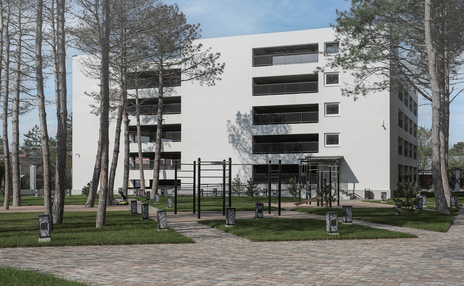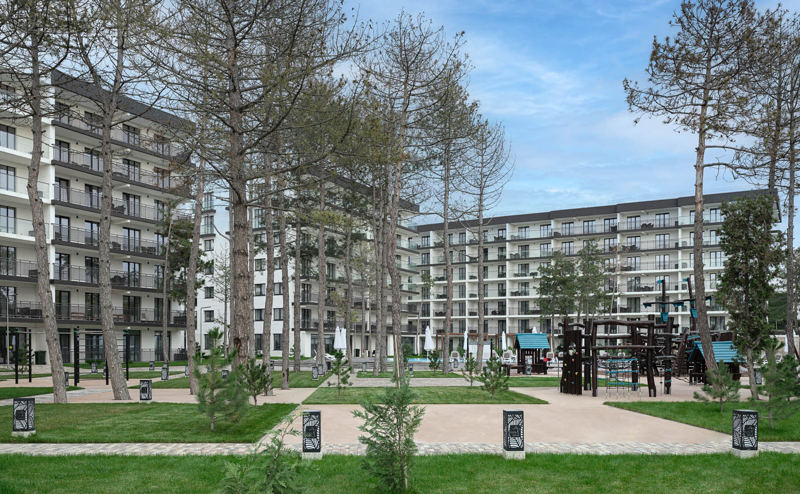 Территория комплекса закрыта и оснащена круглосуточным видеонаблюдением с доступом через мобильное приложение, также доступен беспроводной интернет. Для автомобилей предусмотрен многоуровневый паркинг. Между жилыми линиями расположен зеленый сквер и двор-сад с подогреваемым бассейном и детской зоной. Бассейн идет с отделкой под каррарский мрамор и системой очистки без хлорсодержащих препаратов. Выполнено озеленение с сохранением реликтовых сосен, кустарниками-изгородями, цветниками и разнотравьем. На территории работают детский центр и фитнес-клуб, на крыше одного из корпусов расположен ресторан, на первых этажах размещены коммерческие помещения.