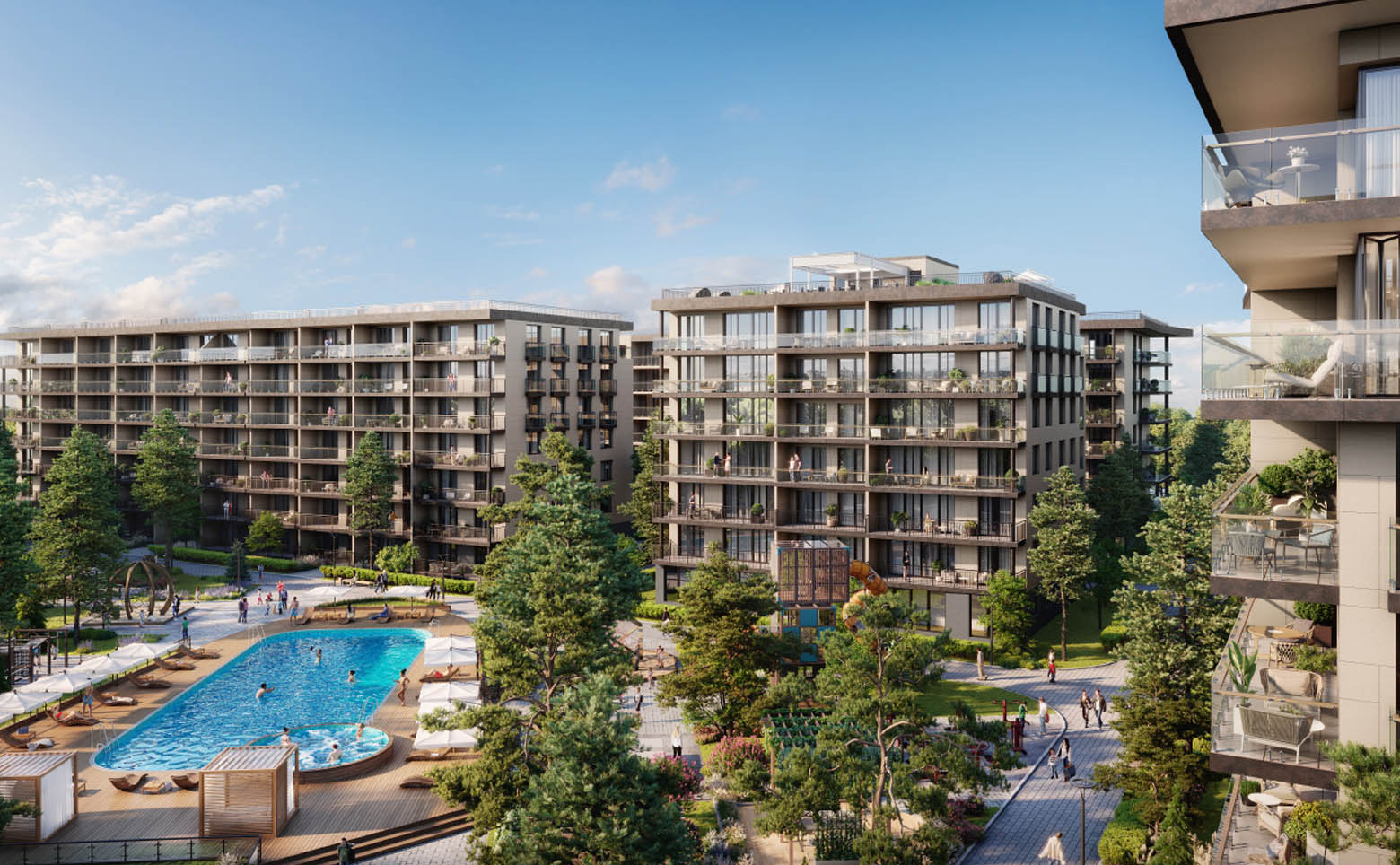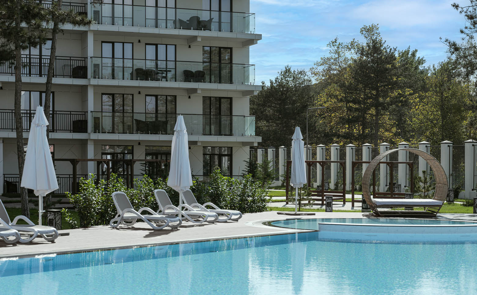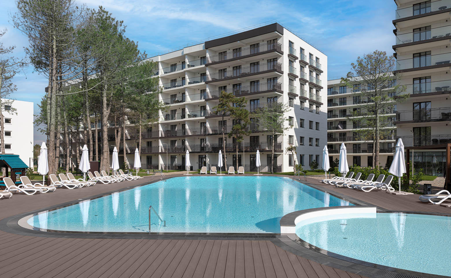 В составе комплекса представлены студии и апартаменты с 1–3 комнатами. Все апартаменты оснащены балконами или террасами, предусмотрены трассы для установки сплит-систем и места для наружных блоков на балконах и террасах. Установлены панорамные окна с серебряным напылением с повышенной свето- и звукоизоляцией. В корпусах А и Б доступны апартаменты с видом на Чембурское озеро, в корпусах Г и Д — с видом на внутренний двор-парк. Квартиры передаются с мягкой мебелью.