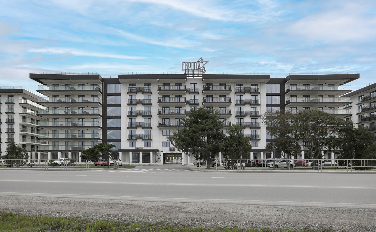 Клубная резиденция состоит из 5 корпусов высотой 7 этажей. Здания возведены по монолитной технологии, в облицовке фасадов использованы бельгийские фиброцементные плиты кремово-белого цвета и алюминиевые композитные панели. В архитектуре используется открытая эвакуационная лестница с имитацией кортена. В проекте предусмотрена собственная водонасосная станция с системой предварительной фильтрации воды, установлены бесшумные лифты. В лобби предусмотрены зоны ожидания, колясочные, помещения для хранения багажа и санузлы.