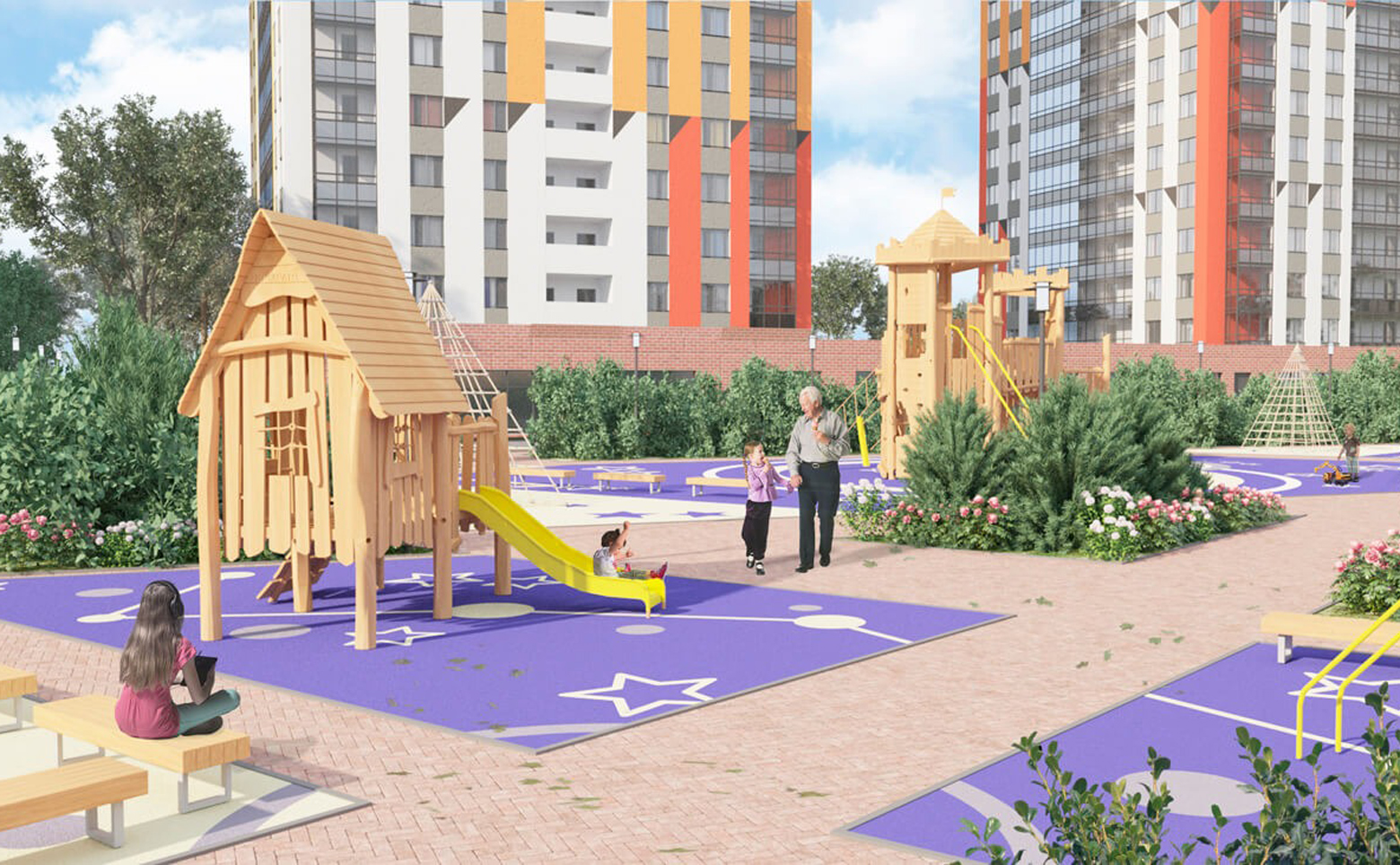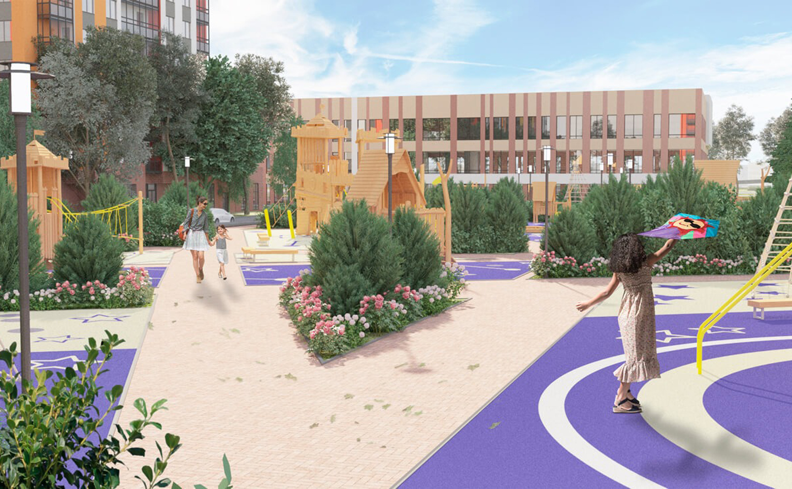 Отличительной чертой проекта является аллея Космонавтов, которую украшают полувековые ели. Предусмотрены несколько детских площадок, выполненных в космической тематике, спортивные площадки для любителей активного образа жизни, зоны отдыха и пешеходные аллеи. Доступ на территорию двора есть только у жителей жилого комплекса. Для владельцев автомобилей предусмотрена стоянка.