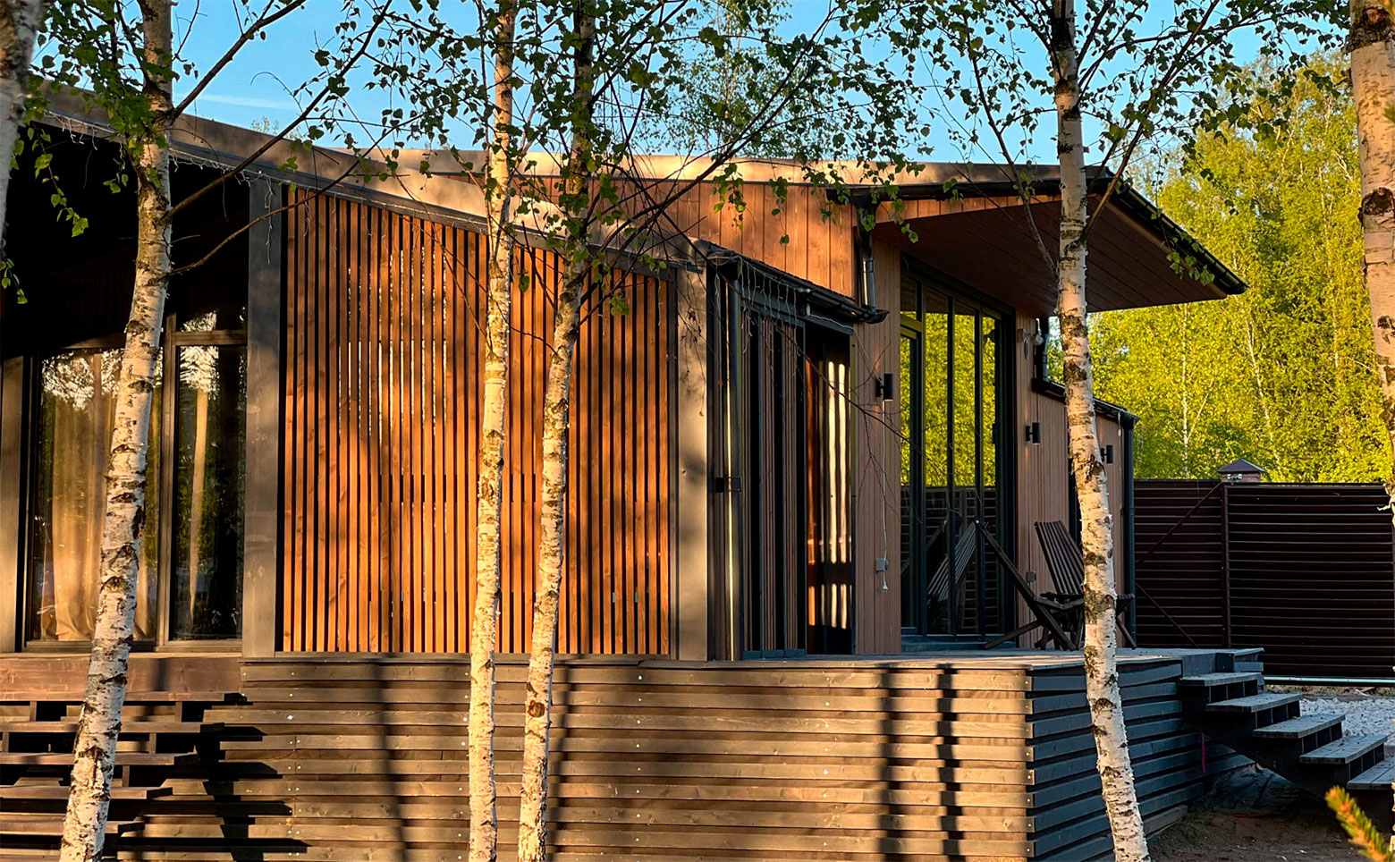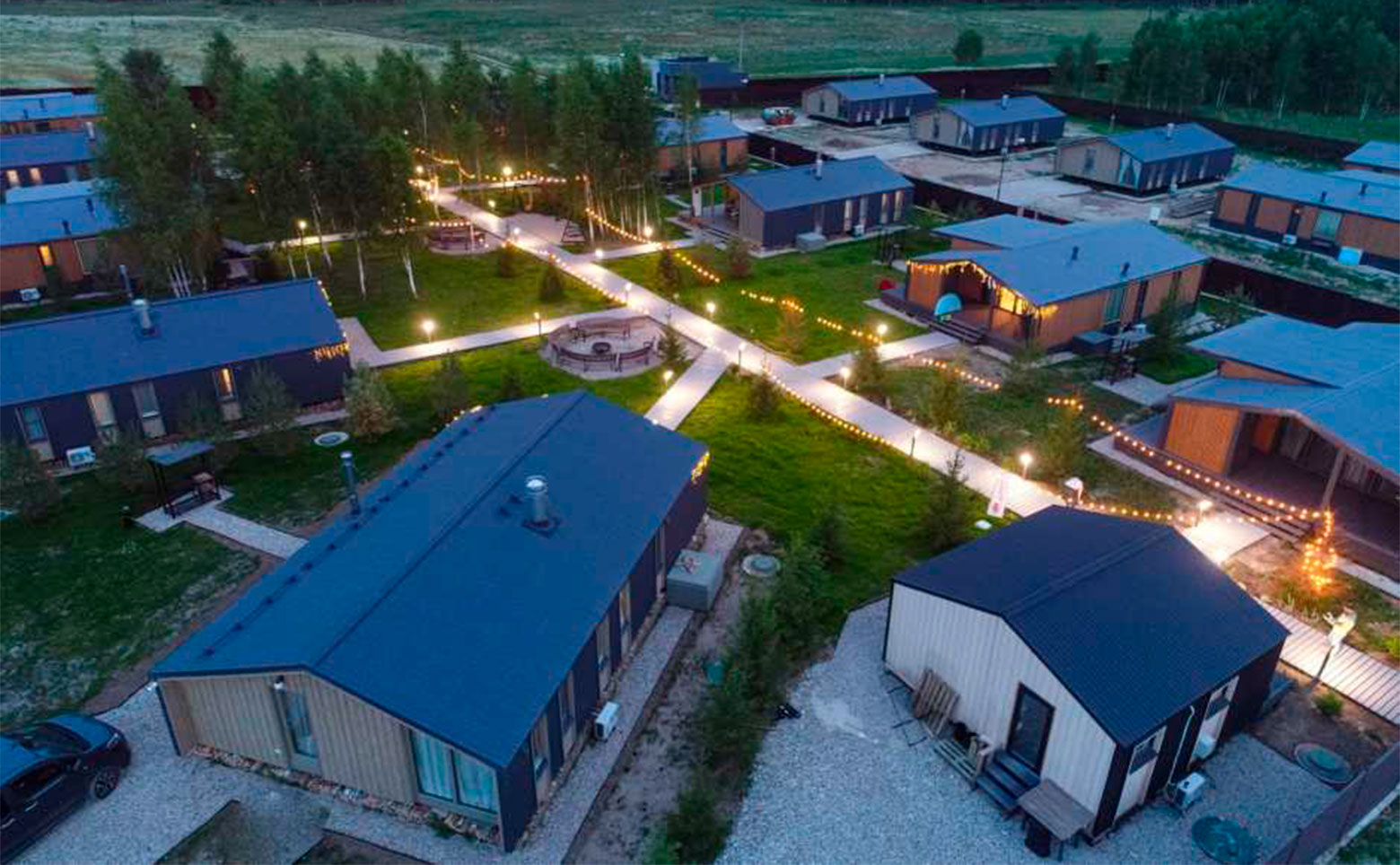 В проекте предлагаются коттеджи с панорамными и увеличенными окнами, а также окнами в ванных комнатах. Дома полностью меблированы в стиле фьюжн. В базовую комплектацию входит сауна, большая веранда, шкафы, кровати, обеденная зона, диван и кухонный гарнитур с техникой. Также предусмотрены беспроводной интернет, лапомойка, парковка на 2 автомобиля, уличная мебель и большой крытый мангал.