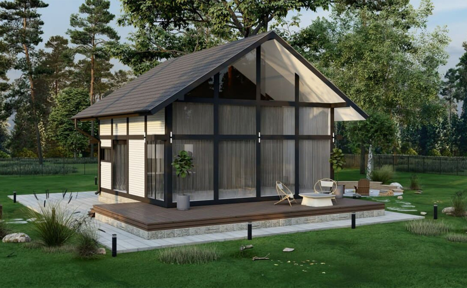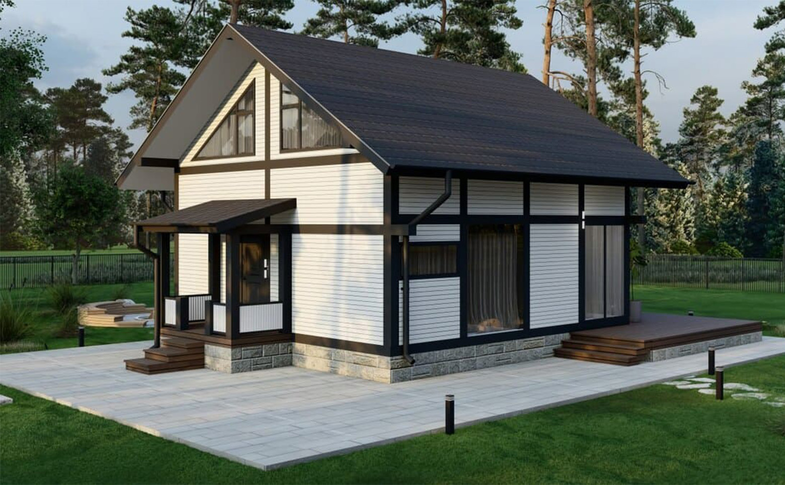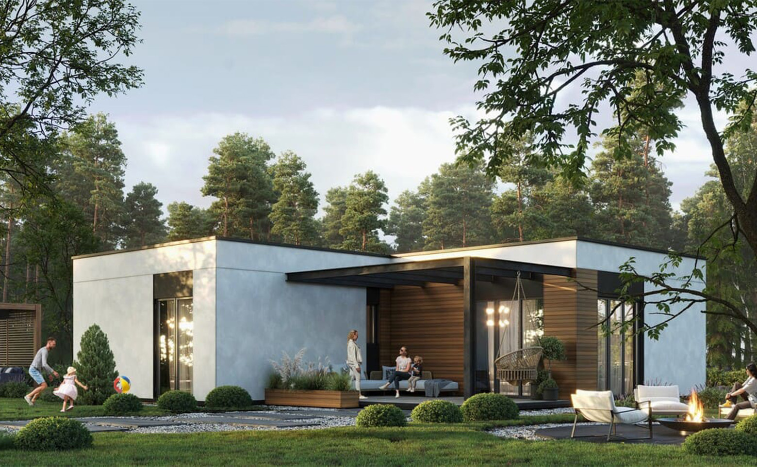 В проект включены зоны для отдыха, детские и спортивные площадки, которые аккуратно интегрированы в рядом растущий лес. Детский игровой городок сделан из деревянных и безвредных материалов, а лаунж-зоны выполнены в экостиле. В коттеджном поселке предусмотрен пункт охраны и шлагбаум.