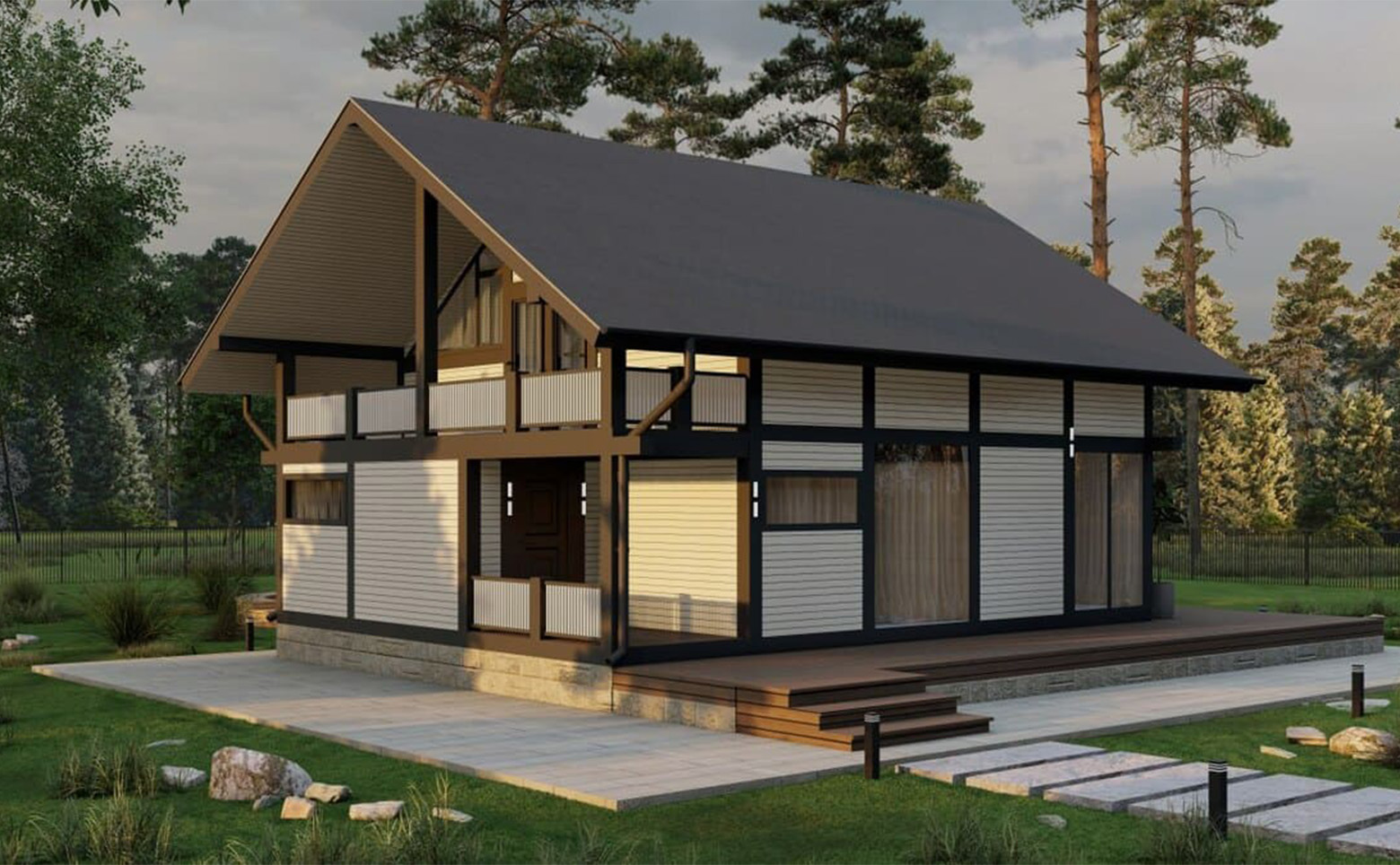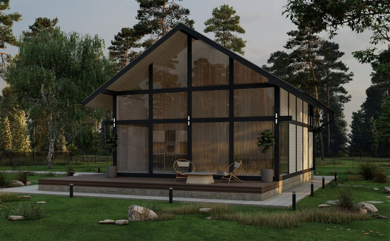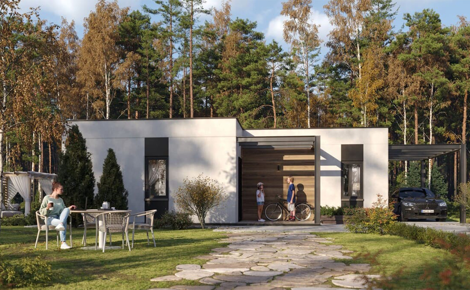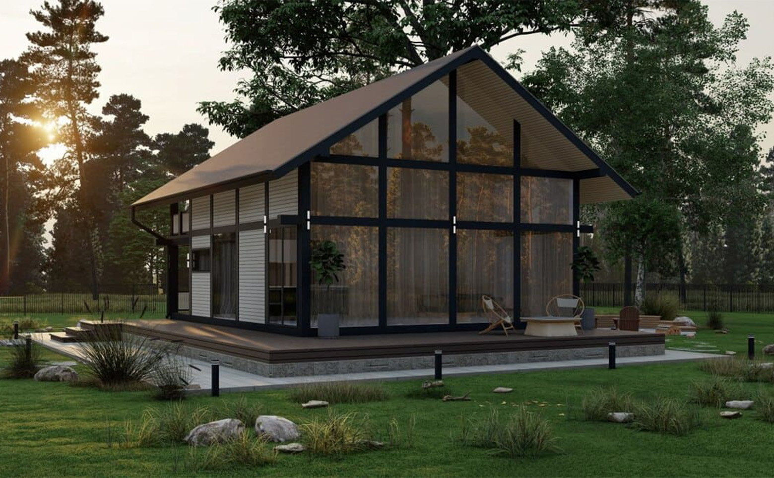 В проект включены зоны для отдыха, детские и спортивные площадки, которые аккуратно интегрированы в рядом растущий лес. Детский игровой городок сделан из деревянных и безвредных материалов, а лаунж-зоны выполнены в экостиле. В коттеджном поселке предусмотрен пункт охраны и шлагбаум.