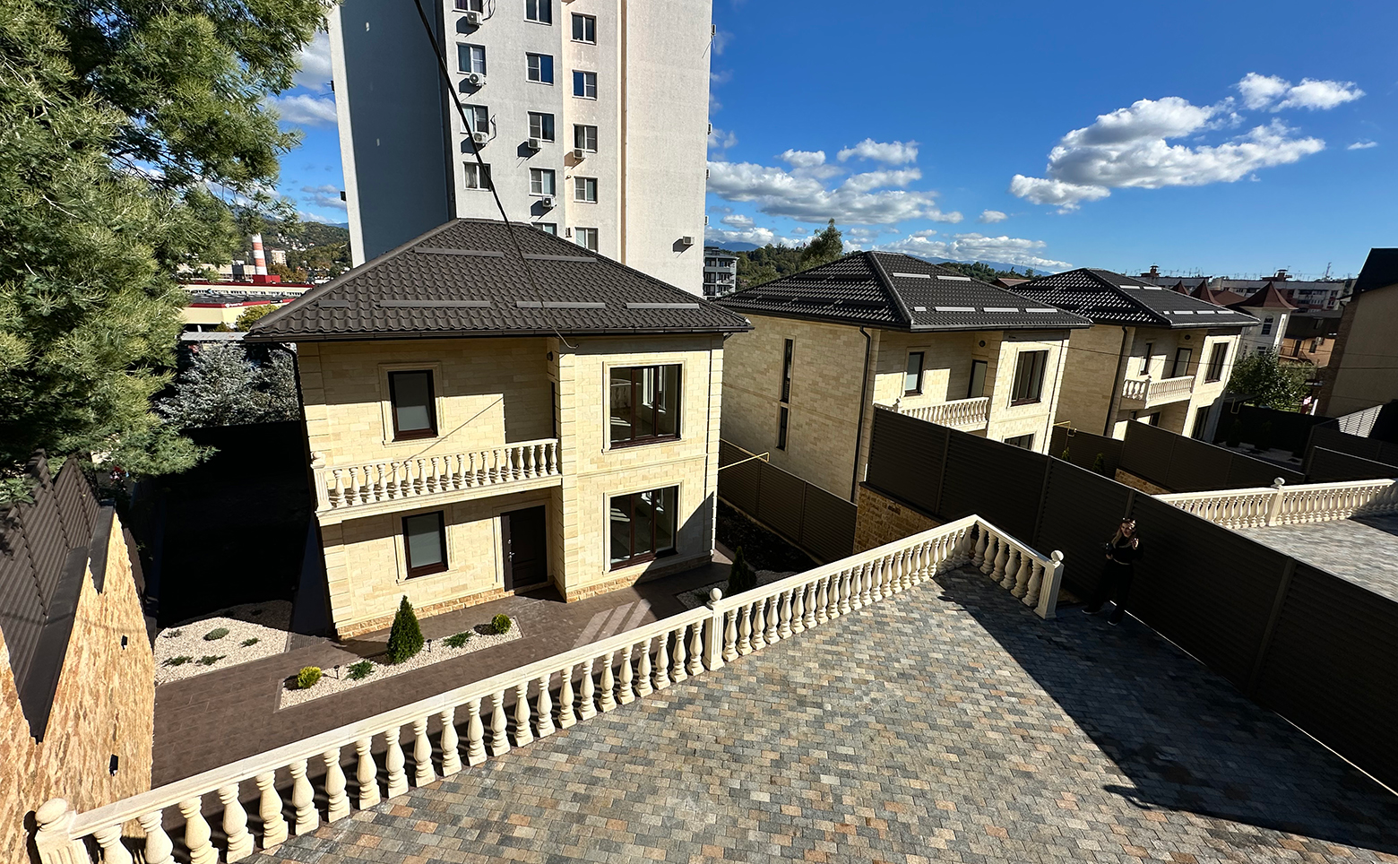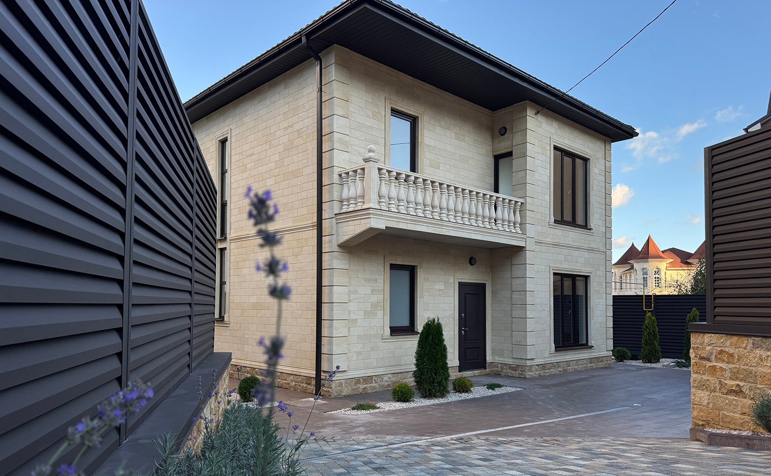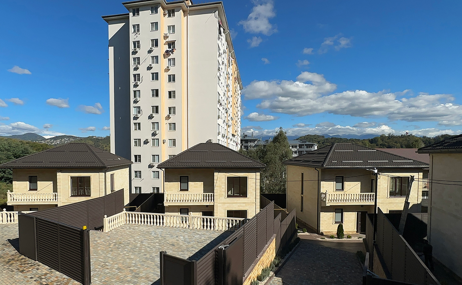 Коттеджный поселок расположен на участке площадью 25 соток и состоит из 4 отдельно стоящих домов в едином архитектурном стиле. Здания возведены по монолитной технологии с использованием газобетона, что обеспечивает отличную звукоизоляцию. Фасады облицованы натуральным дагестанским камнем — прочным, долговечным и эстетичным материалом.