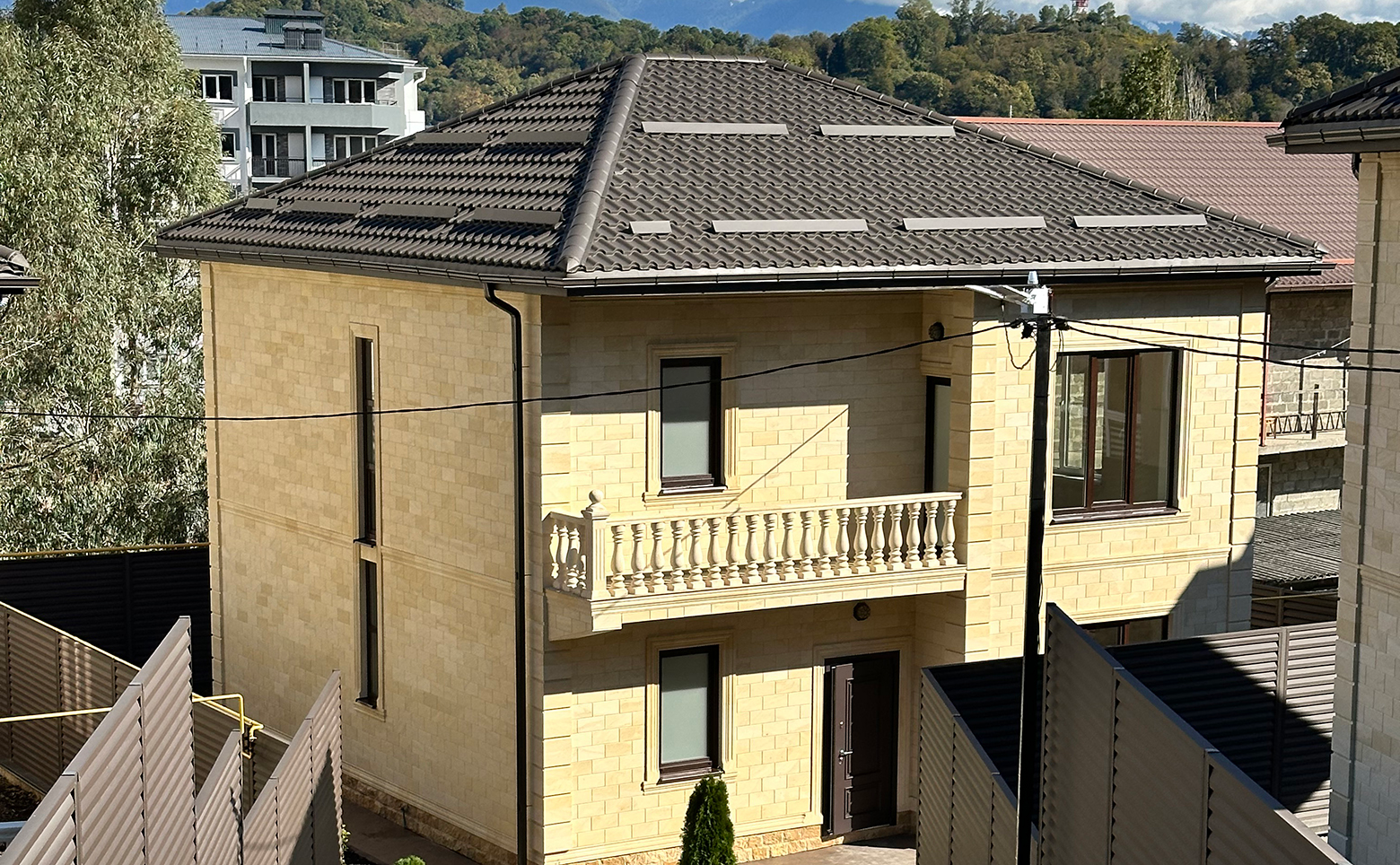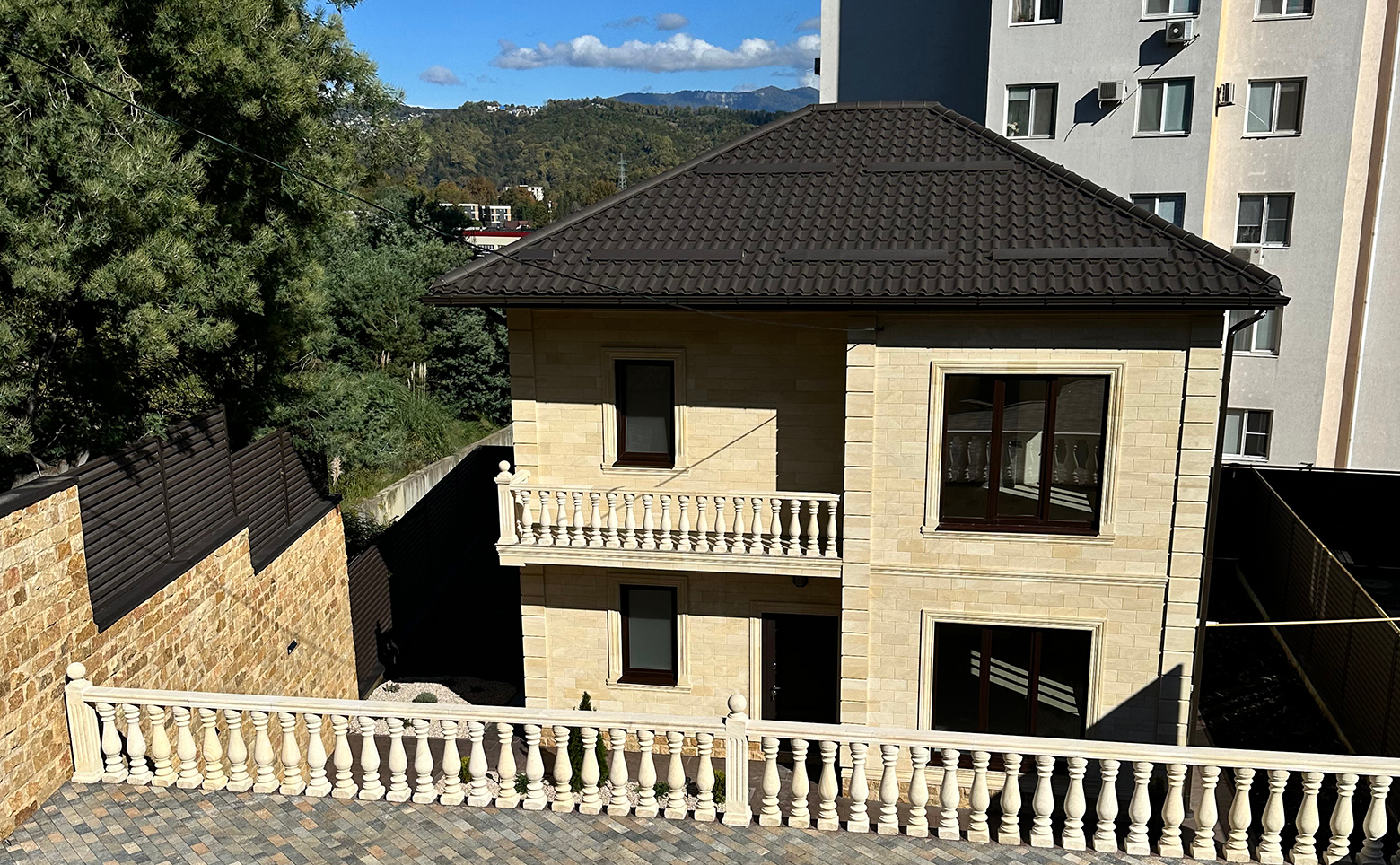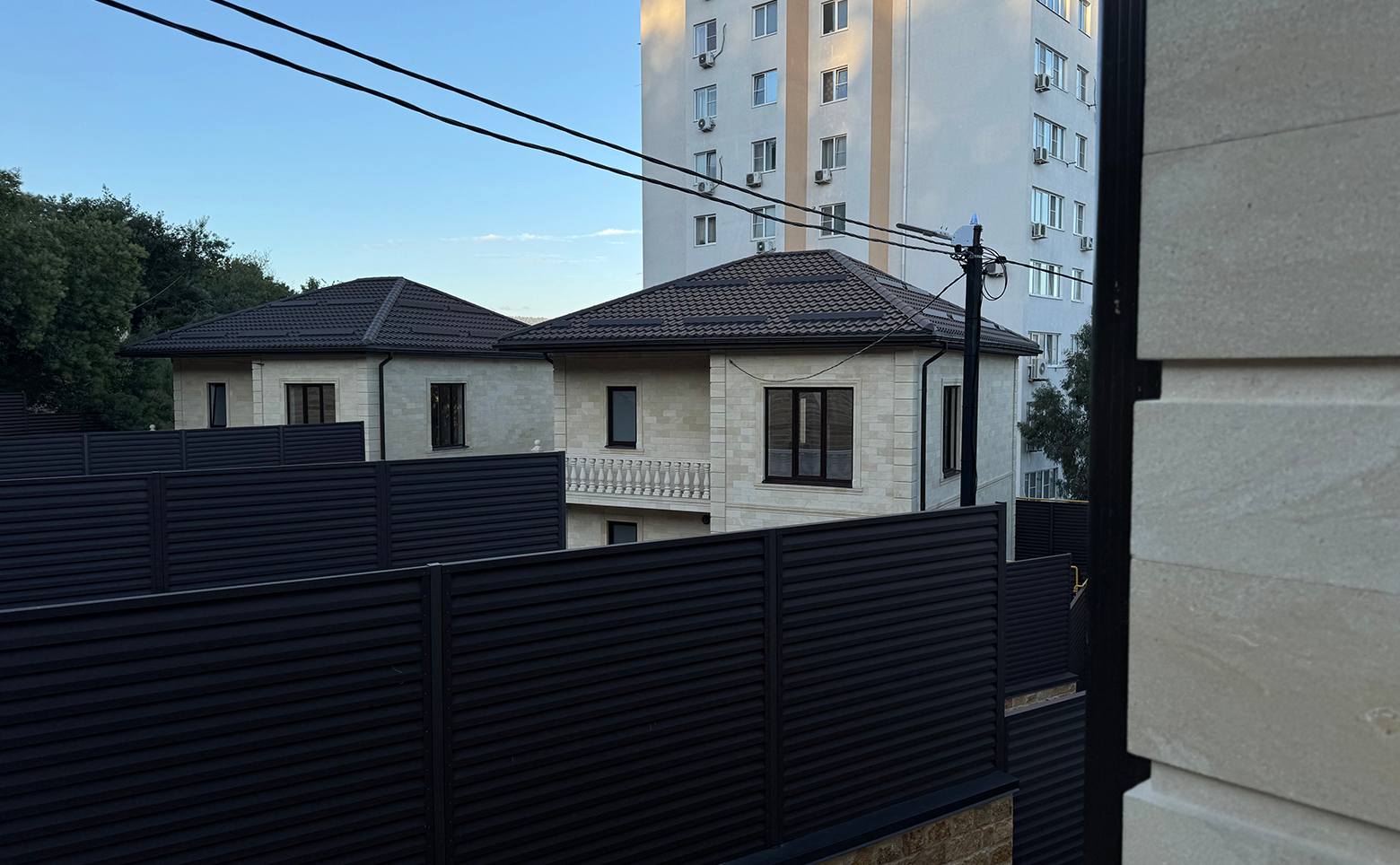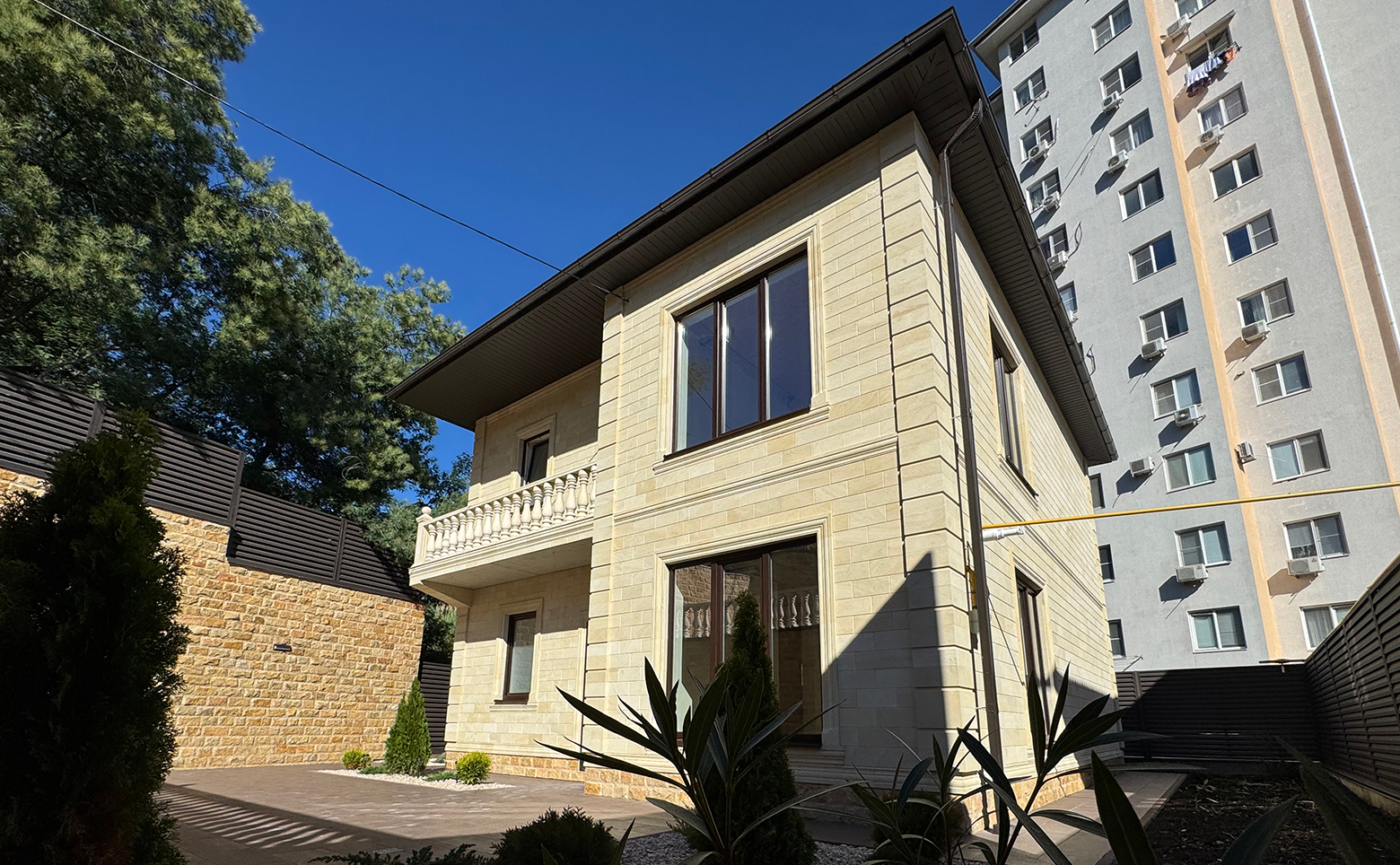 Коттеджный поселок расположен на участке площадью 25 соток и состоит из 4 отдельно стоящих домов в едином архитектурном стиле. Здания возведены по монолитной технологии с использованием газобетона, что обеспечивает отличную звукоизоляцию. Фасады облицованы натуральным дагестанским камнем — прочным, долговечным и эстетичным материалом.