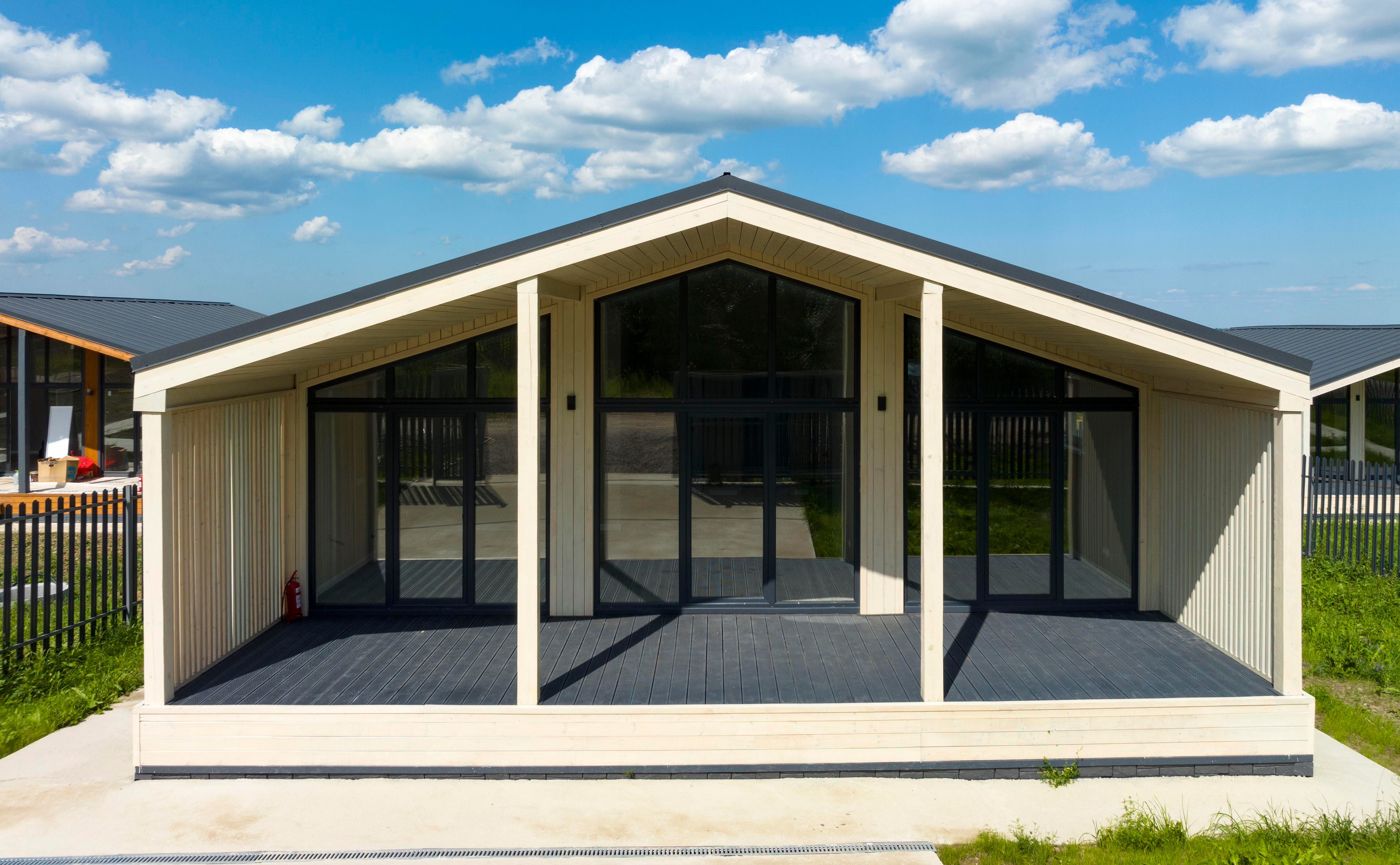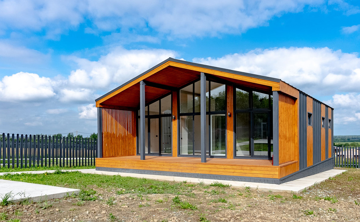 В проекте предлагаются коттеджи площадью 114,41 кв. м. Планировка включает 3 спальни и кухню-гостиную. Установлены панорамные окна, а также окна в ванной комнате. Высота потолков составляет 4,5 м. Дома передаются с чистовой отделкой: пол выложен ламинатом, стены оклеены обоями под покраску, потолки подвесные с осветительными элементами. Установлена сантехника. Во входном тамбуре уложена плитка. Кухня укомплектована кухонной техникой, включая варочную панель, духовой шкаф и вытяжку, также предусмотрены стол и 4 стула.