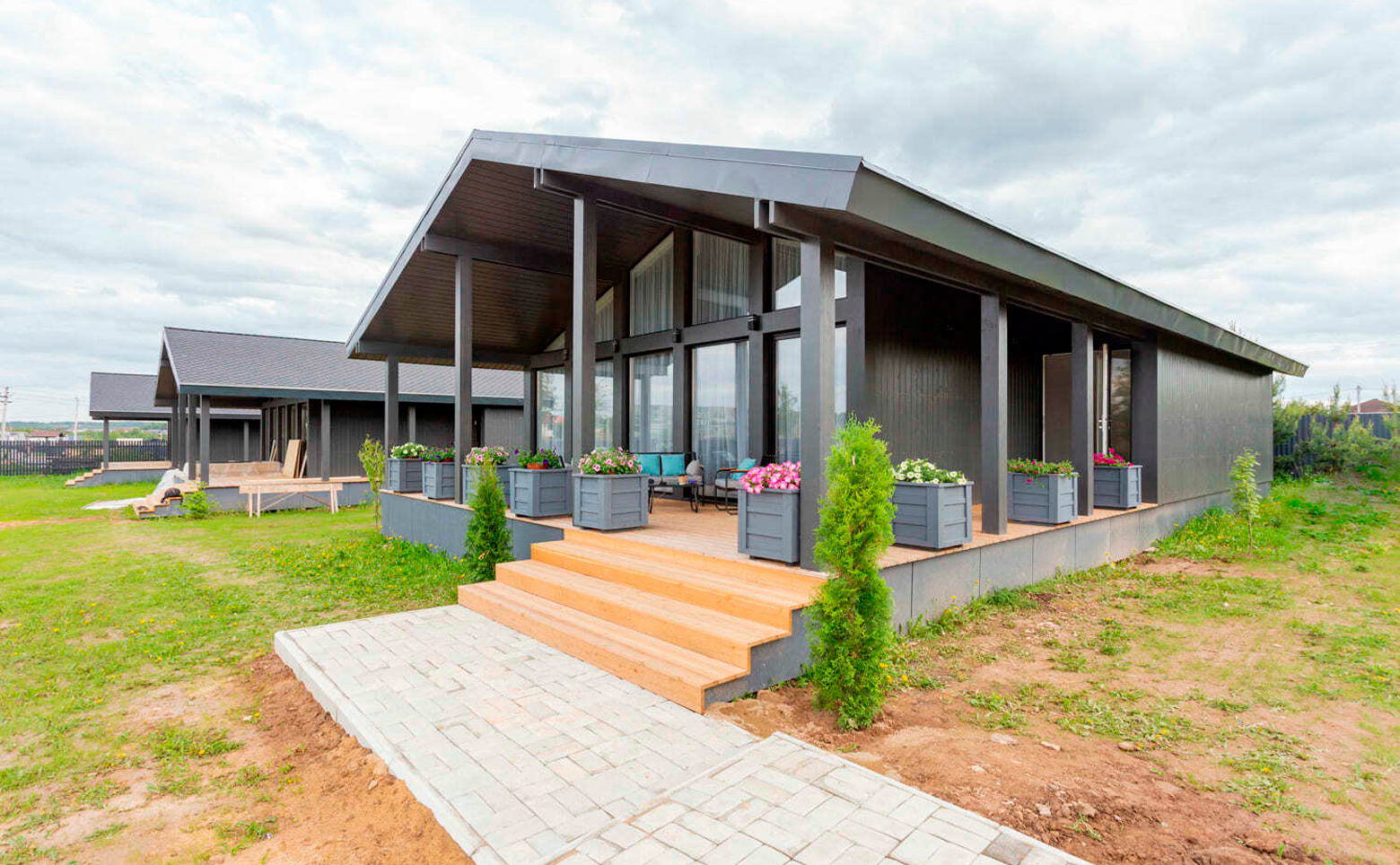 Проект представляет собой коттеджный поселок с участками от 6 соток и каркасными домами с фасадом, выполненным из дерева, построенными в едином архитектурном стиле.