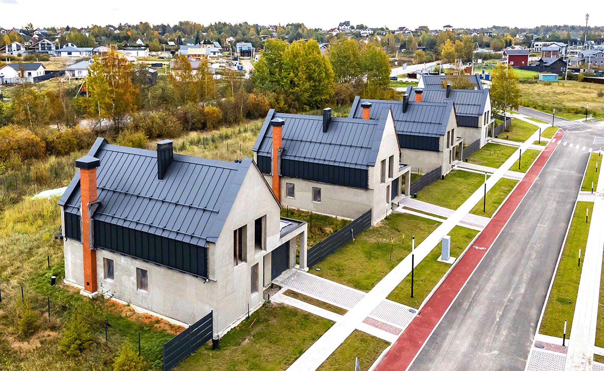 Коттеджный поселок включает линейку домов 6 разных типов, которые выполнены в едином стиле, вдохновленном архитектурой Дании. Стены домов построены из поризованного керамического кирпича, а фундамент выполнен в виде монолитной плиты для устойчивости дома. К каждому домовладению подведены подземные инженерные сети: газ, вода, электричество, оптоволоконный интернет.