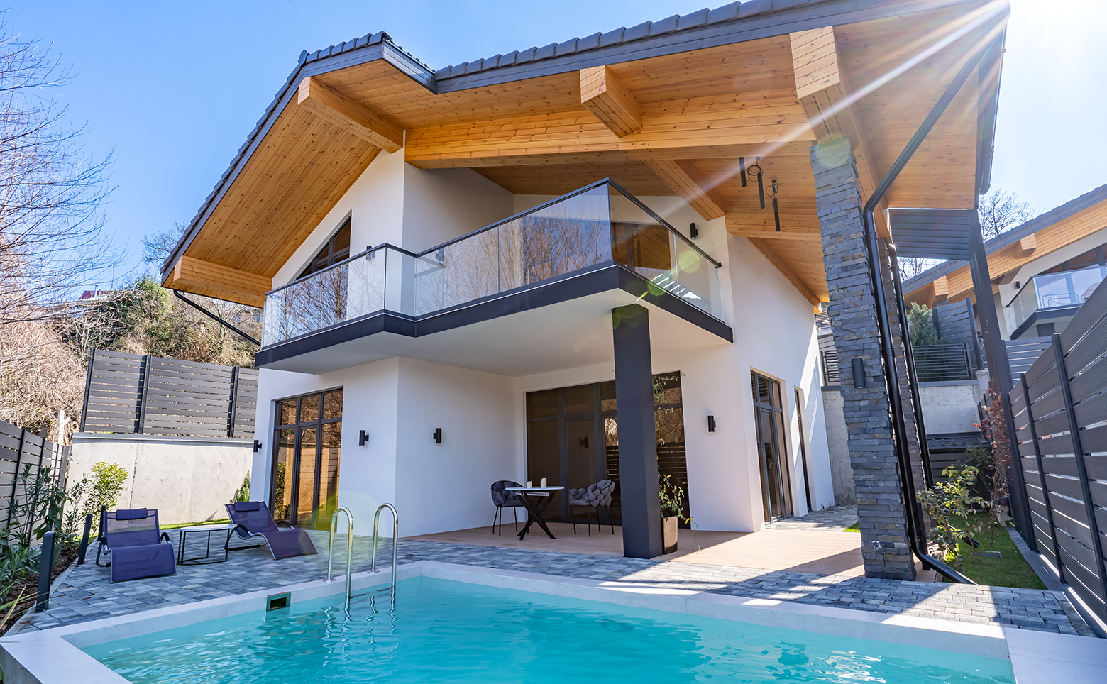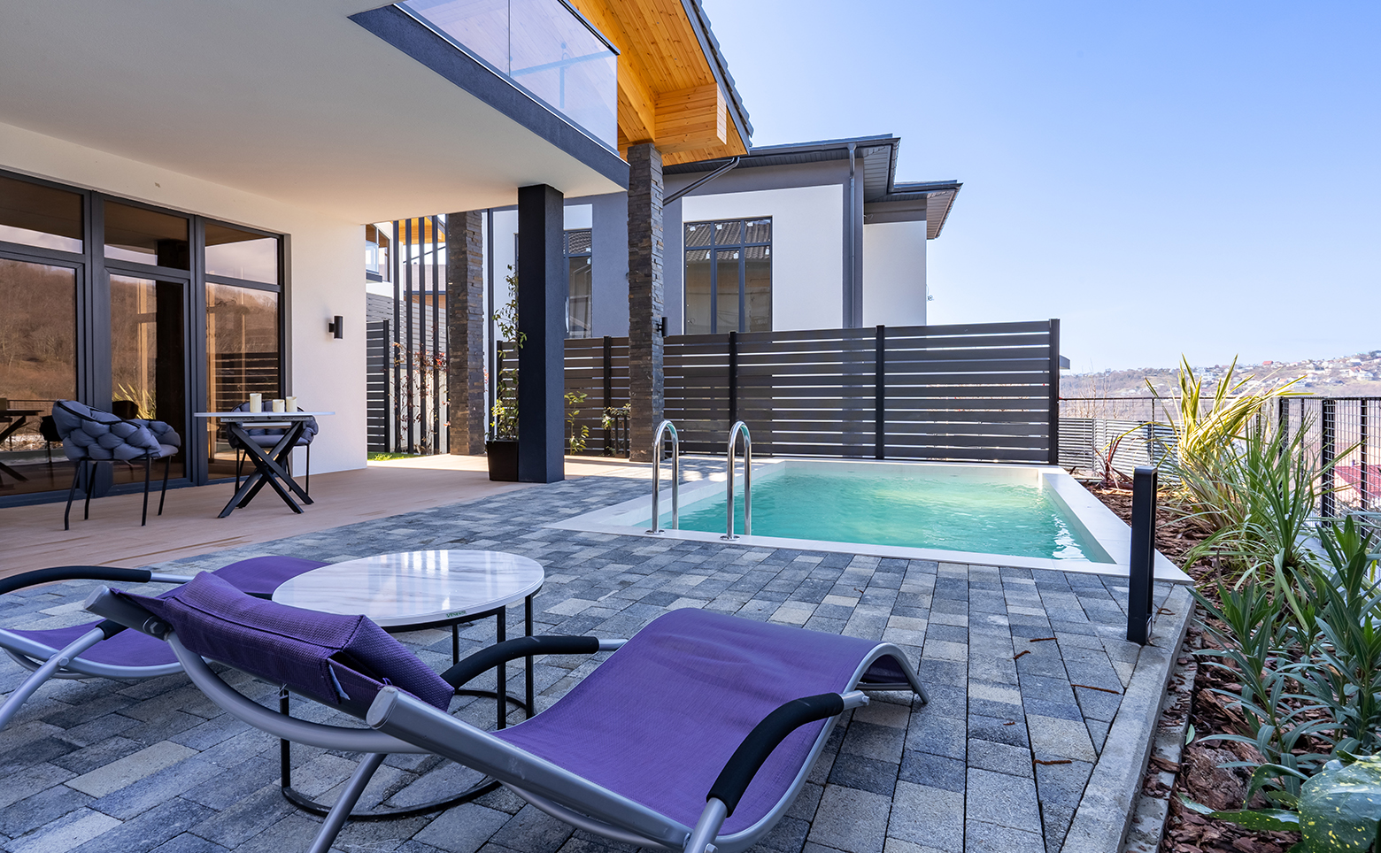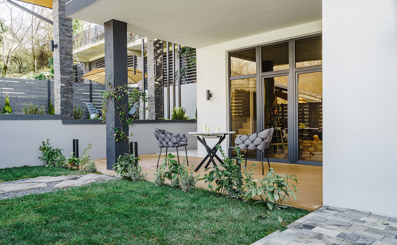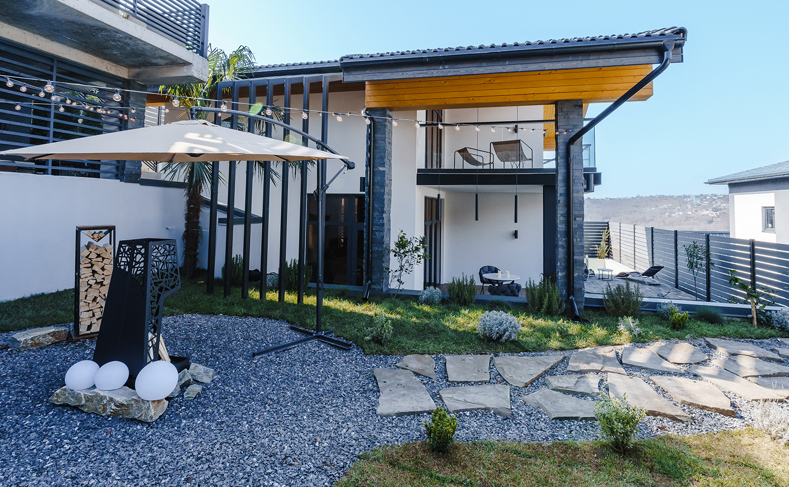 Дома расположены на участках ИЖС по 4 сотки, на которых выполнено озеленение территории, осуществляется круглосуточная ландшафтная подсветка. Спроектирована костровище, лаундж бэги, уличная мебель, подогреваемый бассейн с автодоливом и подсветкой. Доступ осуществляется с помощью биометрических замков с Face ID и доступом со смартфона. Для владельцев автомобилей предусмотрено парковочное место с электрическими откатными воротами.