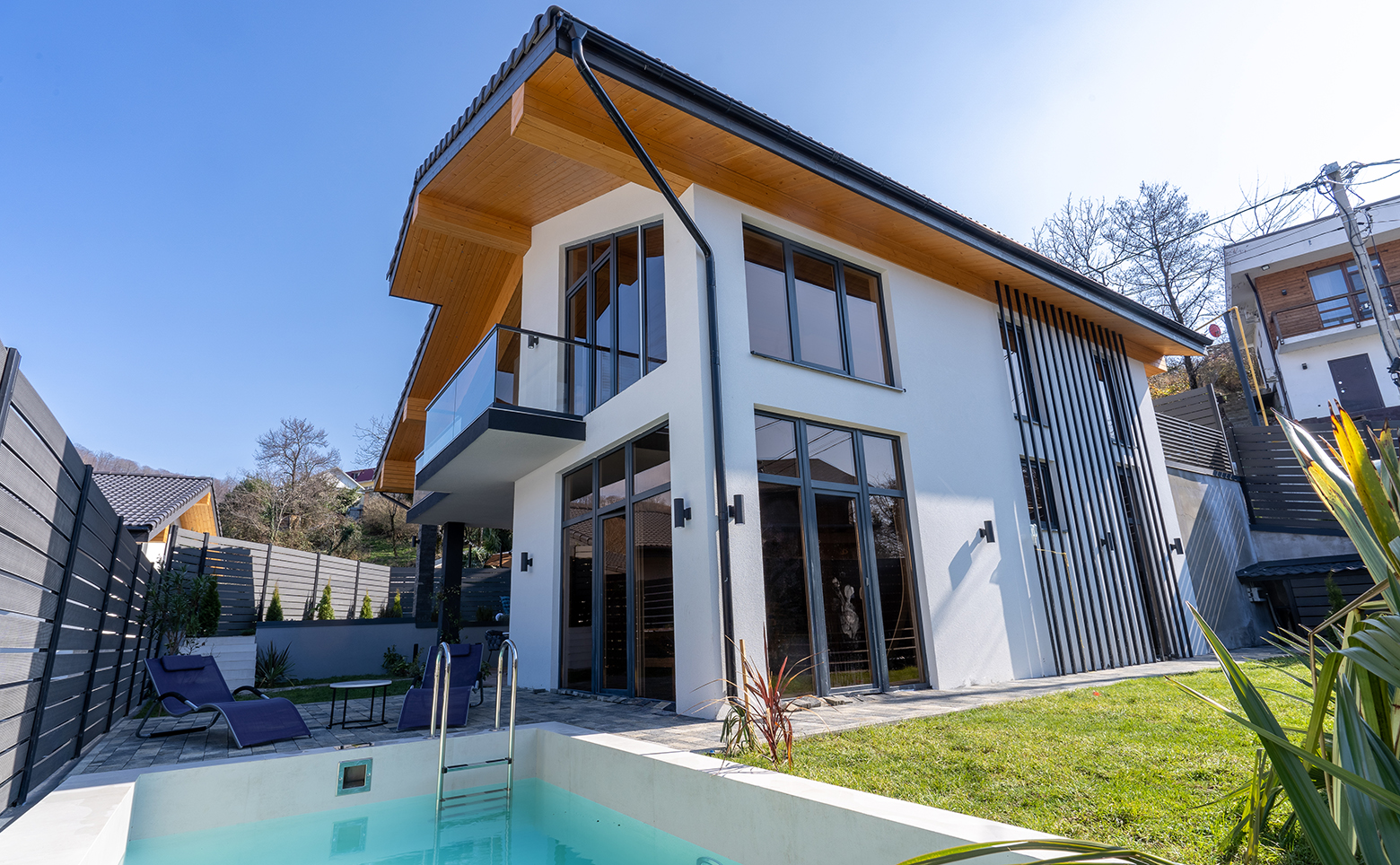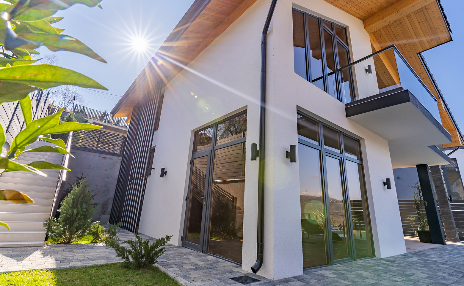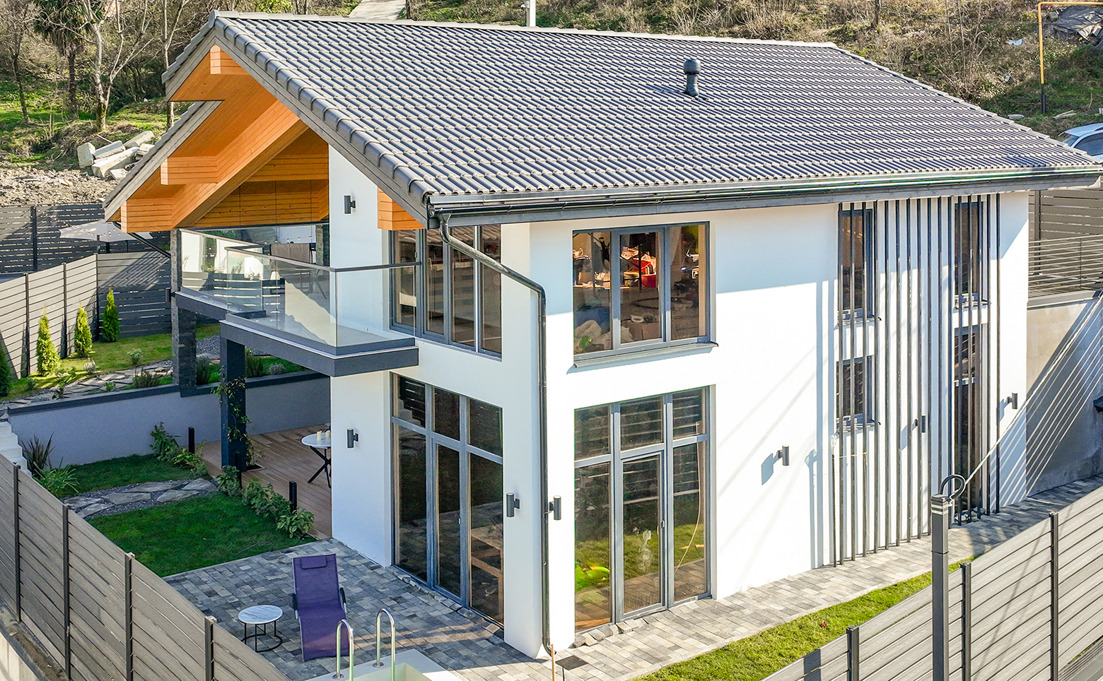 Проект состоит из 4 двухэтажных домов, построенных по монолитной технологии строительства. Фасад облицован двумя видами планкена и премиальной штукатуркой.