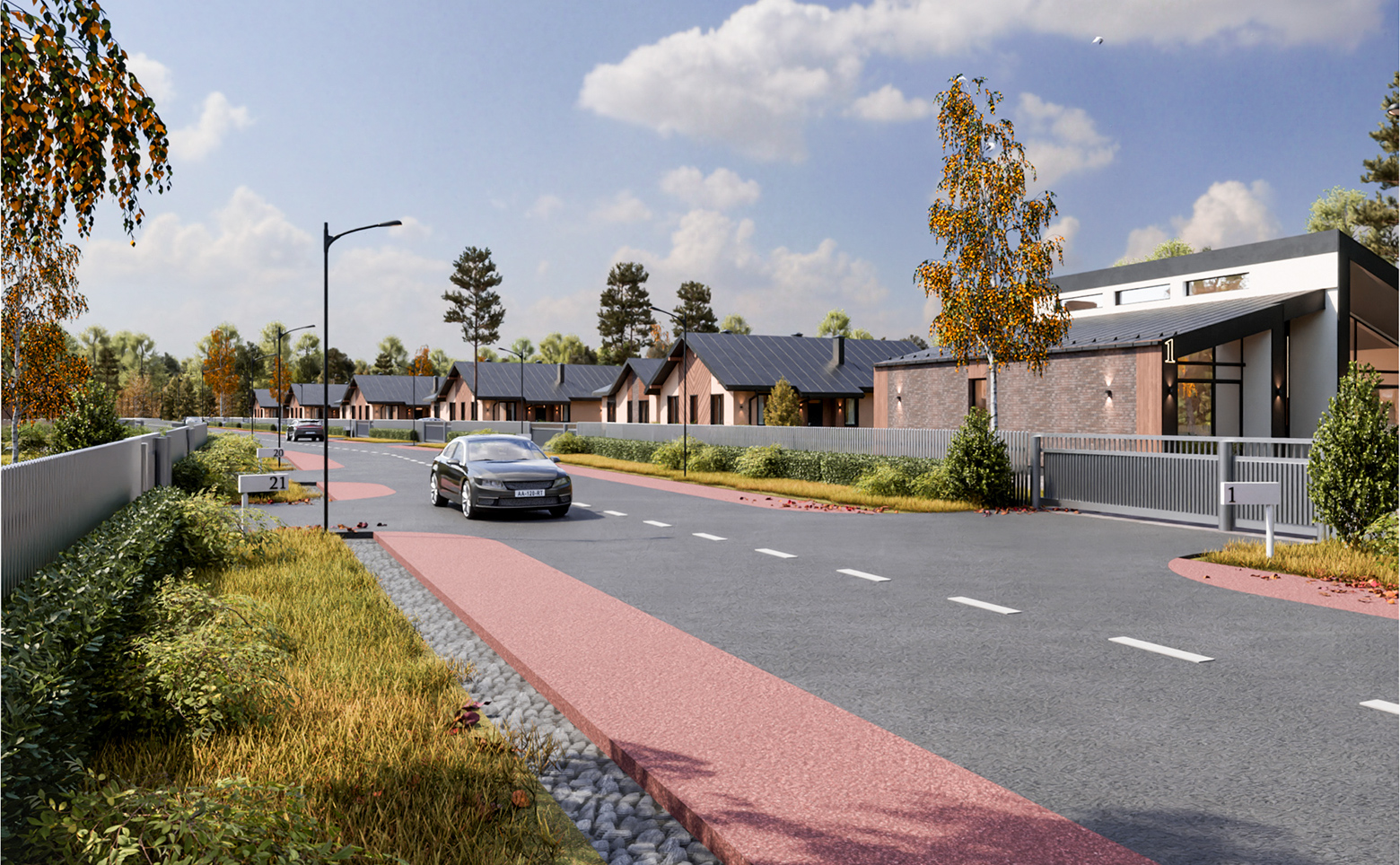 Территория поселка огорожена, имеет закрытый въезд и находится под видеонаблюдением. Внутри комплекса расположен парк с искусственным прудом, оборудована детская площадка. Проложена асфальтированная дорога, установлено освещение.