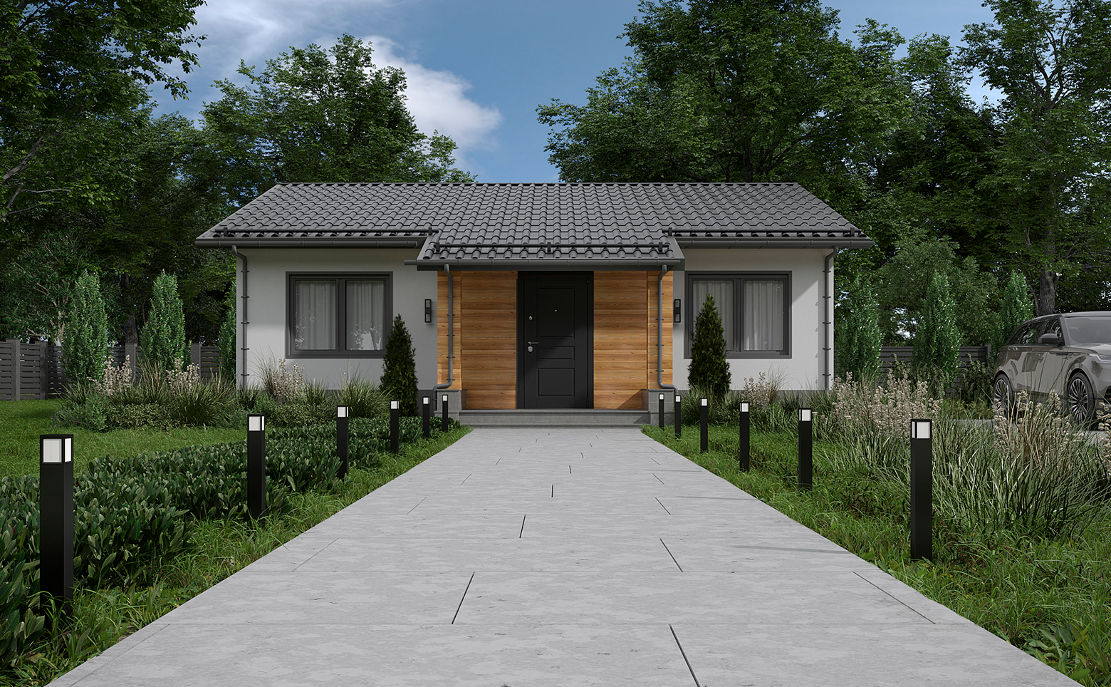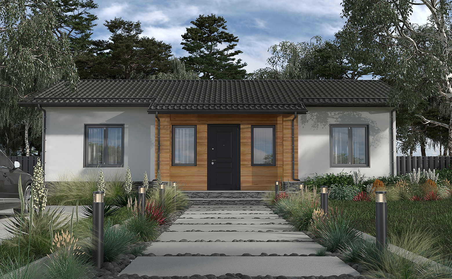 Коттеджный поселок состоит из 63 участков, где предлагаются как готовые варианты домов, так и возможность строительства собственного проекта. Здания возводятся из газобетона с отделкой фасадов штукатуркой. Архитектура выдержана в едином стиле и гармонично вписывается в окружающий ландшафт.