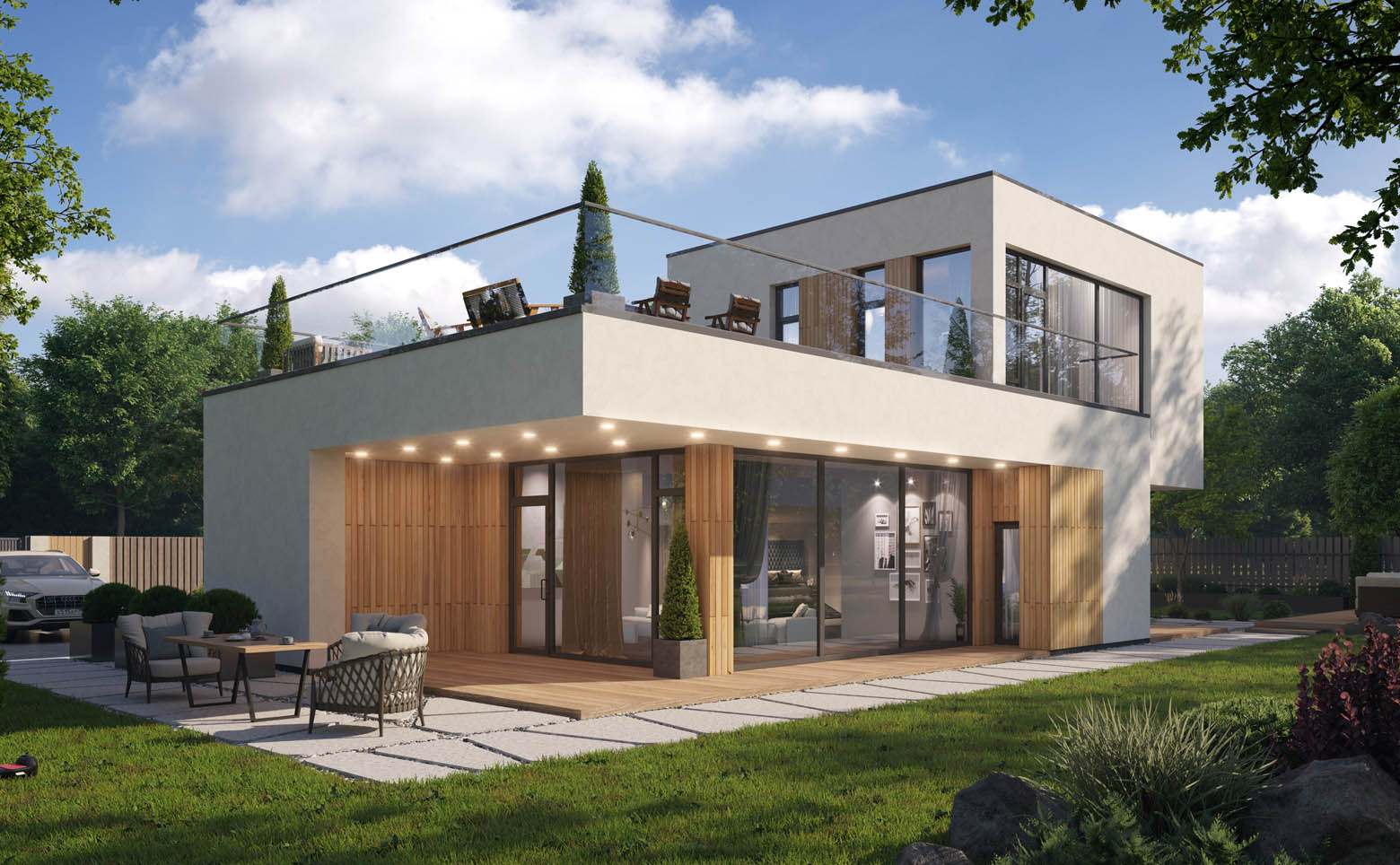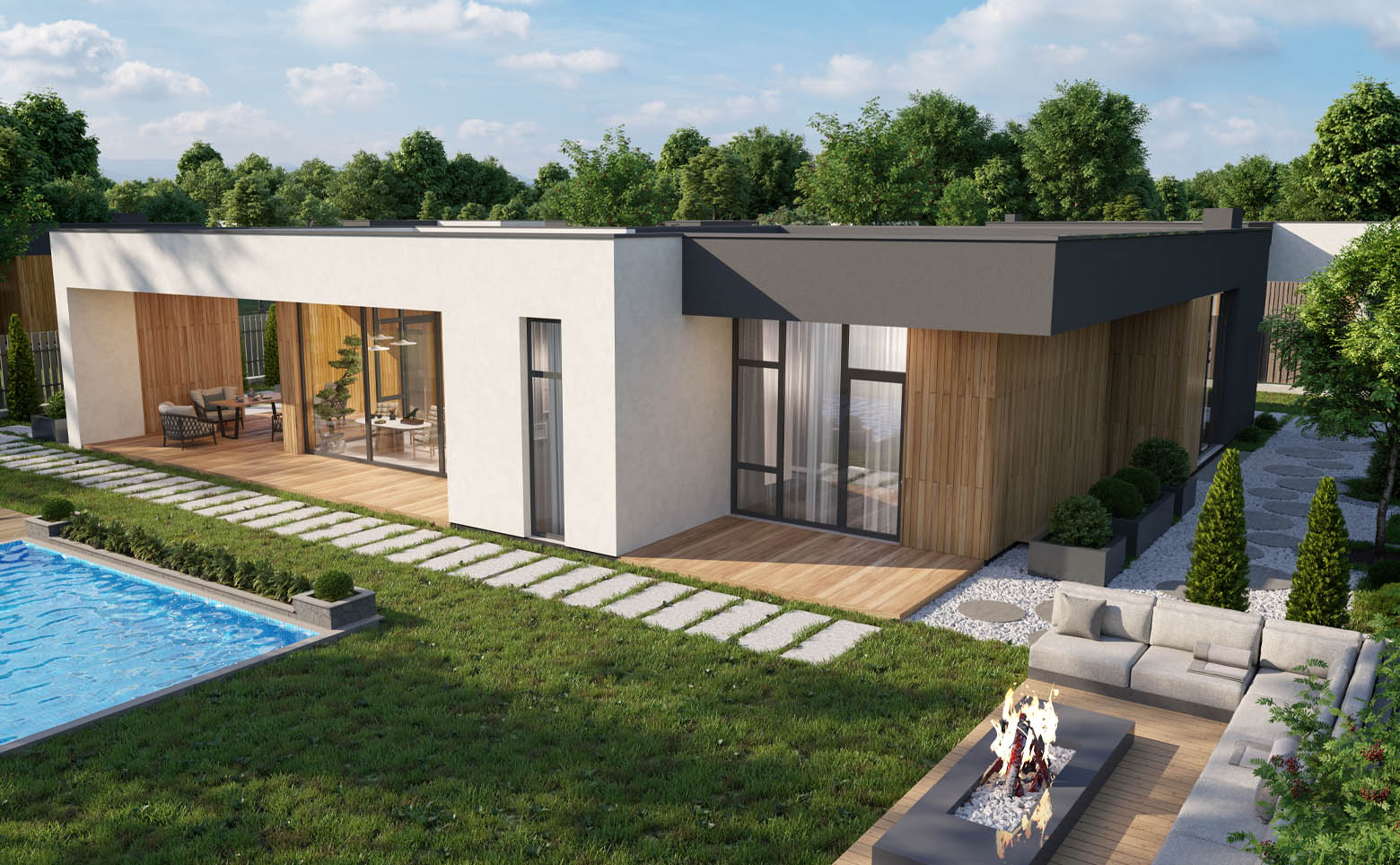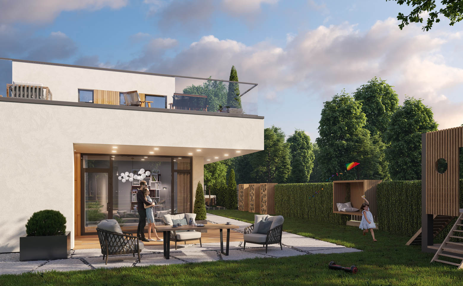В комплексе представлено 5 авторских проектов домов в стиле хай-тек. Предусмотрены коттеджи высотой 1 или 2 этажа от 145 до 317 кв. м с плоскими кровлями, панорамным остеклением и просторными планировками. Доступны дома с видами на горы и лес. Среди планировочных решений мастер-спальня, кухня-гостиная, гардеробная и открытая терраса на кровле. Высота потолков достигает 3,7 м. Дополнительно можно заказать строительство бассейна, бани, ландшафтное благоустройство на участке.