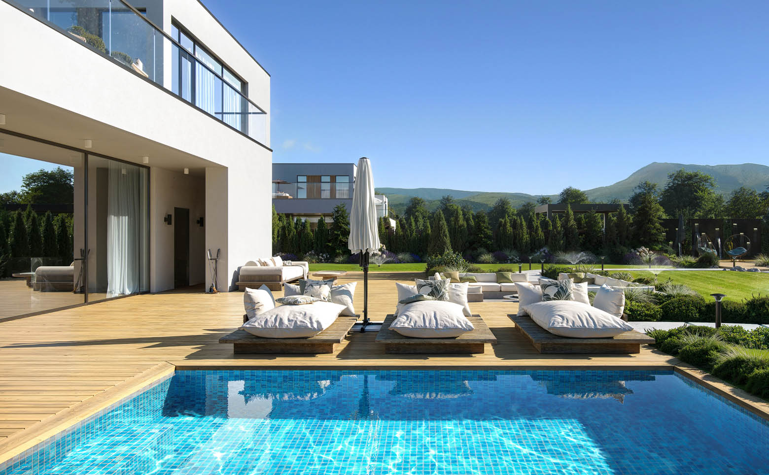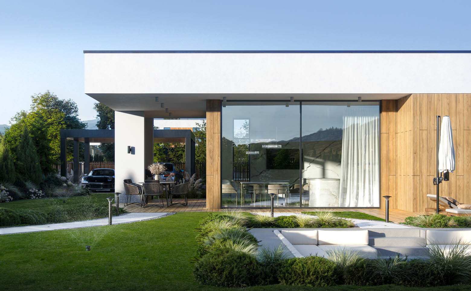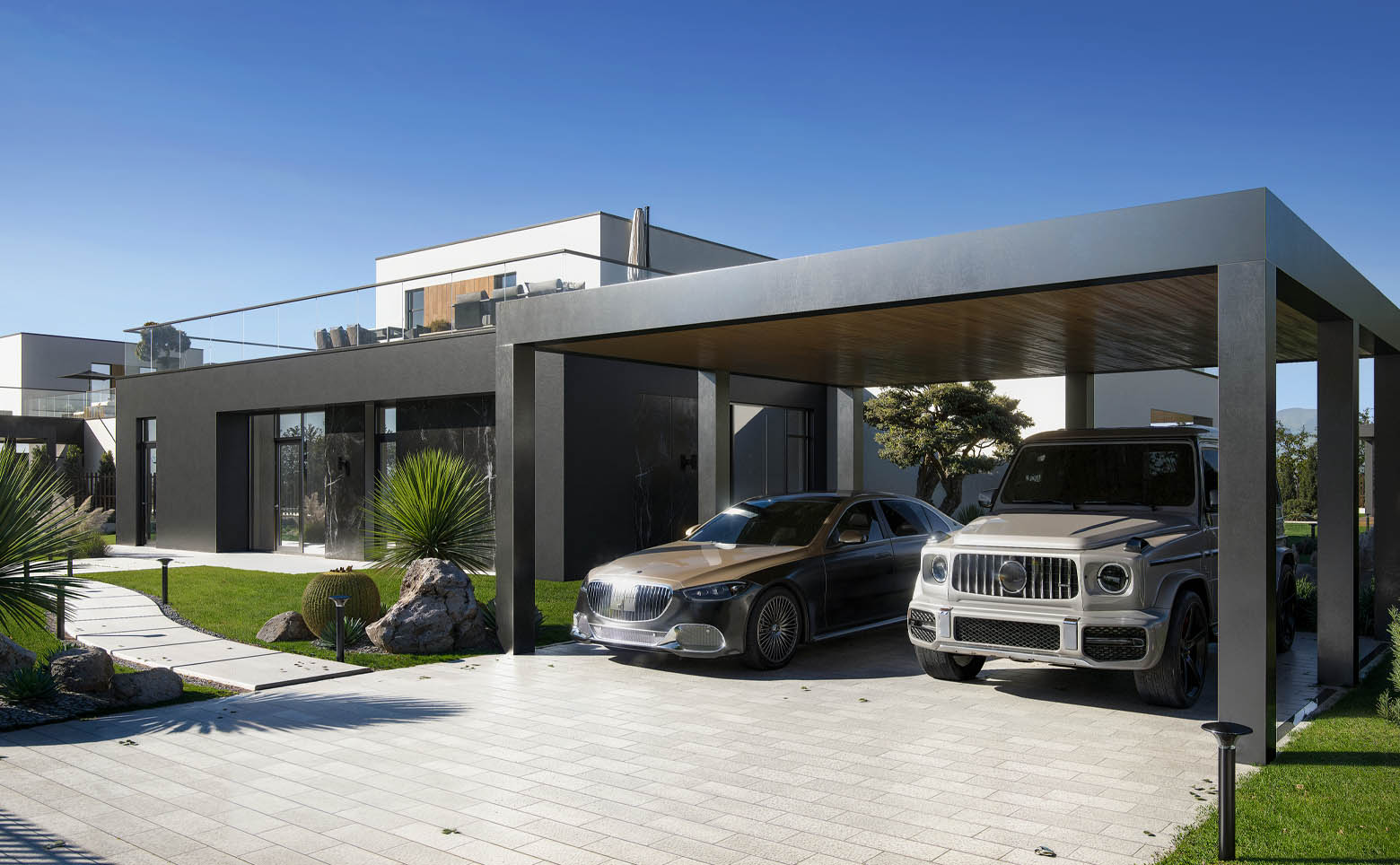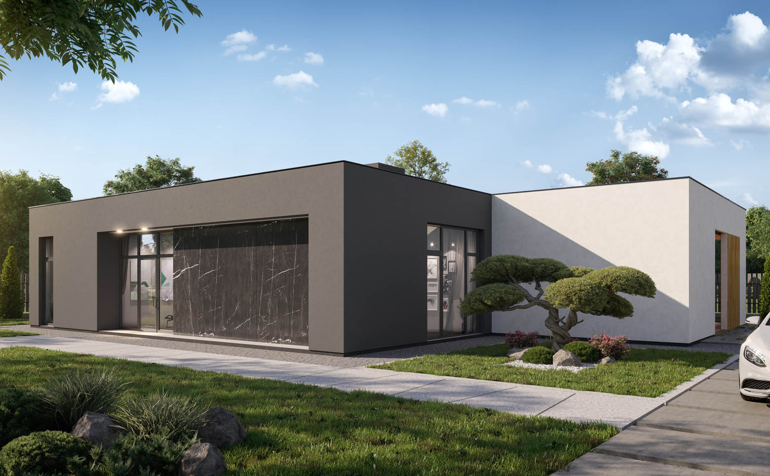 В комплексе представлено 5 авторских проектов домов в стиле хай-тек. Предусмотрены коттеджи высотой 1 или 2 этажа от 145 до 317 кв. м с плоскими кровлями, панорамным остеклением и просторными планировками. Доступны дома с видами на горы и лес. Среди планировочных решений мастер-спальня, кухня-гостиная, гардеробная и открытая терраса на кровле. Высота потолков достигает 3,7 м. Дополнительно можно заказать строительство бассейна, бани, ландшафтное благоустройство на участке.