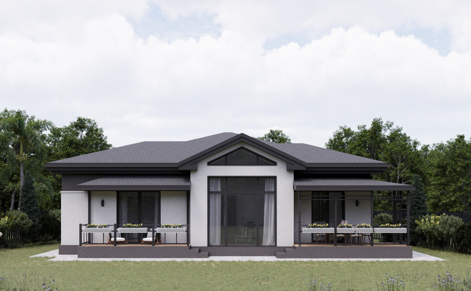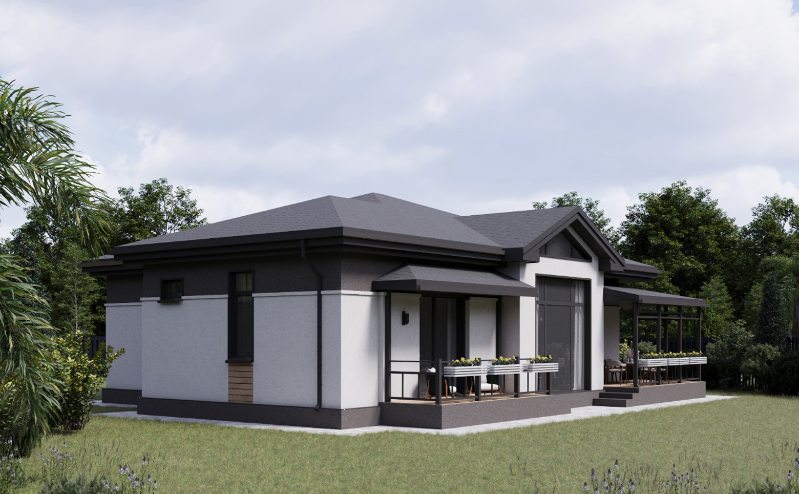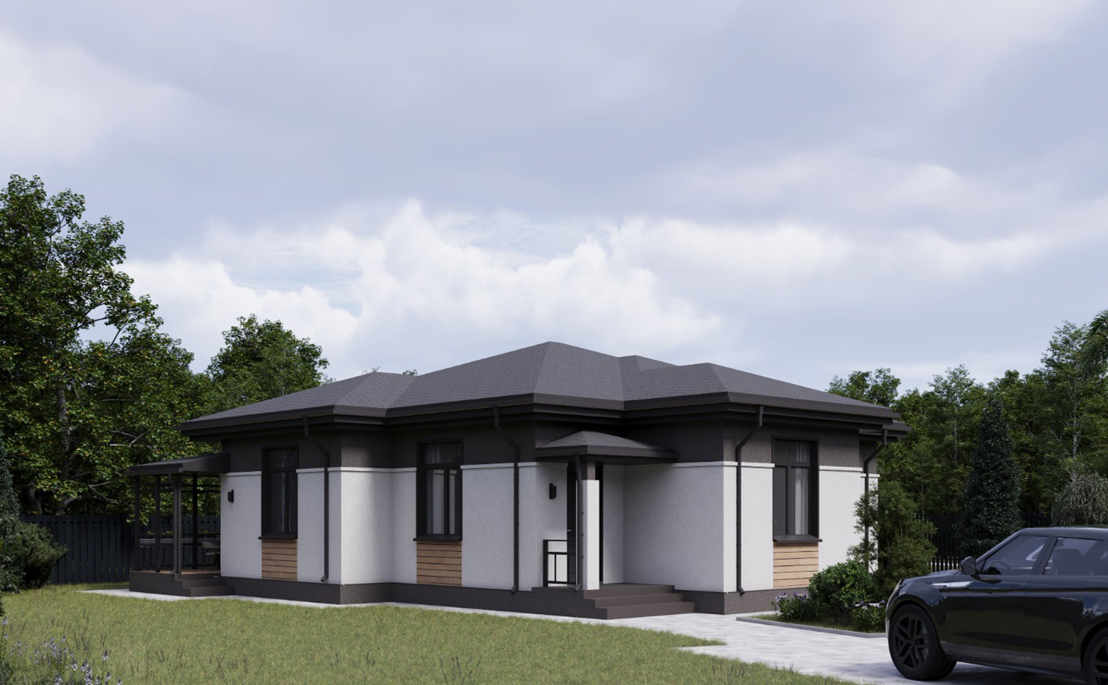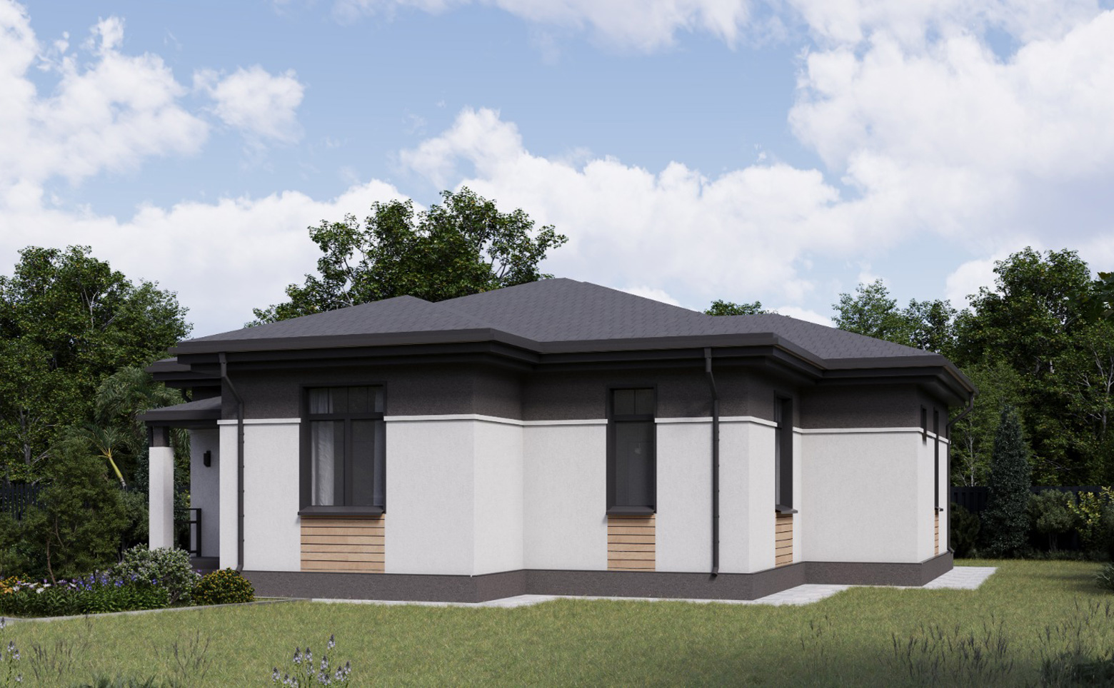 Проект представлен 1 одноэтажным коттеджем в классическом стиле. Дом возводится по монолитной технологии с заполнением стен керамзитоблоком; фасады выполнены декоративной штукатуркой с элементами керамогранитной плитки. Участок относится к ИЖС, предусмотрено оформление дома и земли в собственность с возможностью постоянной регистрации.