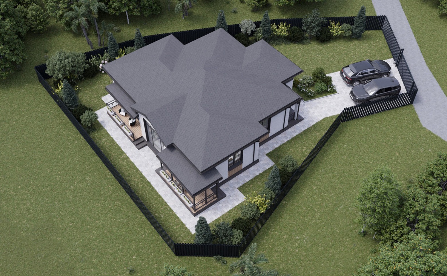 Размер участка составляет 6 соток. Коттедж имеет площадь 150 кв. м, высота потолков — 3,4 м. Планировка свободная, предусмотрены увеличенные и панорамные окна, в части помещений — виды на реку. Дом передается без отделки. Участок предоставляется только при заключении подряда с застройщиком, строительство возможно только по данному проекту дома.