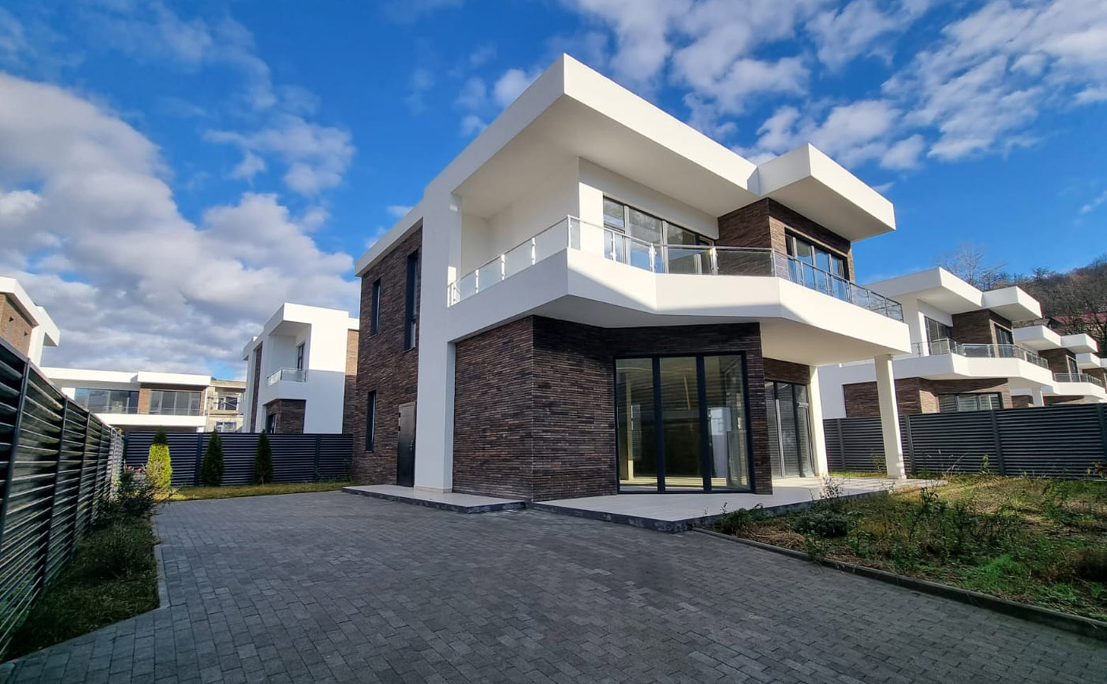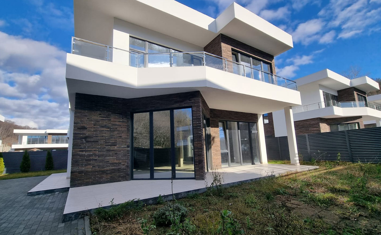 В проекте предлагаются двухэтажные коттеджи площадью 220 кв. м. Высота потолков составляет 3,4 м. Установлены панорамные окна и окна в ванных комнатах. Дома передаются без отделки, дополнительно можно заказать чистовую отделку.