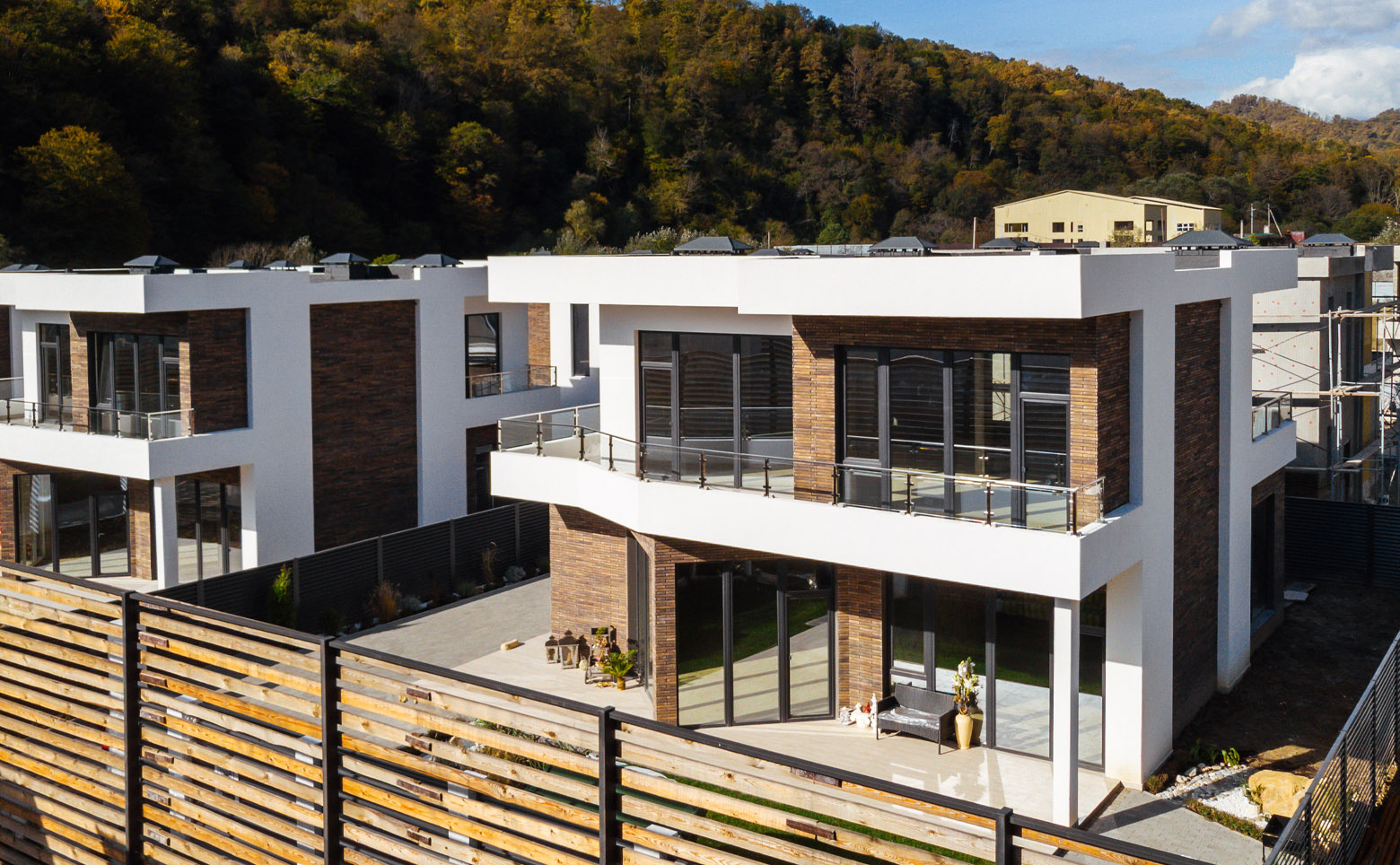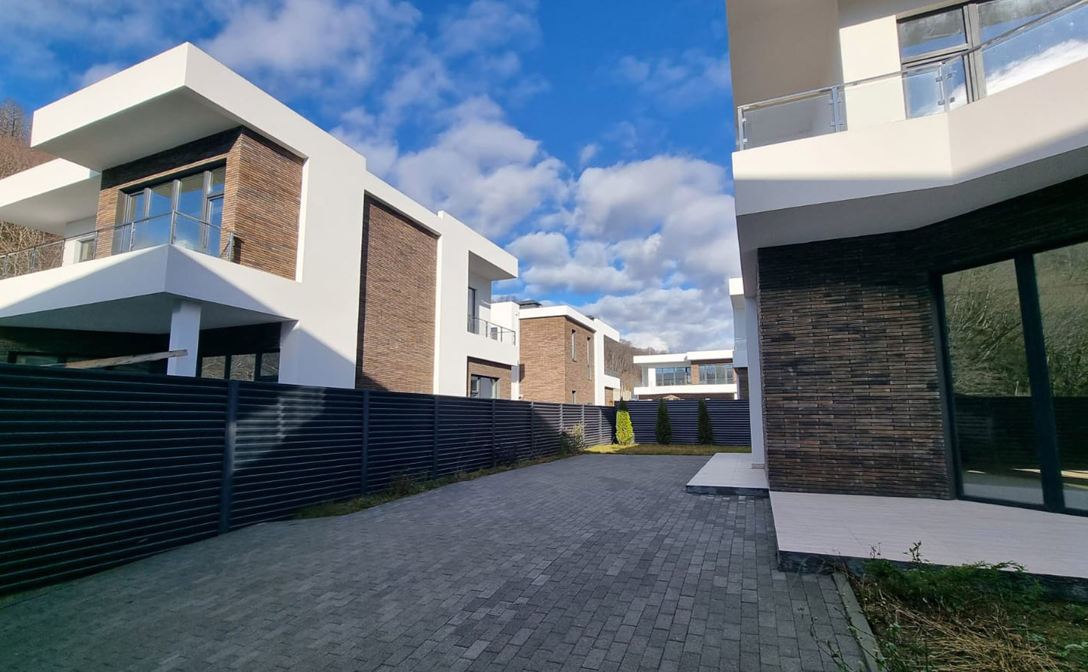 К каждому дому подведены центральные коммуникации: водоснабжение, газопровод, канализация и электричество мощностью 15 кВт. Предусмотрен оптоволоконный интернет. Территория закрыта от посторонних и оснащена видеонаблюдением и охраной. Для жителей обустроена зона отдыха с беседками.