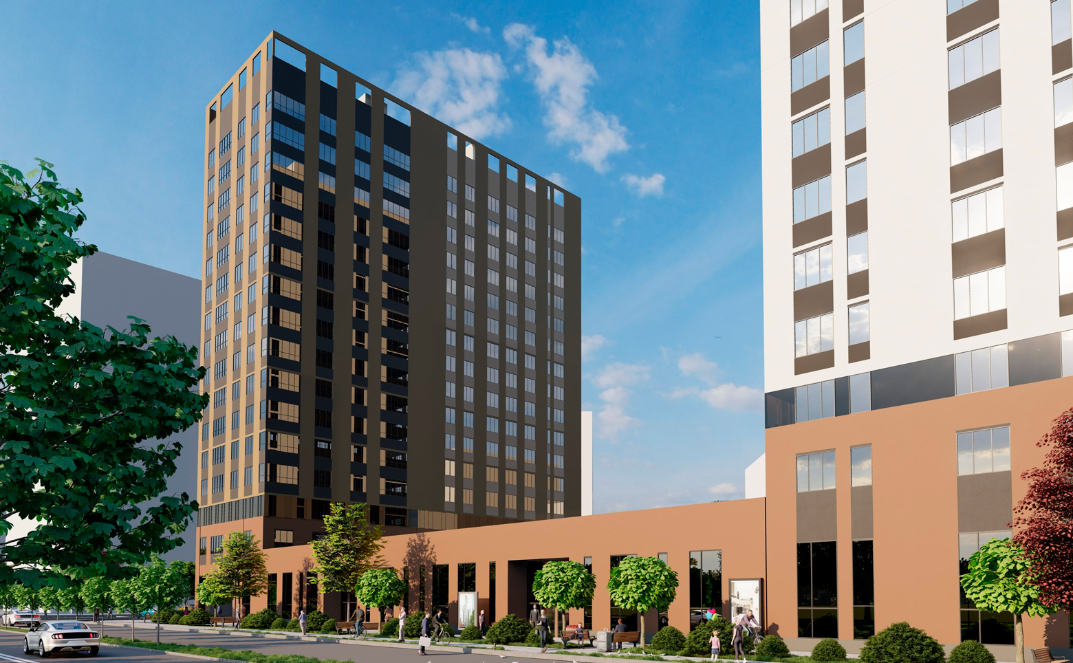 Территория комплекса благоустроена: имеется двор для отдыха, прогулок и активного времяпрепровождения, детские и спортивные площадки. Детский садик и школа искусств во дворе. Для автовладельцев предусмотрен подземный паркинг и стоянка.